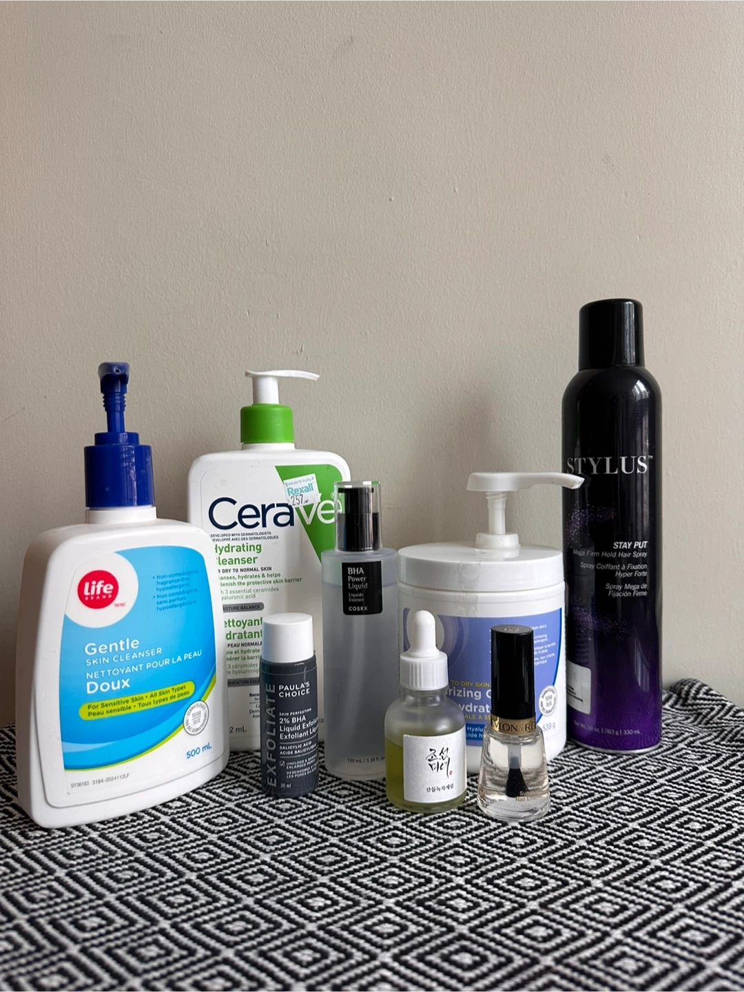 A collection of skincare and hair products including: - Life Gentle Skin Cleanser - Rexall Cerave Hydrating Cleanser - COSRX BHA Power Liquid - Beauty of Joeson panthenol serum - translucent nail polish - moisturizer cream by Life Brand - Paula's Choice 2% BHA Liquid Exfoliant - Stylus Stay Put Mega Firm Hold Hair Spray Used a couple of times but do not suit me. Everything has more than a half of product. Selling all together Pick up near Yonge and Bloor