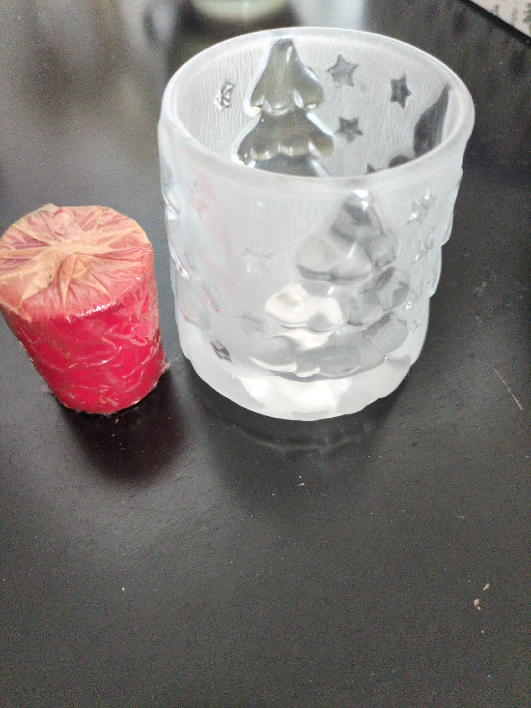 Cute candle holder with a Christmas tree design and a red candle included! Perfect for adding a festive touch to your home this holiday season