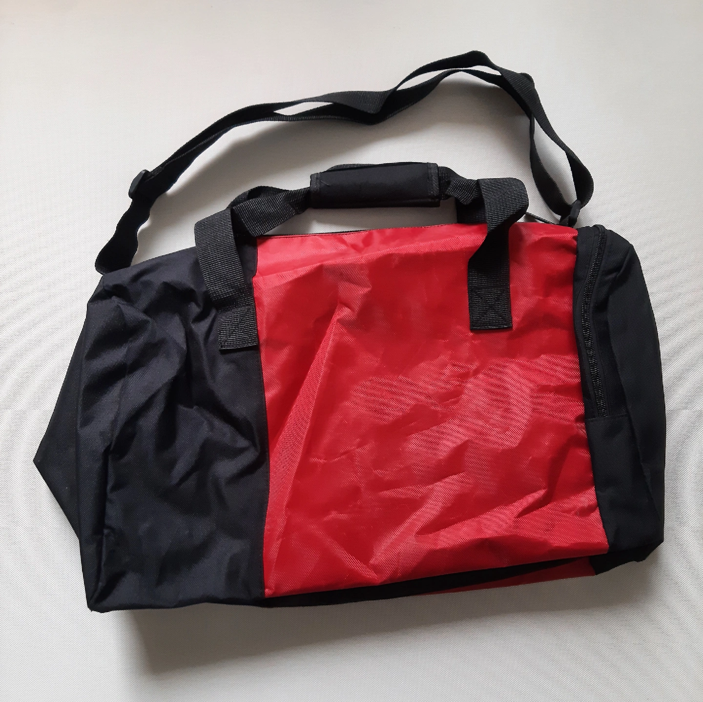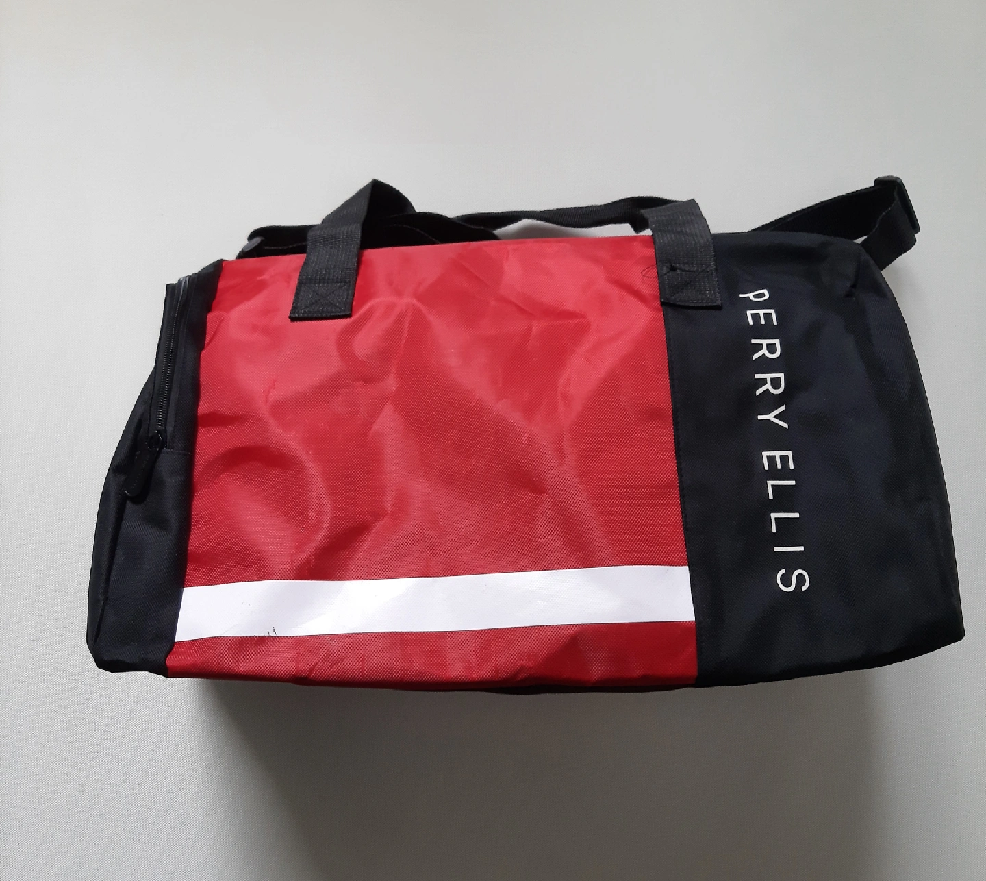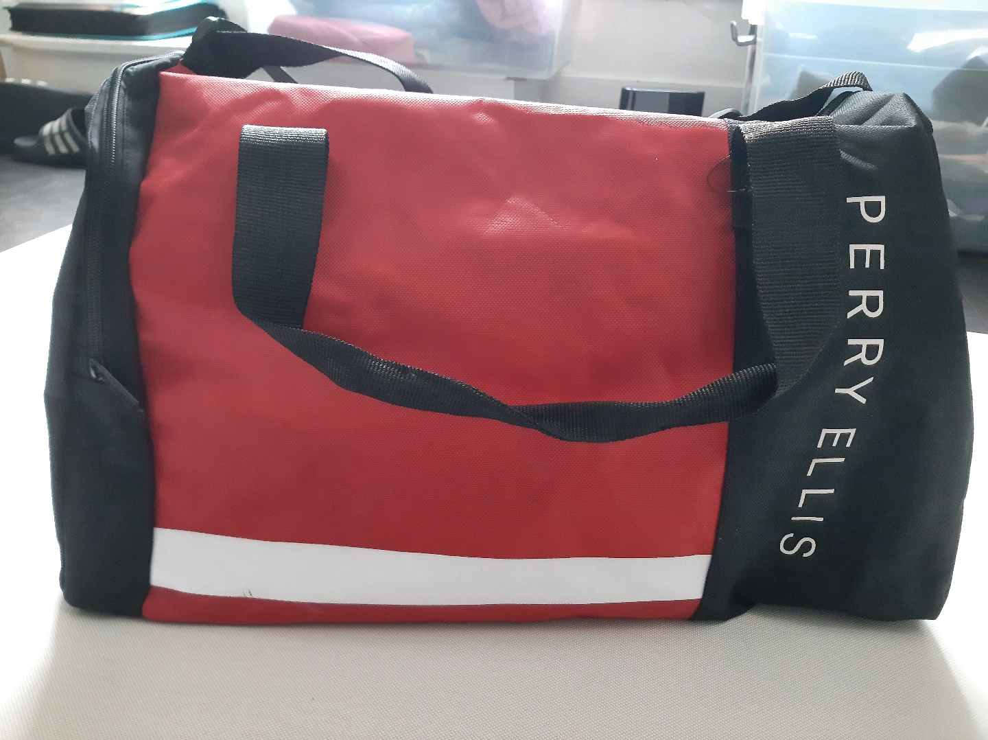 Perry Ellis gym bag in great condition! It's a mix of red and black, perfect for carrying your workout gear or for a weekend getaway. The bag features a shoulder strap and handles for easy carrying. The zipper pull also has the Perry Ellis logo on it!