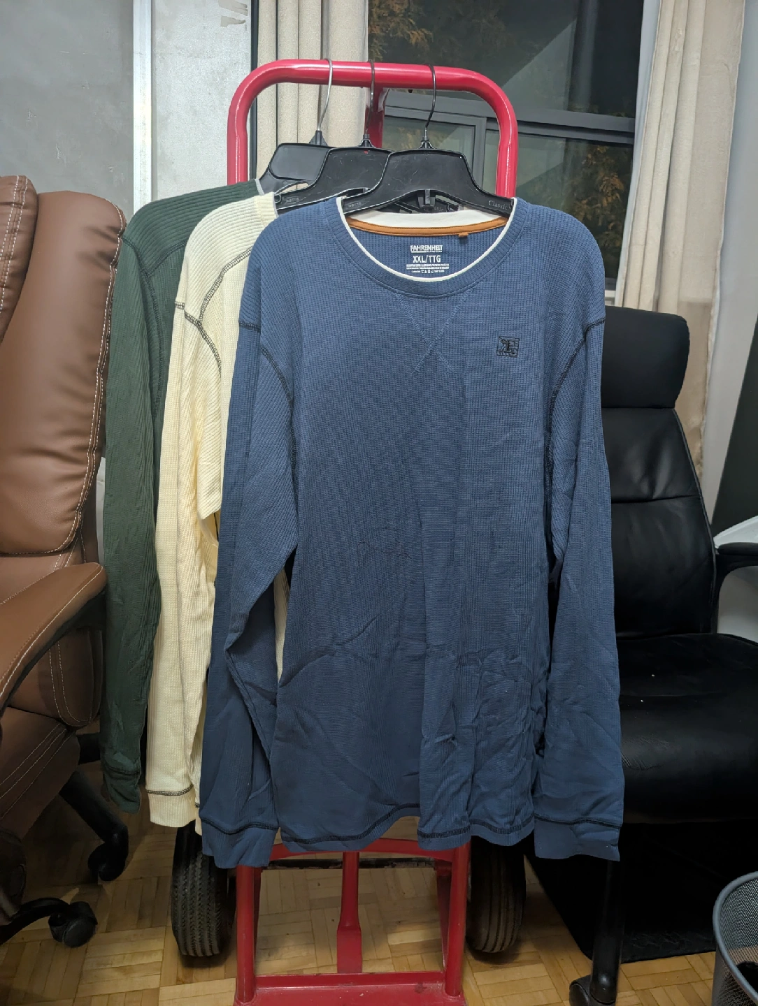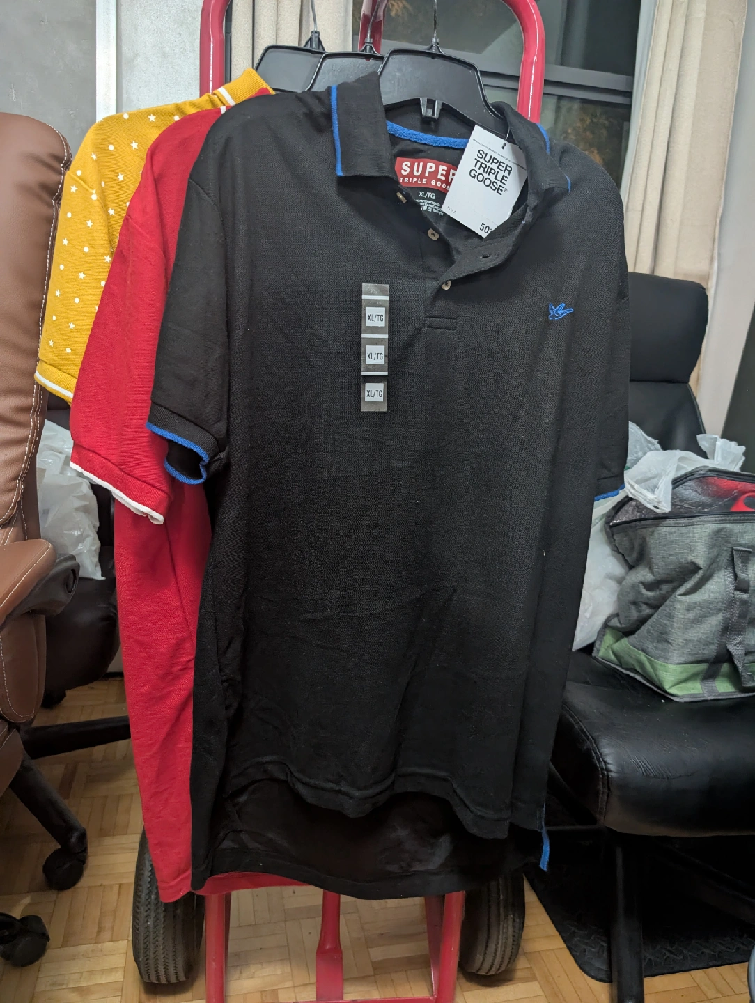 A selection of men's shirts in sizes XL and XXL. Brands include George, Super Triple Goose, and Brooklyn baseball jersies. Perfect for adding some variety to your wardrobe! All items are brand new. We have plenty more, please see other posts! $5 for EACH T-shirt or long sleeve shirt $10 for EACH sweater/hoodie Preference goes to those who want to buy the entire lot of clothing. There are over 500 pieces of clothing. Make me an offer.