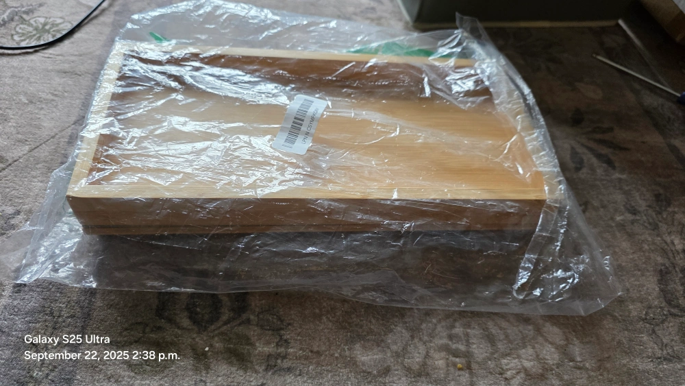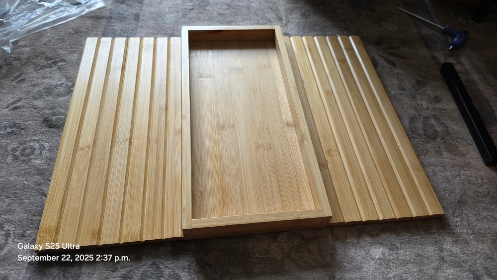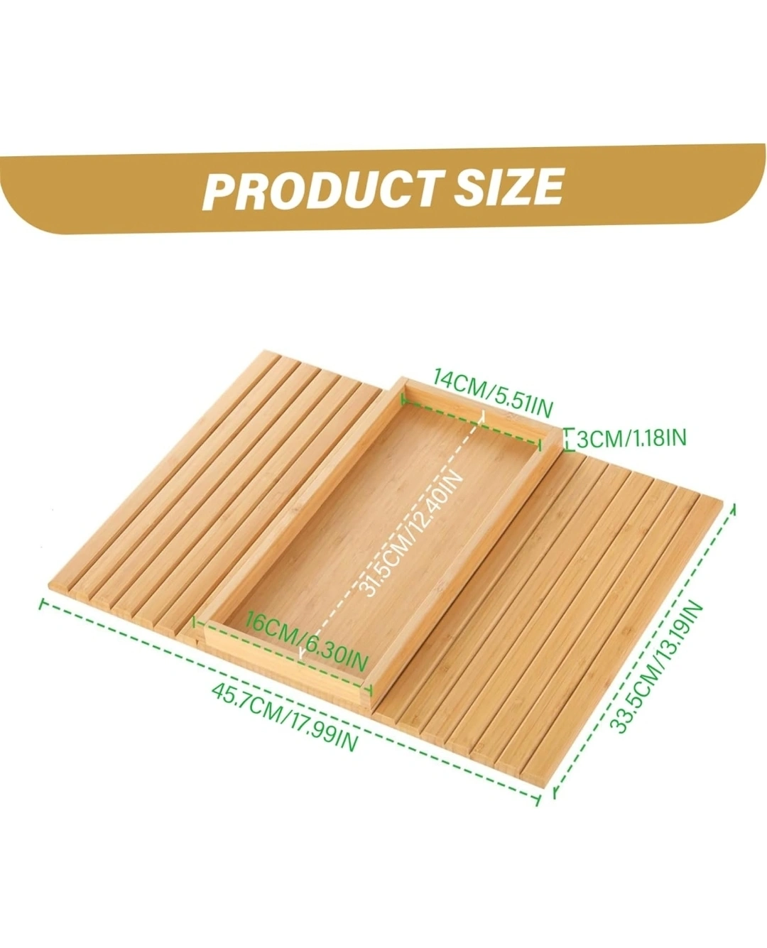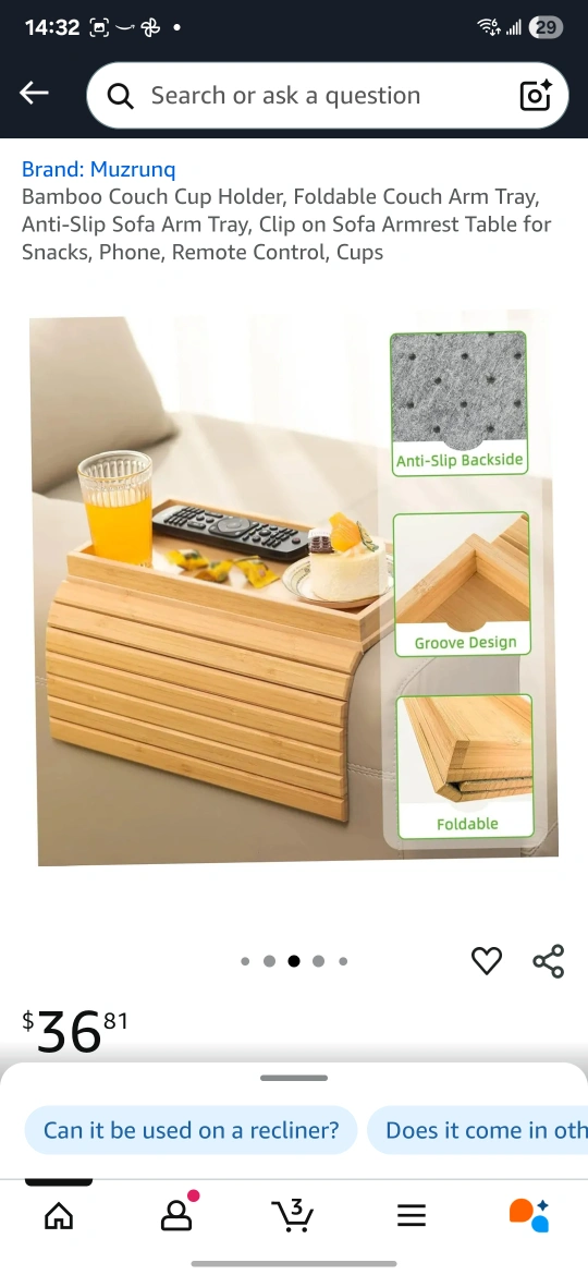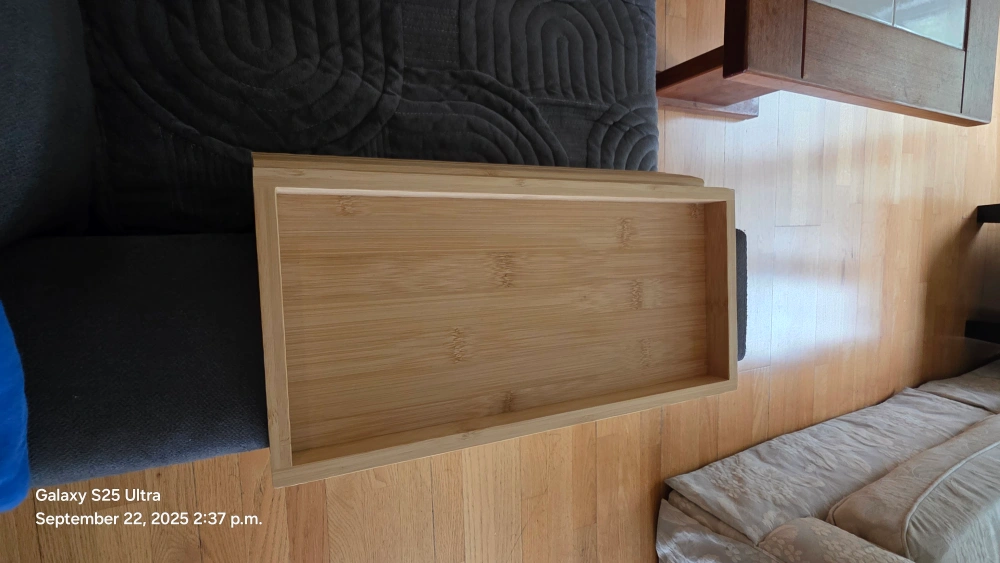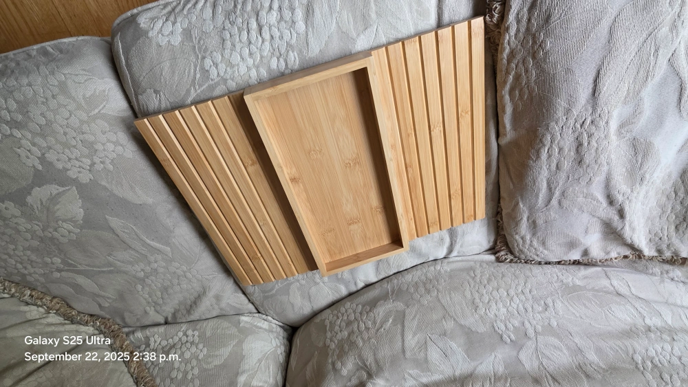 This bamboo couch arm tray is a great addition to any living room! It's foldable and has an anti-slip backside so it stays in place. Perfect for holding snacks, your phone, remote control, or a cup of tea while you relax on the couch. It measures 45.7cm x 33.5cm when open.