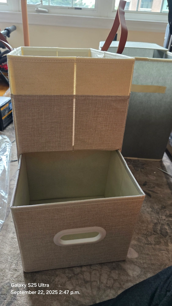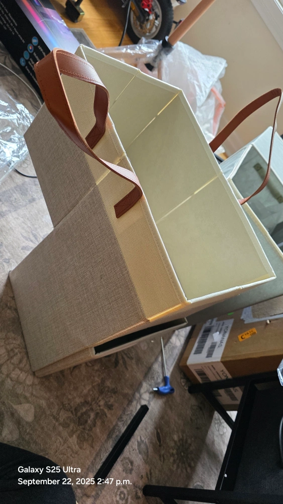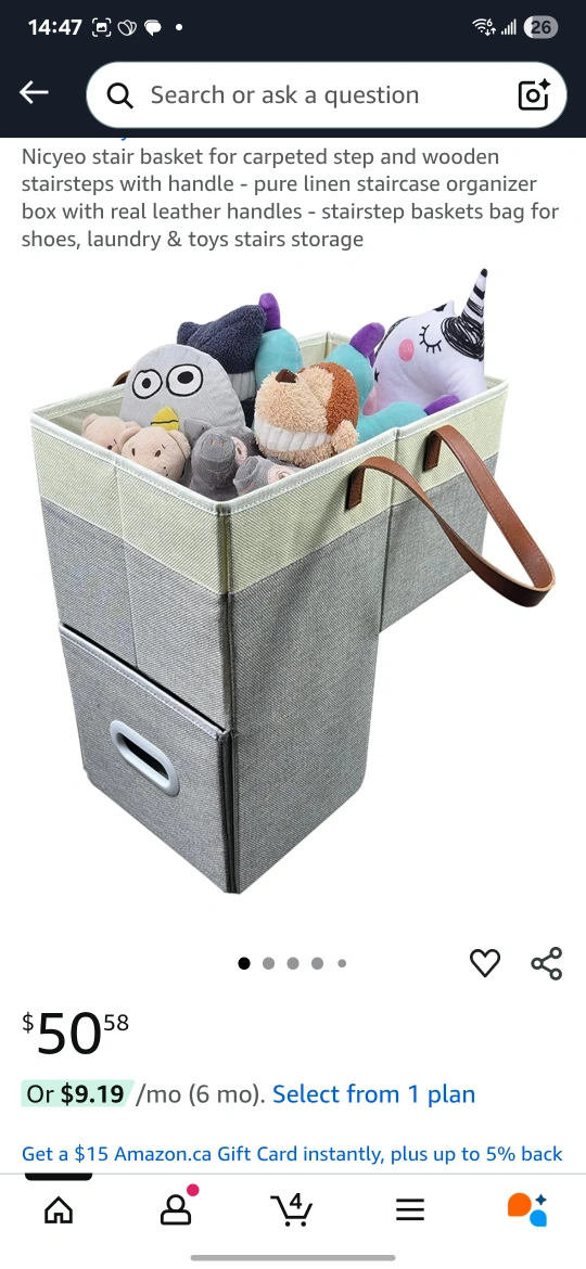 Nicyeo stair basket organizer box with real leather handles. It's a pure linen staircase organizer with a stair-step basket bag for shoes, laundry, and toys stairs storage. The dimensions are 16 inches high, 16 inches wide and 10 inches deep. Retails for $50.58