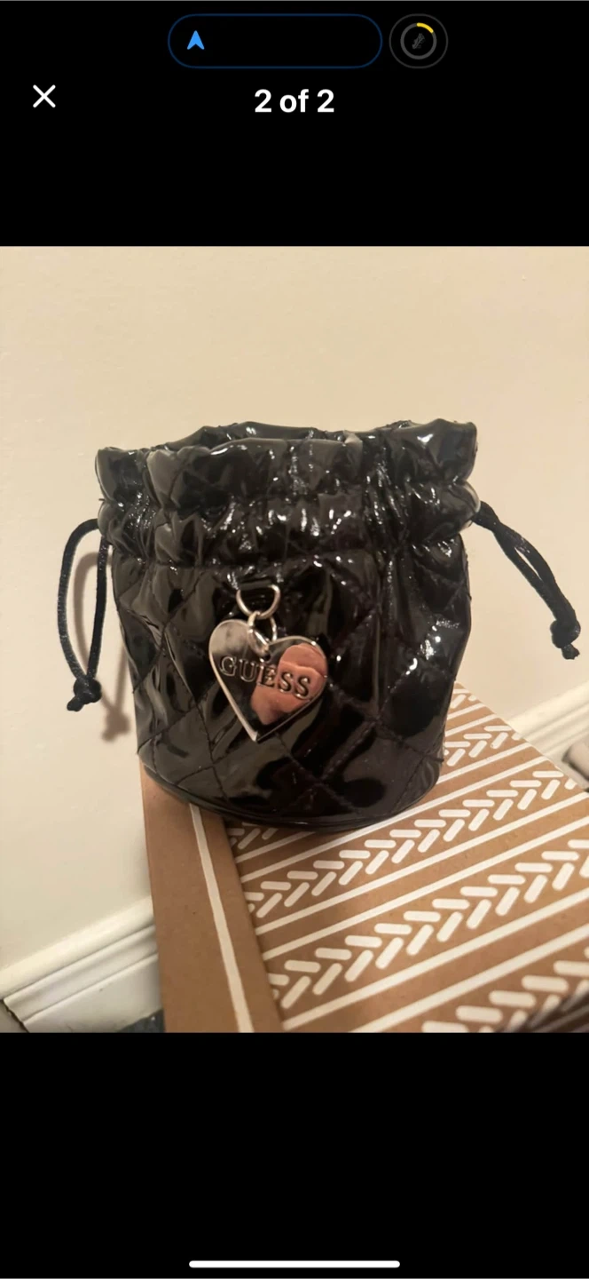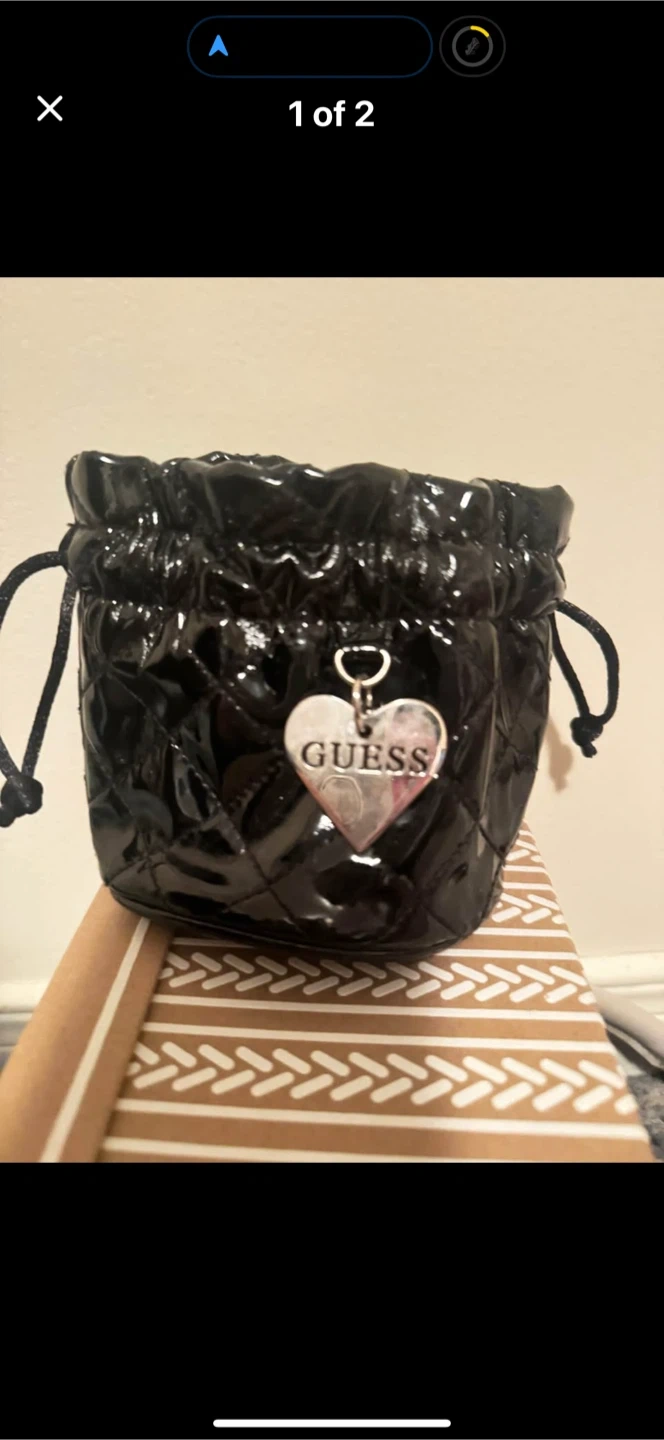 Selling a cute Guess black quilted drawstring pouch. It features a heart-shaped Guess charm. Perfect for carrying small items!
