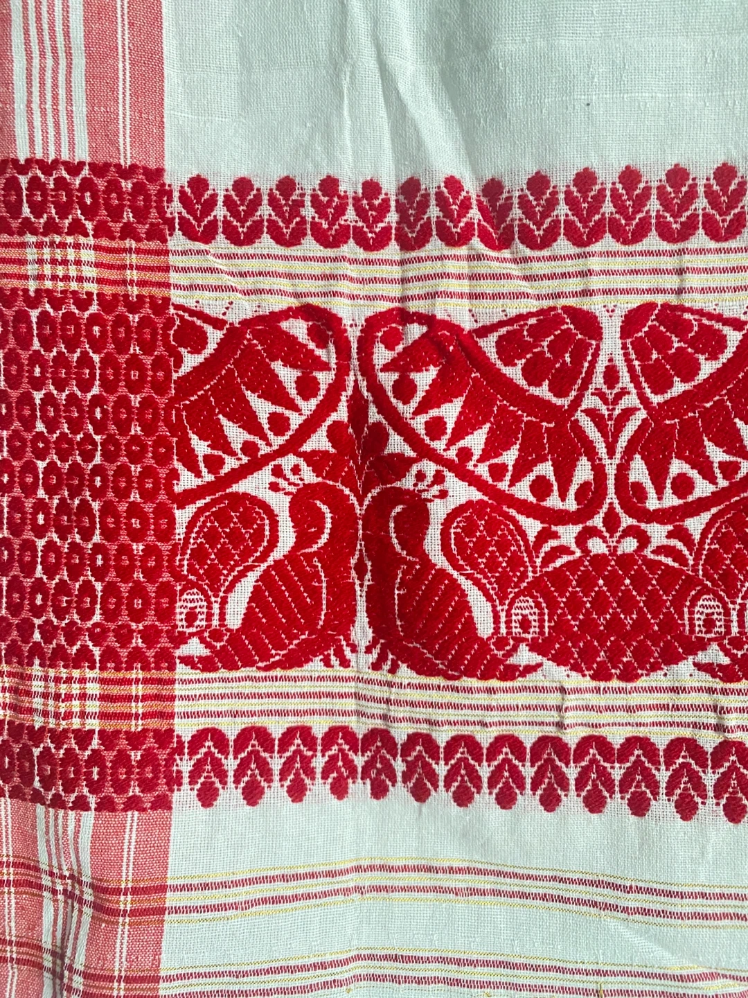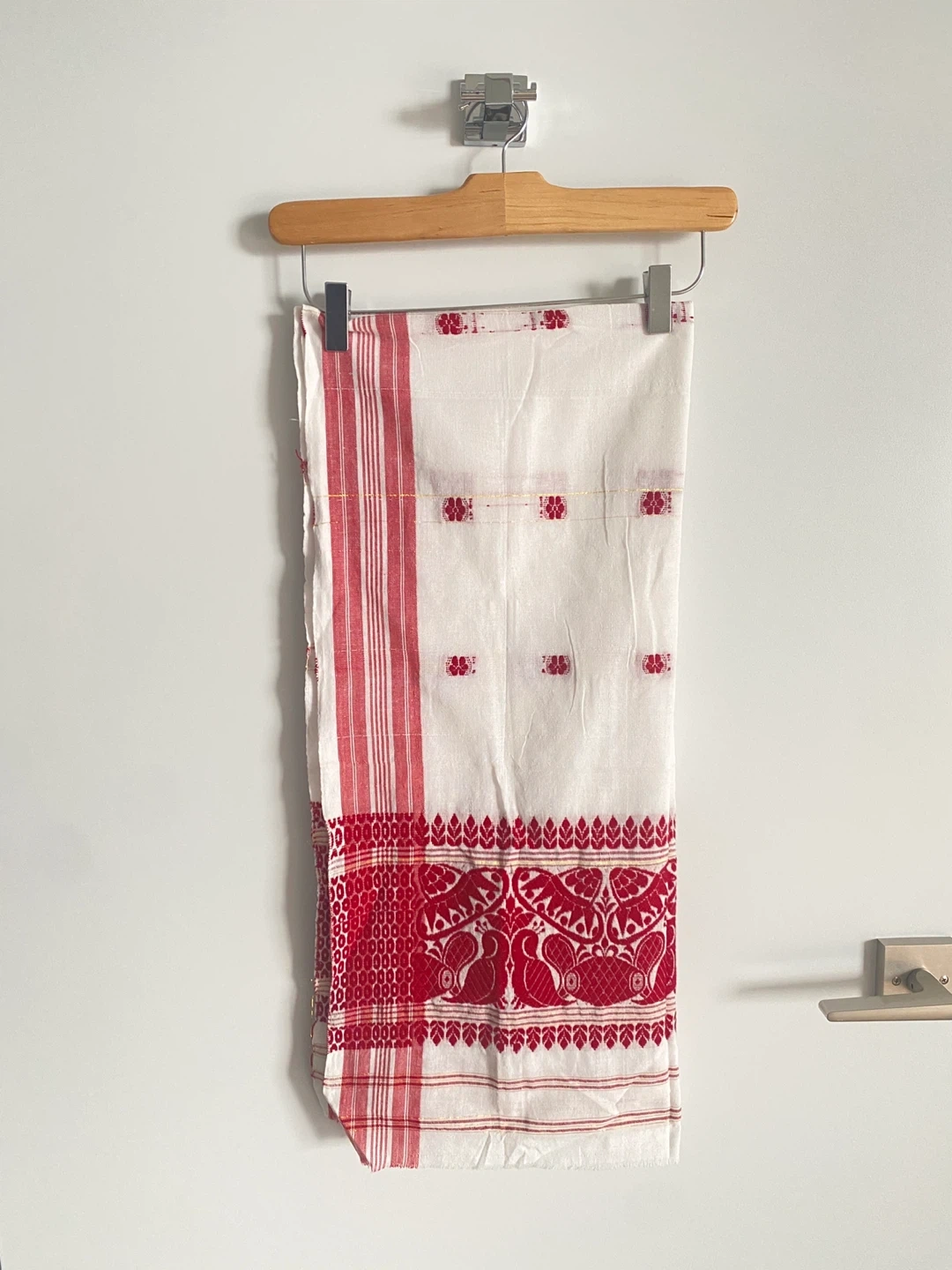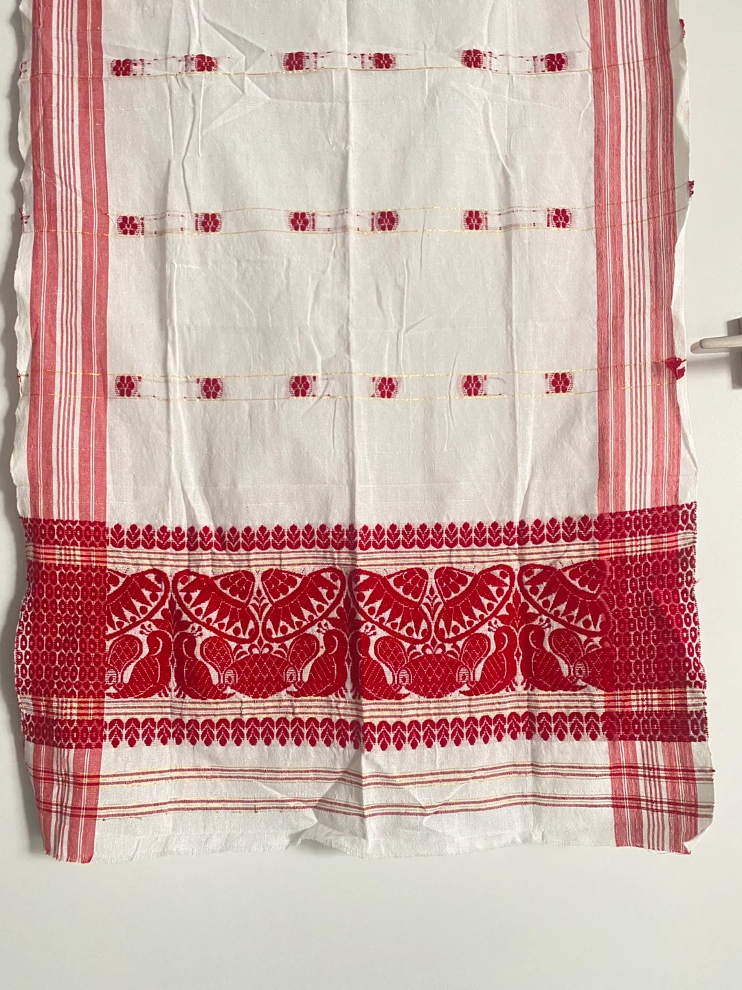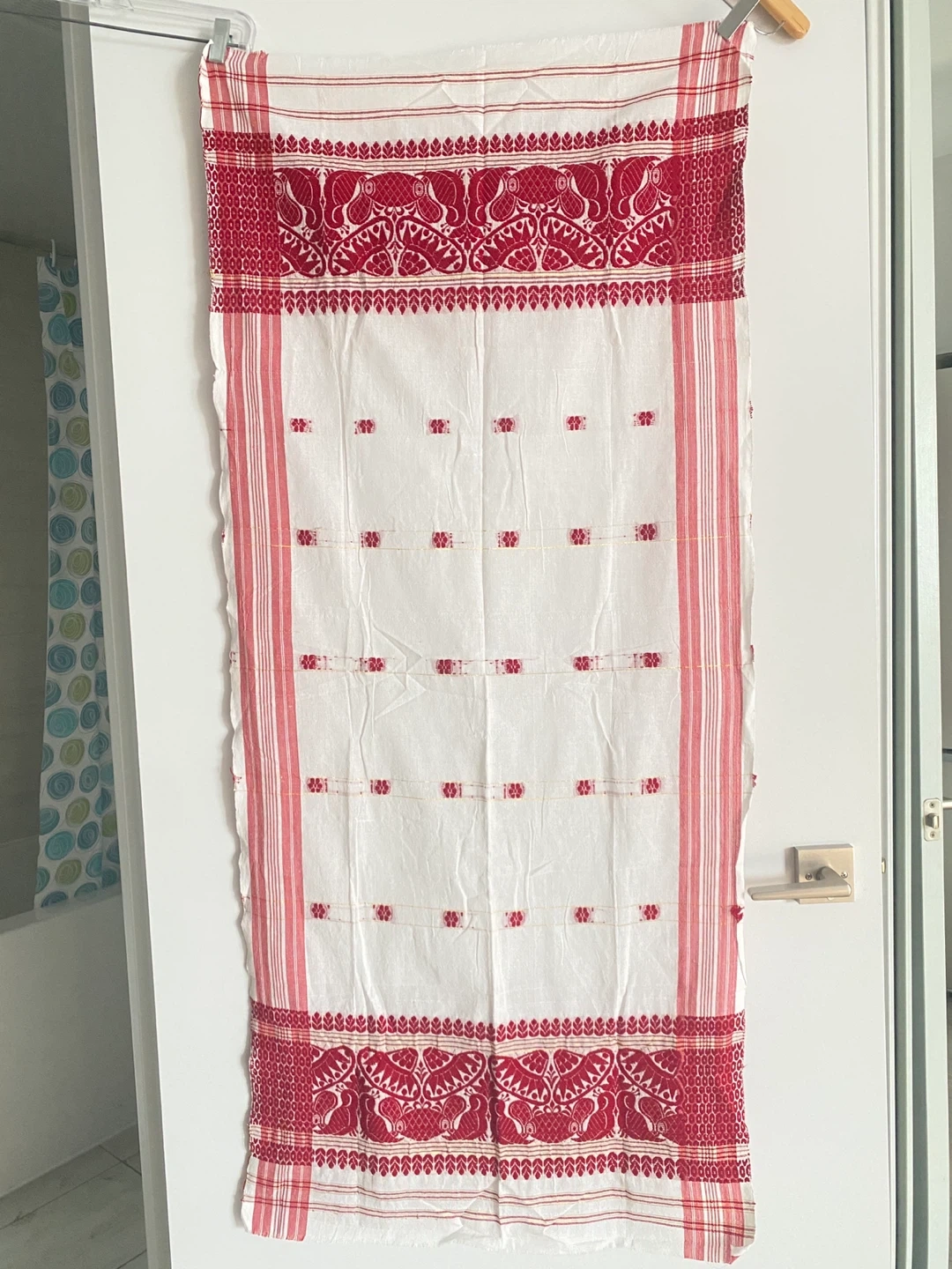 Bring home a piece of Assamese heritage with this authentic Gamosa (also known as Gamusa or Gamocha) from Assam, India! Its considered one of the most ancient living textile traditions of India dating all the way back to 12th century! It is hand and leg woven by traditional artisans with love and is considered a symbol of respect , love and pride. Its is made out of cotton fabric, and has beautiful intricate peacock and flower motifs woven by hand and leg by local artisans with great detail and precision. Can be used as scarf, headwrap/bandana, home decor, face cloth. You can also turn it into a cute summer top, its made out of cotton so very light weight and breathable! ❤Check out my other listings for great deals!