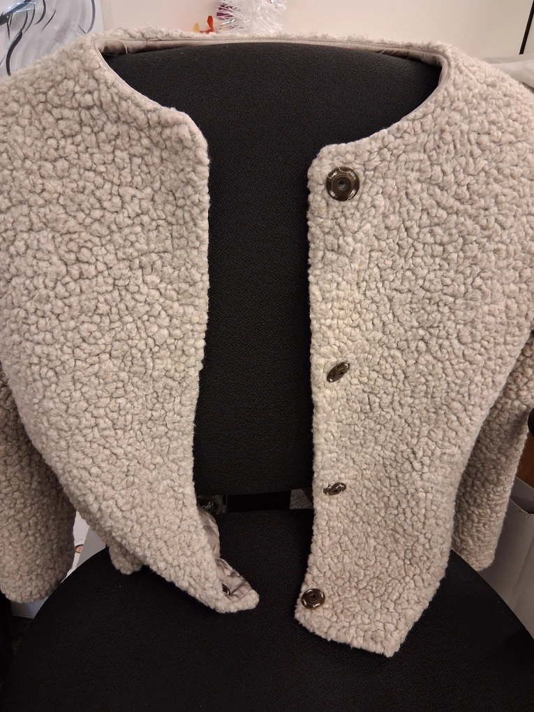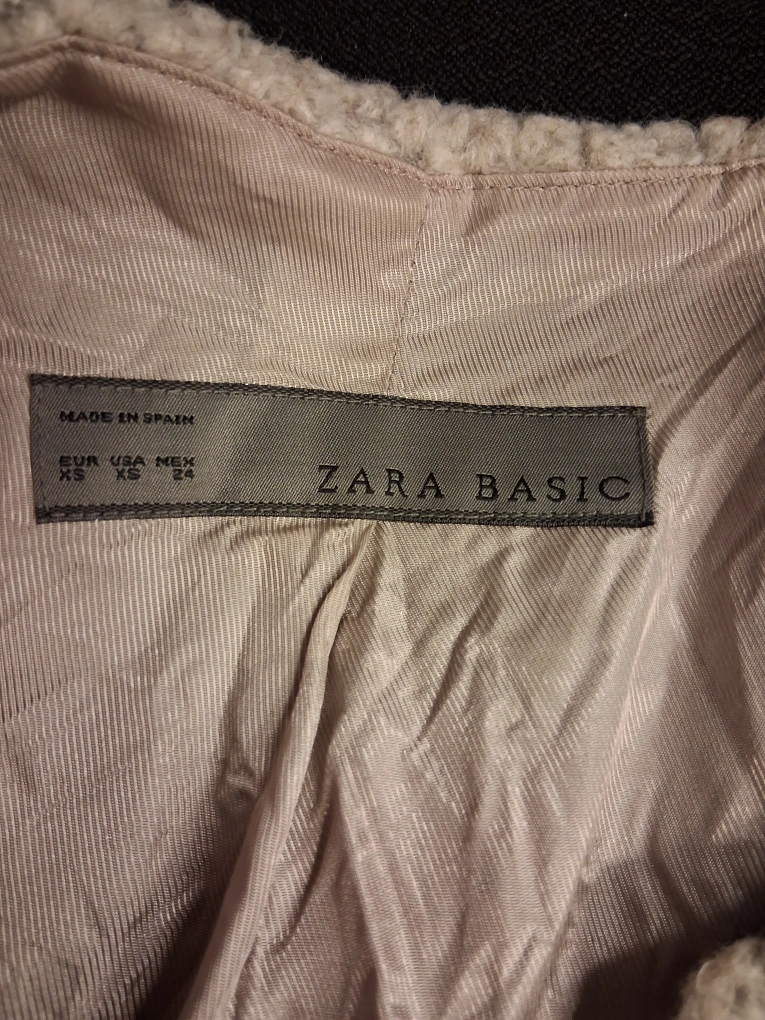 Here's a cute Zara Basic jacket in size XS! The outer shell is made of 45% acrylic, 40% wool, and 15% polyester. The lining is 100% acetate. It's in great condition and ready for a new home