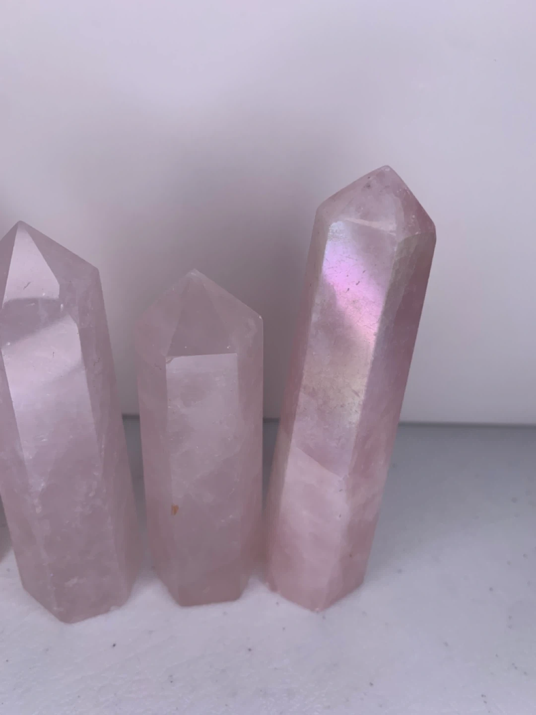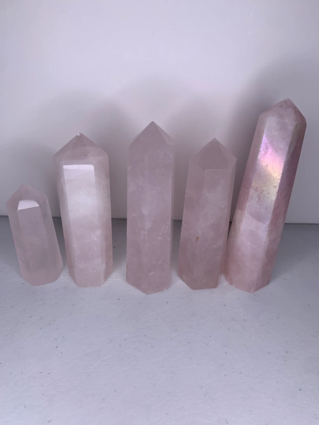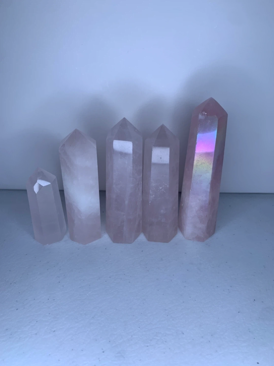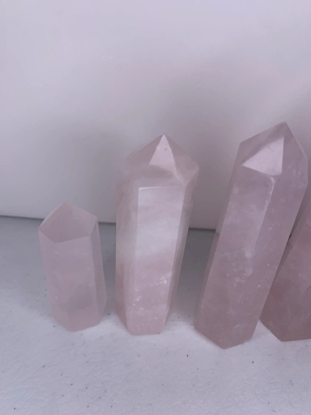 Selling a collection of rose quartz crystal points. These are perfect for adding a touch of zen to your space or for your crystal healing practices. They vary in size and have a lovely soft pink hue. A beautiful addition to any collection