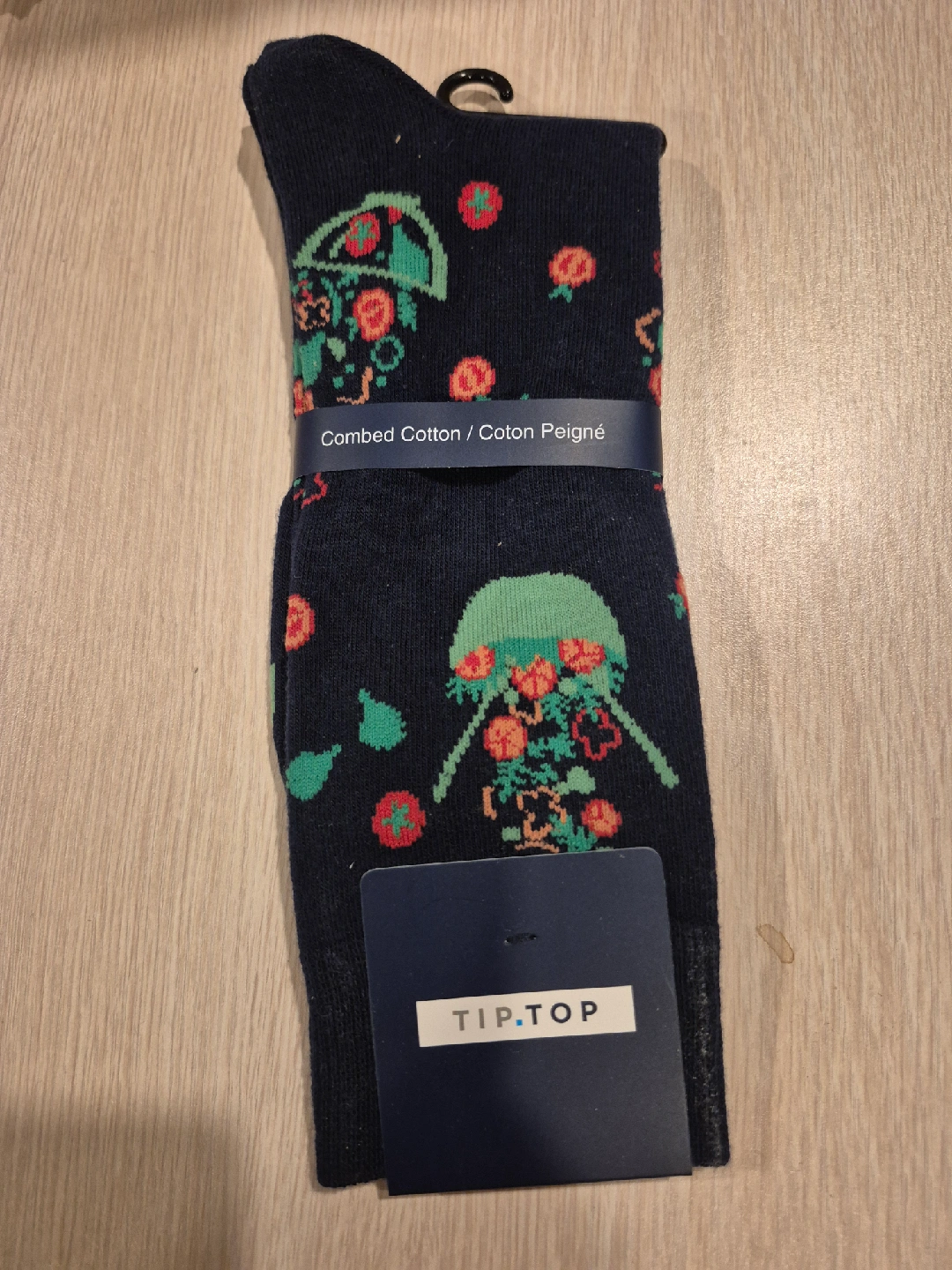 Brand new TIP.TOP socks in navy with a fun floral and mushroom pattern! These socks are made from combed cotton, making them super comfy. Size O/S - T/U.