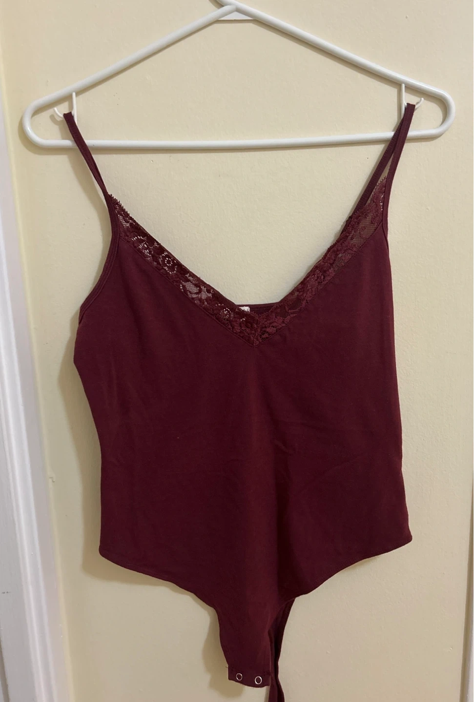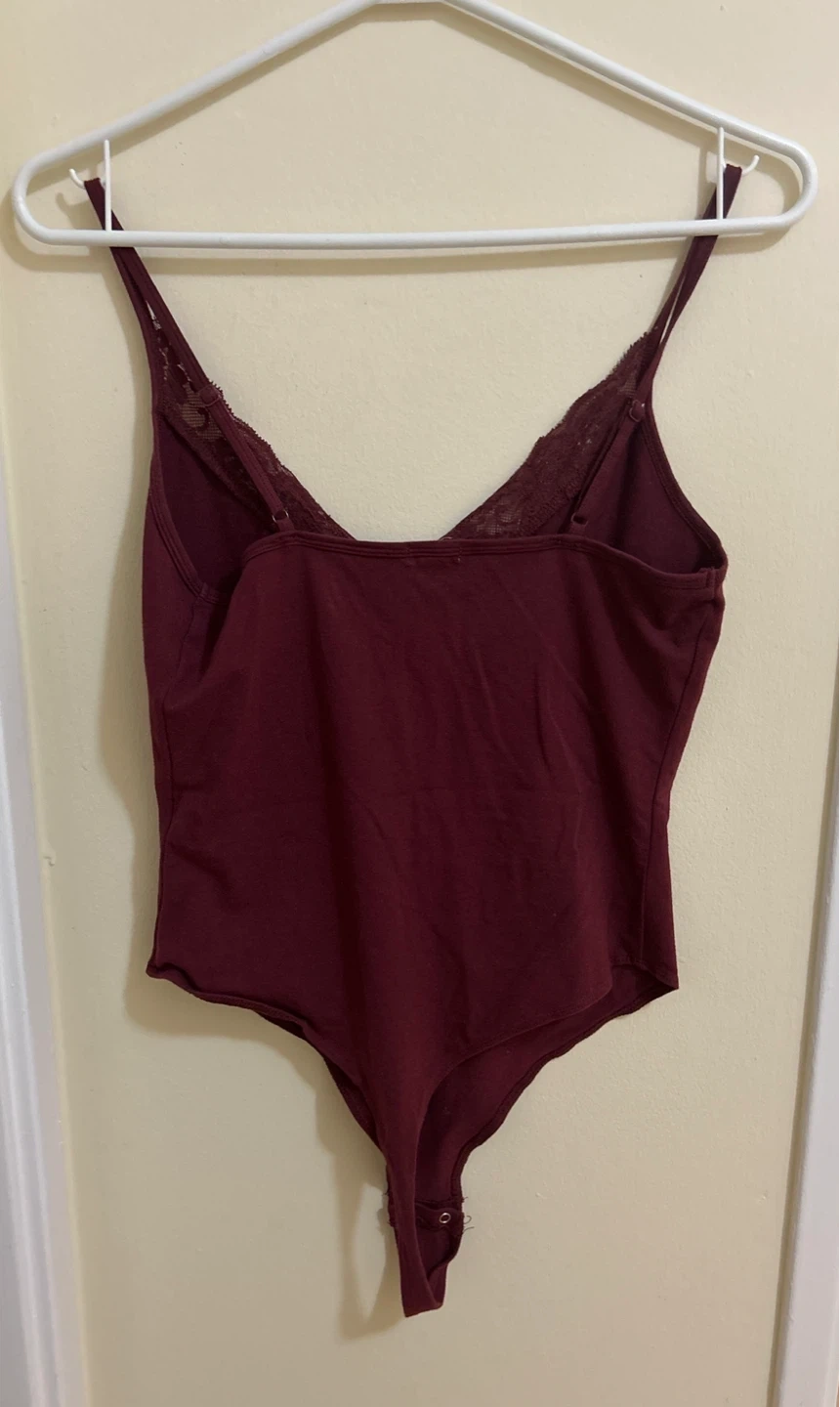 Selling a Garage burgundy bodysuit with a delicate lace trim! It's in great condition and a size medium. The colour is a beautiful deep burgundy, perfect for layering or wearing on its own
