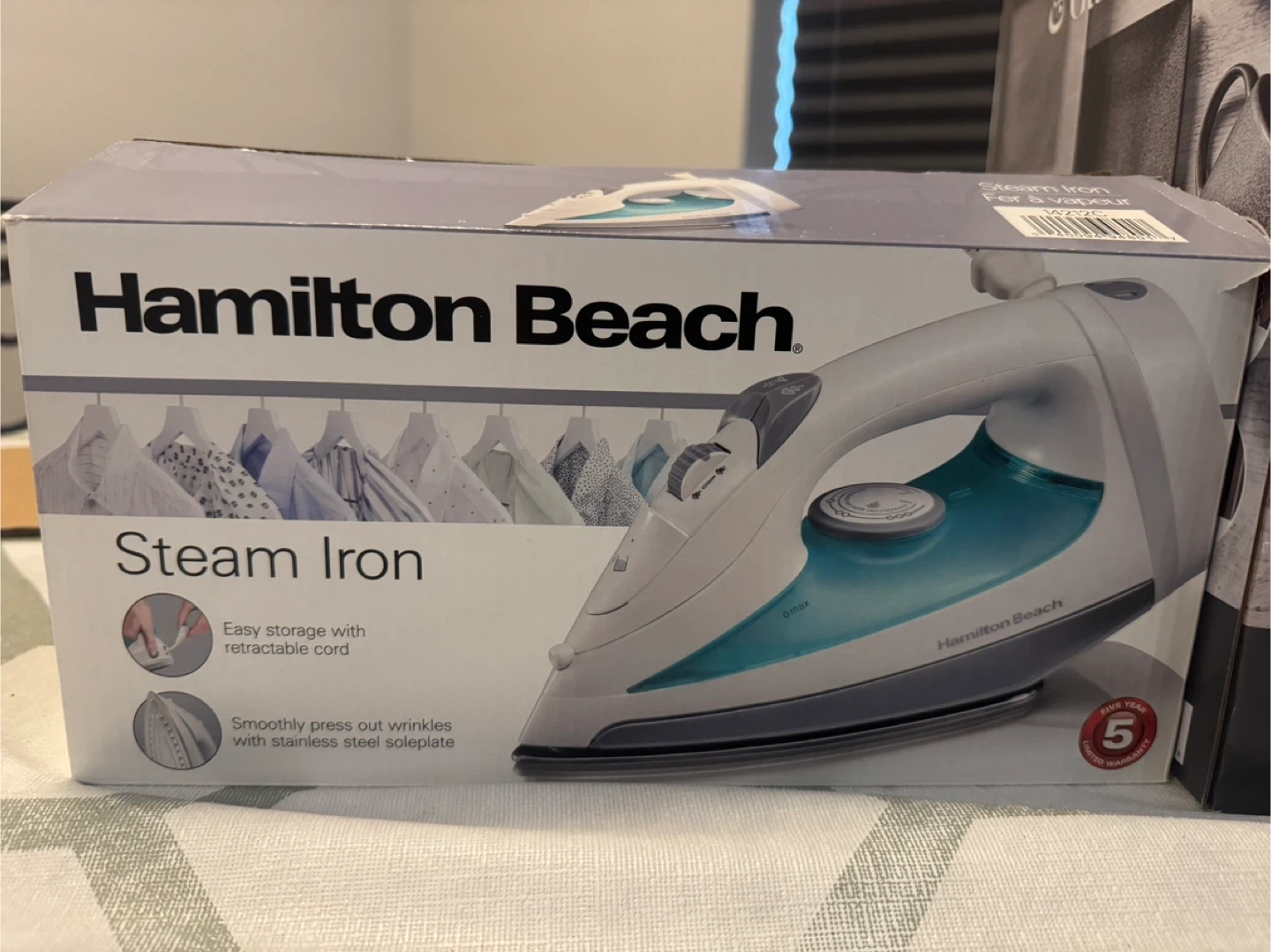 Selling a Hamilton Beach steam iron that's in excellent condition! It features easy storage with a retractable cord and smoothly presses out wrinkles with its stainless steel soleplate. The box is included
