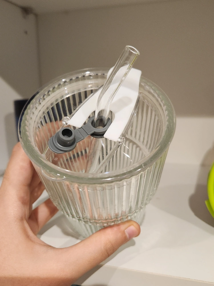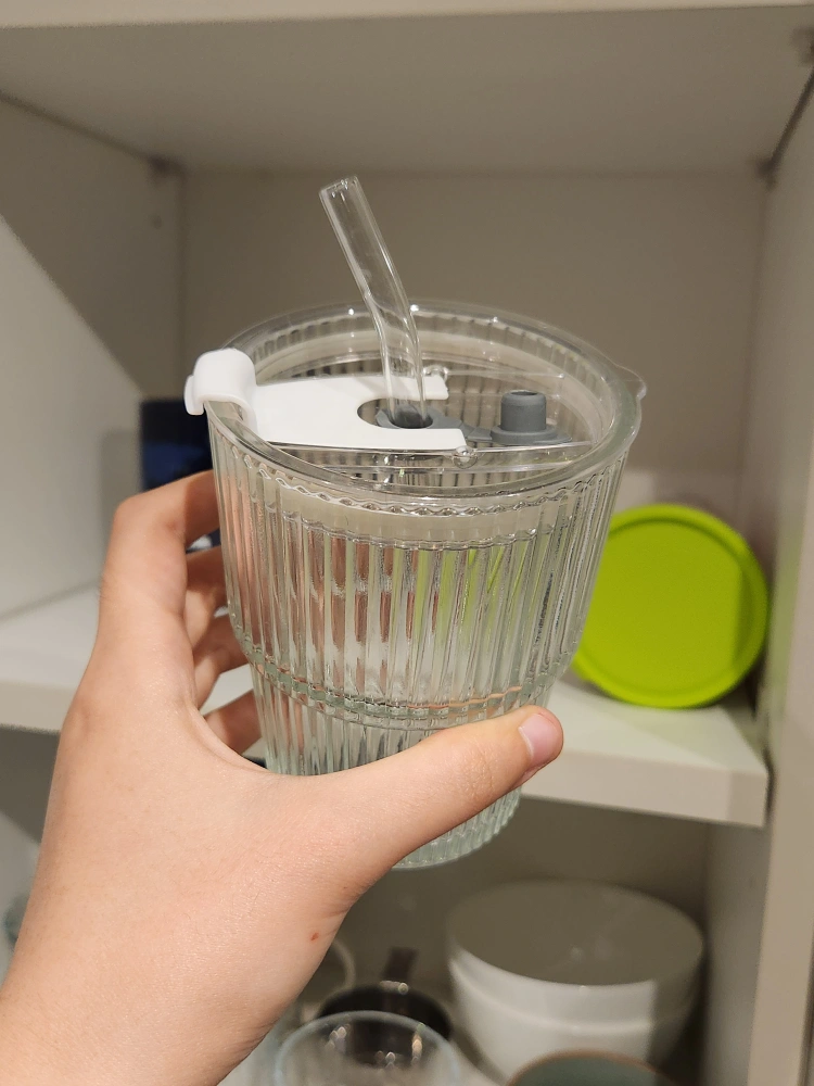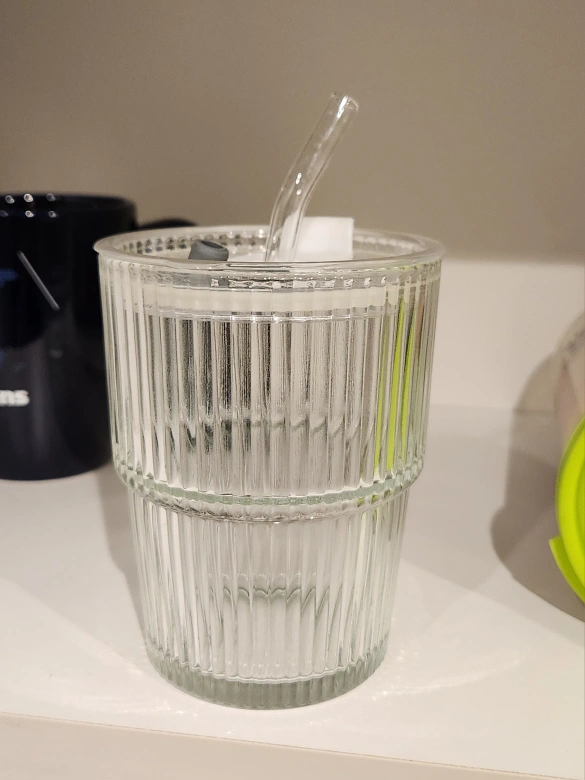 Selling a glass tumbler with a straw. It's in great condition and perfect for your favourite drinks. The clear glass design is simple and stylish, and the included straw makes it easy to sip on the go!