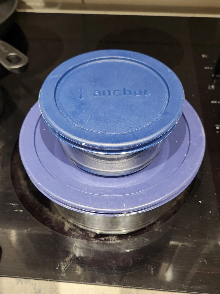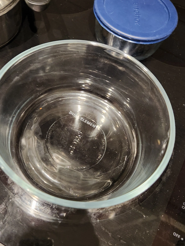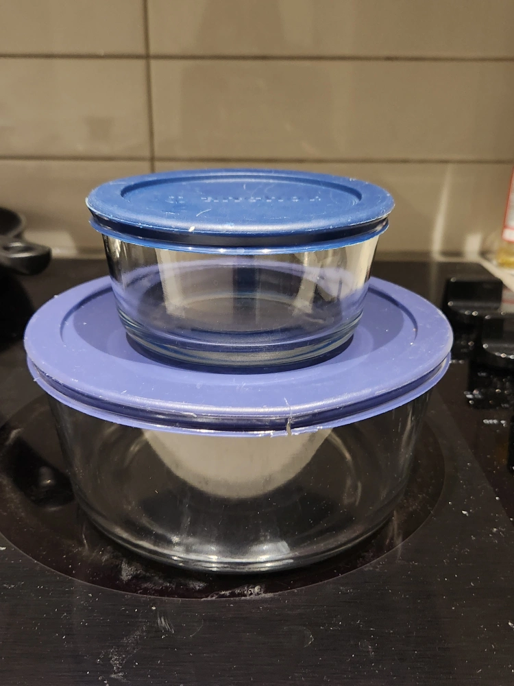 Selling a couple of glass bowls! One is a Pyrex bowl, and the other is an Anchor glass bowl. Both come with lids, although the Anchor lid has a crack in it. Perfect for storing leftovers or meal prepping