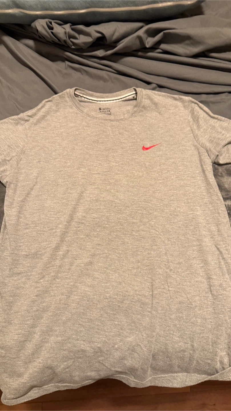 Selling a Nike Dri-FIT athletic cut t-shirt in size large. It's in great condition and ready for a new home! The shirt is grey with a red Nike swoosh. It is made in Vietnam and features Nike Better World.
