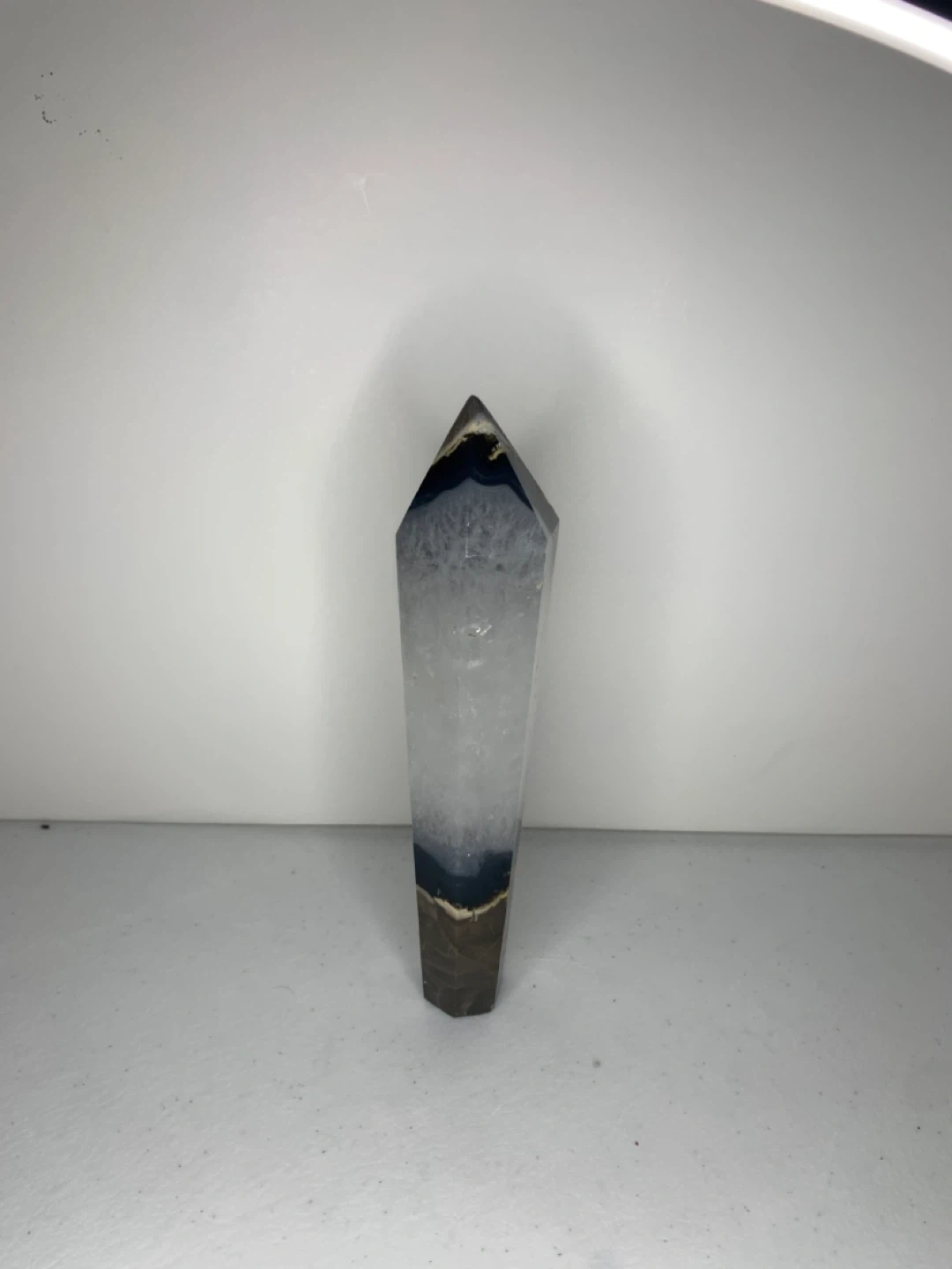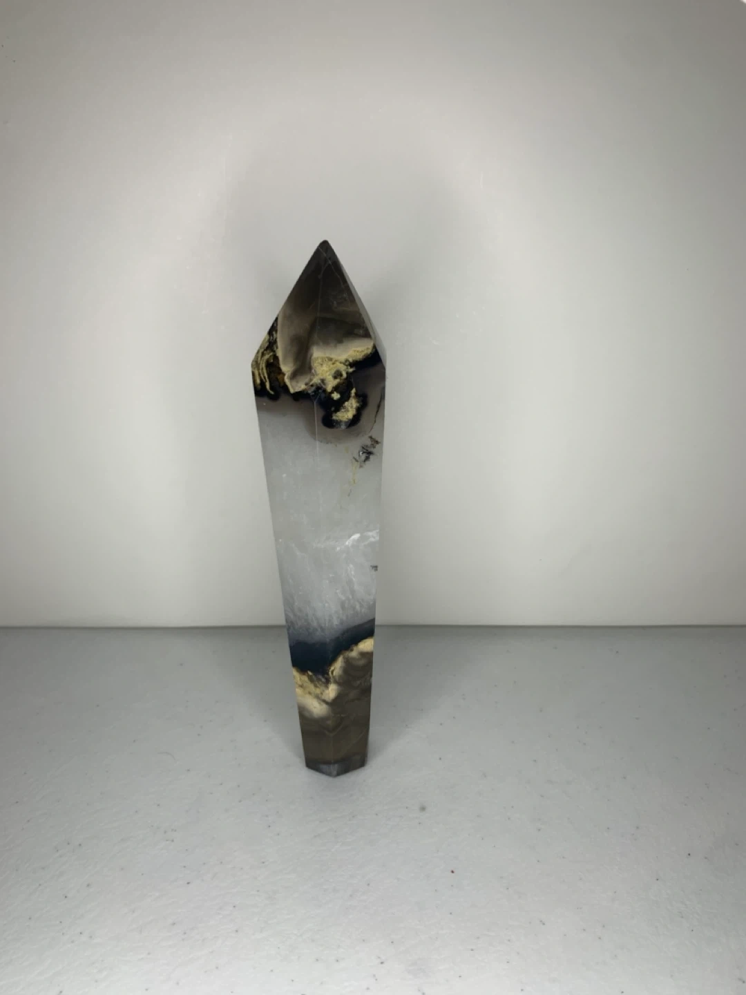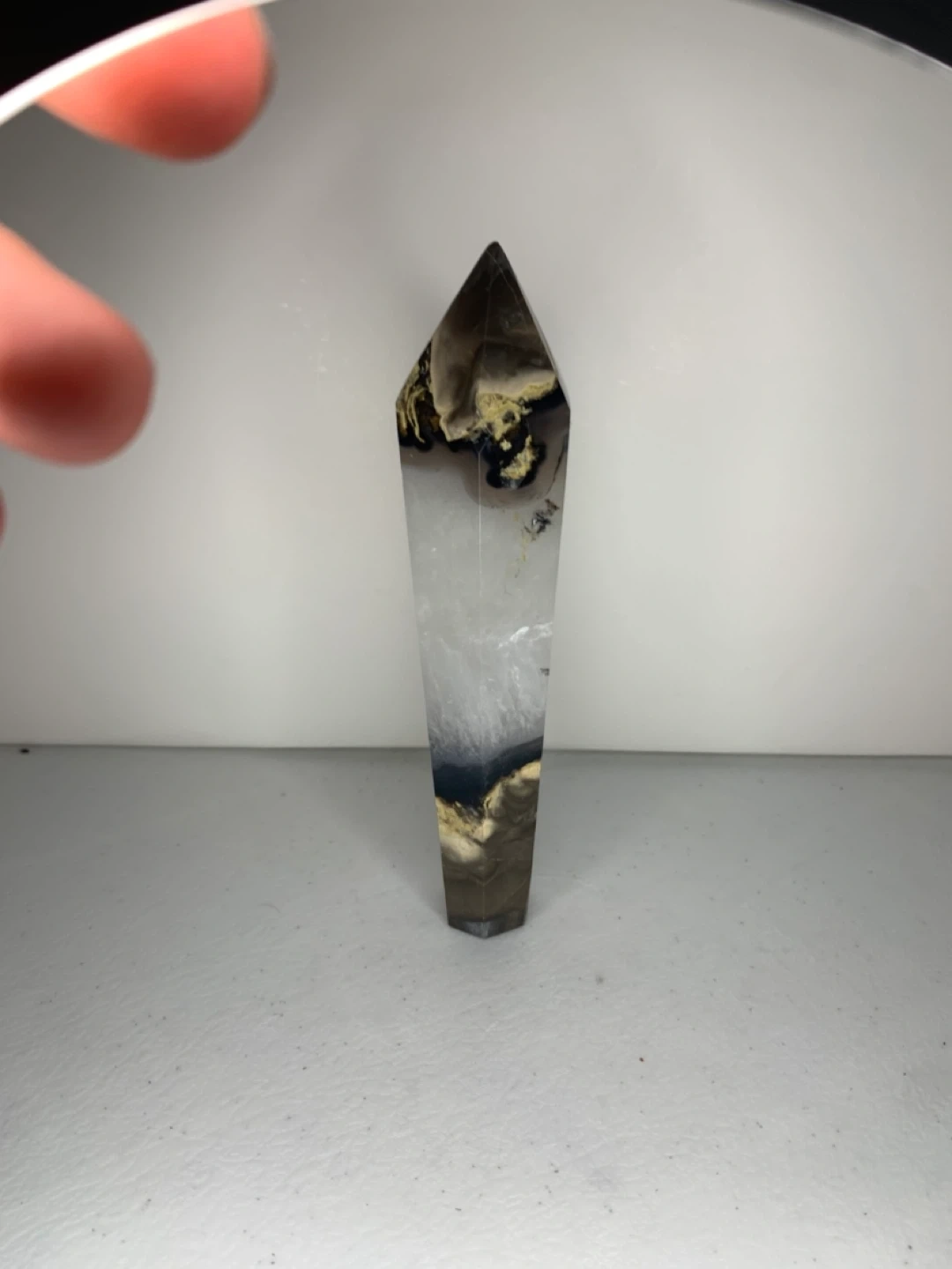 Selling a beautiful volcano crystal tower! It has a unique pattern with white, brown, and black colours. Perfect for home decor or crystal collection