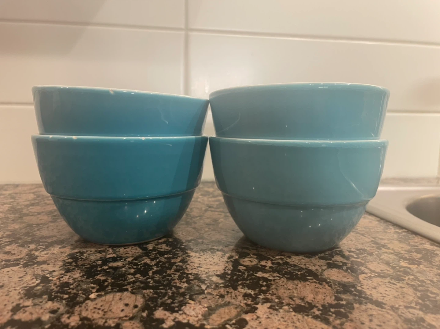 Set of four cute blue ceramic bowls. They're perfect for cereal, soup, or snacks. There are a few minor chips, as shown in the photos, but otherwise they're in good shape and ready for a new home. Pick up at West Broadway & Yew.