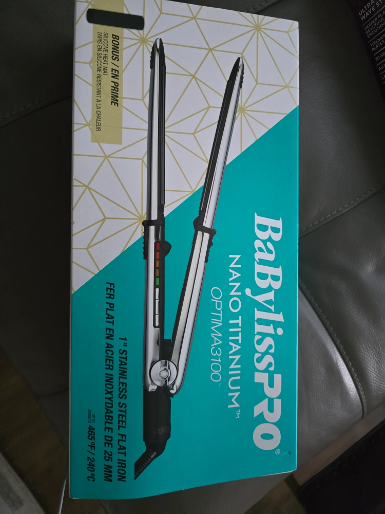 Selling a brand new BaBylissPRO Nano Titanium Optima3100 flat iron! This features 1" stainless steel plates and heats up to 465°F/240°C. It also comes with a bonus silicone heat mat, so you can protect your surfaces while styling your hair pick up only Cash only see my other posts