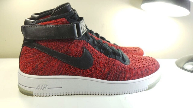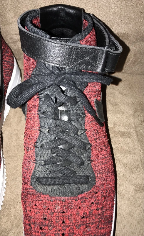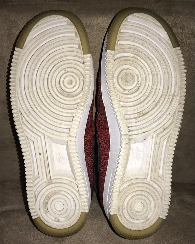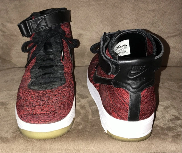 Nike Flyknit Air Force 1 Mid University Red Running Shoes Sneakers $180 Size 10.5 mens Nike Flyknit Air Force 1 Mid University Red The 2015 Nike Flyknit Air Force 1 in red is a notable variant of Nike's classic Air Force 1 sneaker, incorporating Flyknit technology into the traditional design. Here’s a detailed overview of this specific model: Key Features and Design 1. Flyknit Technology: o Material: The shoe features Nike’s Flyknit upper, which is made from a single piece of knitted material. This provides a lightweight, breathable, and flexible fit. o Benefits: Flyknit technology enhances comfort and reduces the shoe's overall weight compared to traditional materials, while offering a snug and adaptive fit. 2. Design and Aesthetics: o Colorway: The 2015 model is distinguished by its vibrant red colorway, which covers the entire upper. This striking color is complemented by the classic Air Force 1 silhouette. o Classic Air Force 1 Silhouette: Maintains the iconic Air Force 1 design elements, including the round toe box, perforations for ventilation, and a thick, cushioned sole. o Swoosh Branding: Features the Nike Swoosh logo on the side, consistent with the standard Air Force 1 design. o Tongue and Heel Branding: Includes Nike branding on the tongue and heel tabs. 3. Comfort and Cushioning: o Air Cushioning: Equipped with Nike’s signature Air Sole unit in the heel for impact protection and cushioning, providing comfort for all-day wear. 4. Sole and Traction: o Rubber Outsole: The outsole is made of durable rubber with a classic Air Force 1 tread pattern, offering reliable traction and grip. Great Christmas gift Condition: Used - Like new Size: 10.5 Cashless payment: Yes For Sale By: Owner Curbside pick up: Yes Shipping: No Fulfillment: Curbside pick up Drop off / Delivery: No Cash accepted: Yes Payment: Cashless payment, Cash accepted
