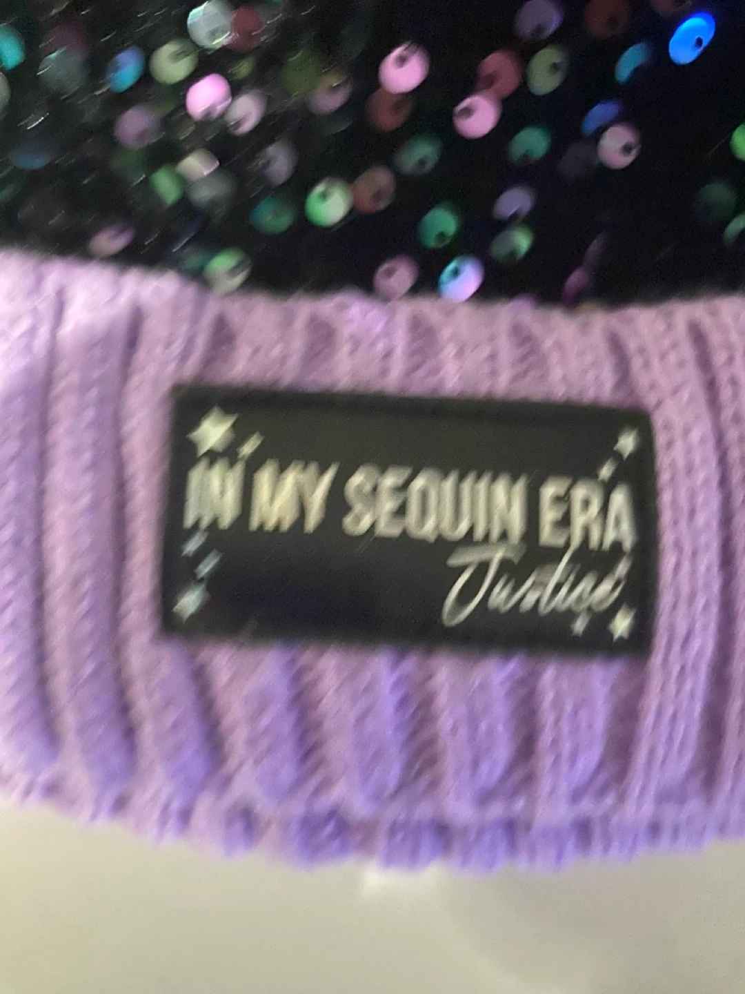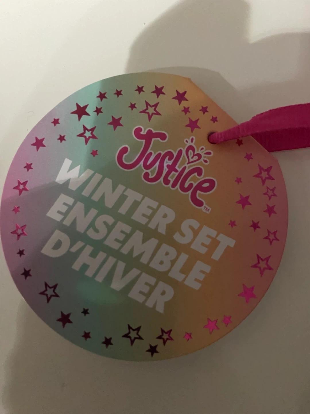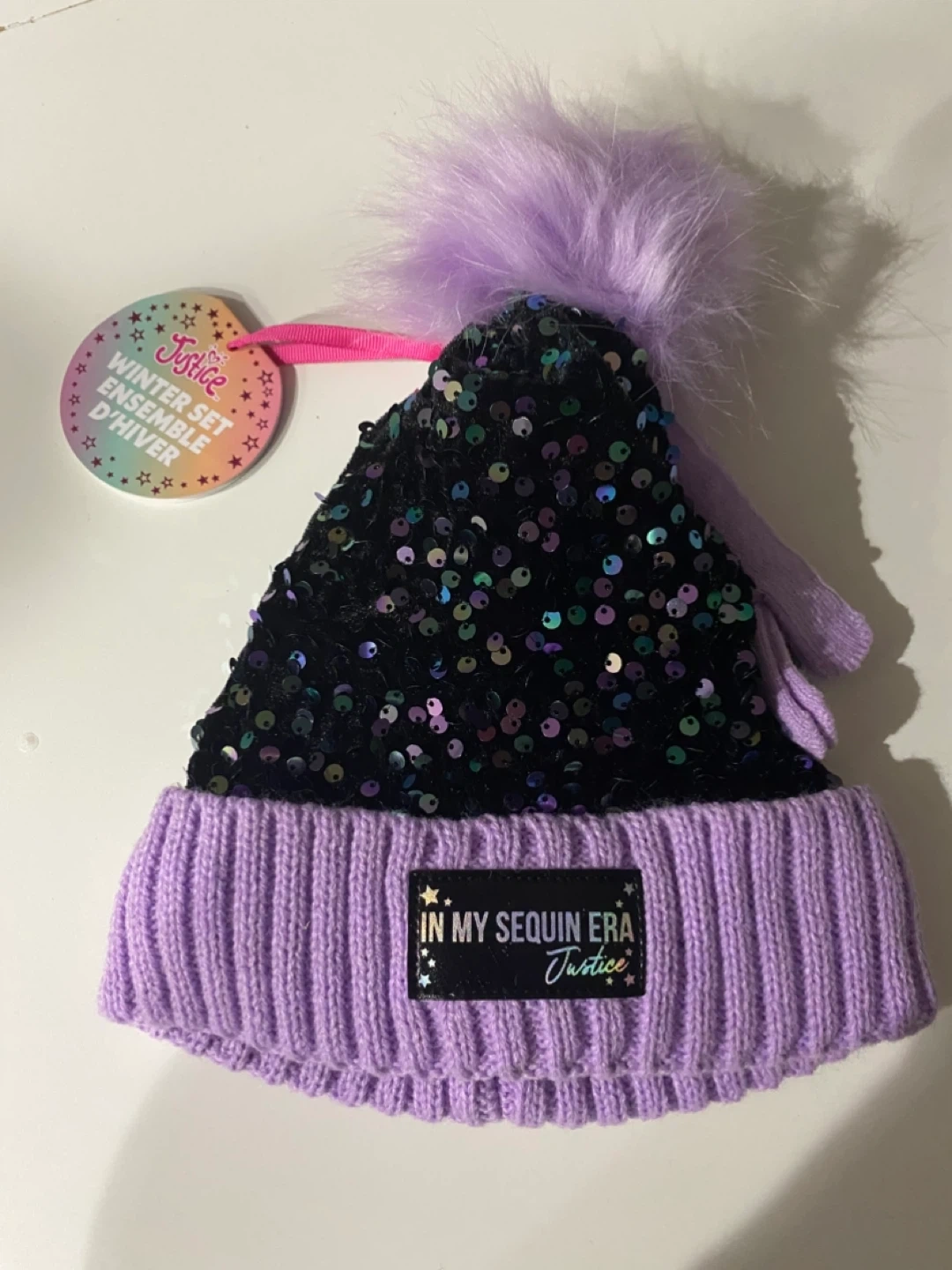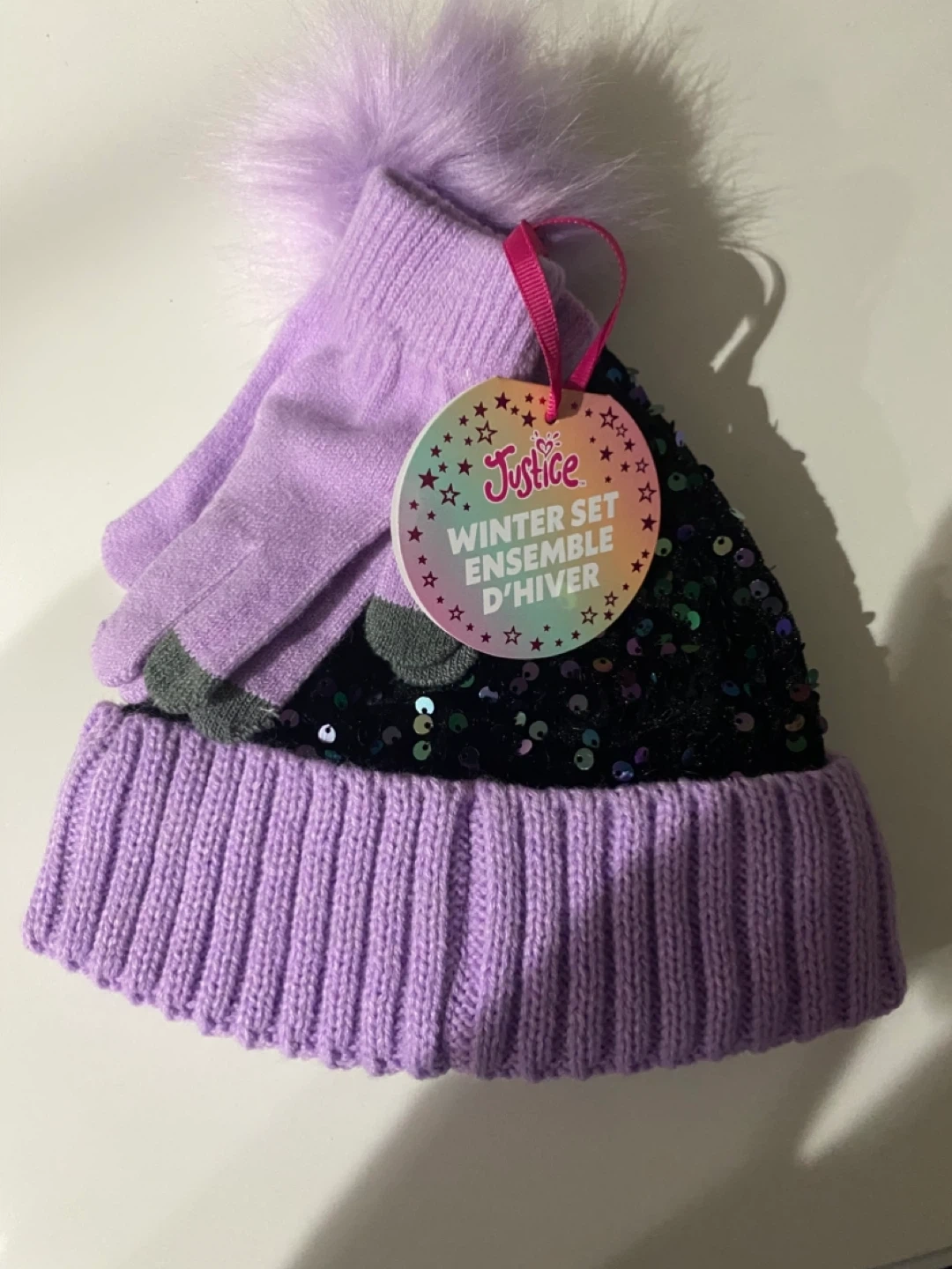 Justice winter set including a hat and gloves! The hat is purple with a black sequin section and a fluffy pompom. The gloves are also purple. Super cute for keeping warm this winter Pick up Sage Hill Pet and smoke free home Check out my other listings Cash only