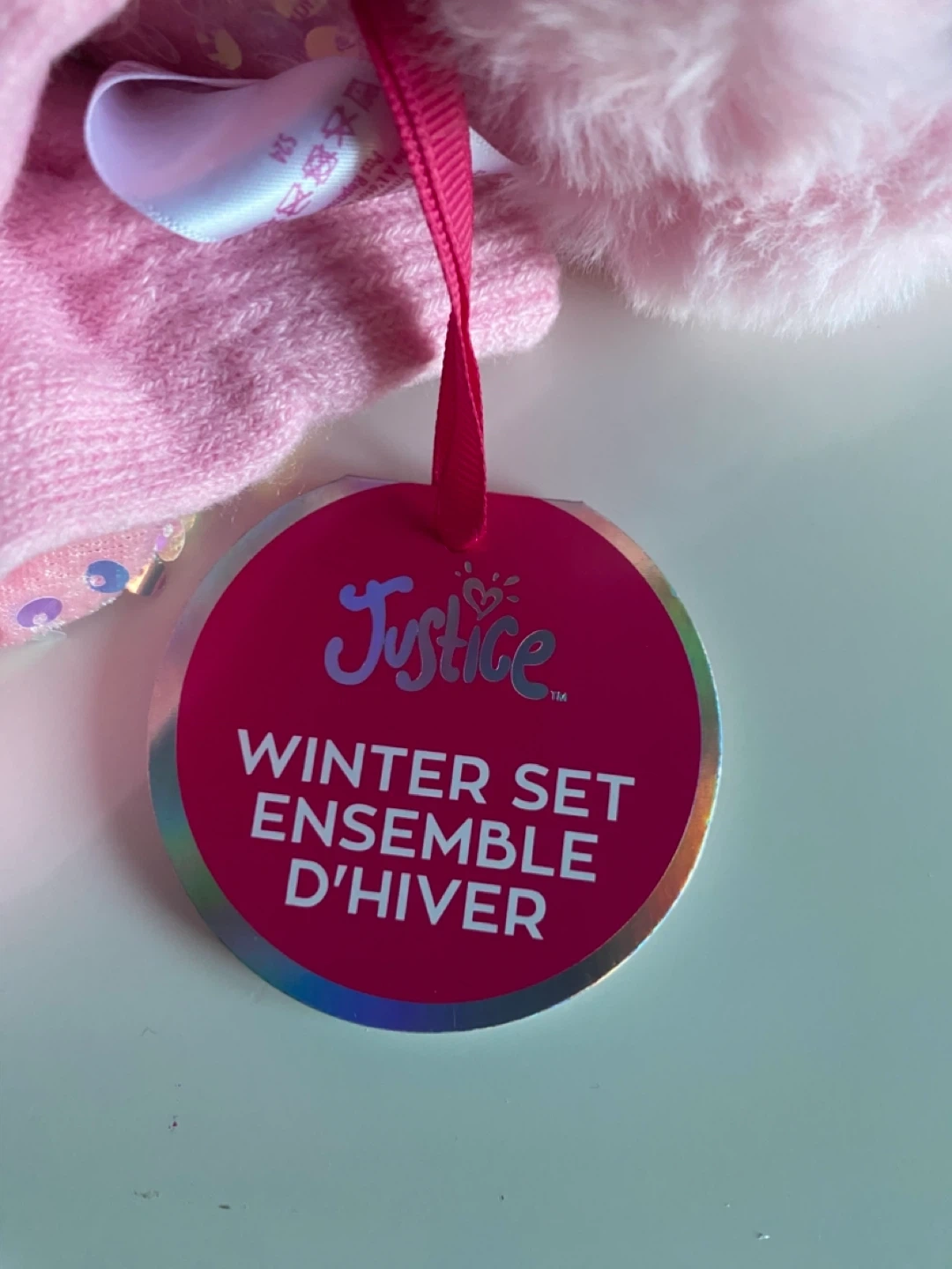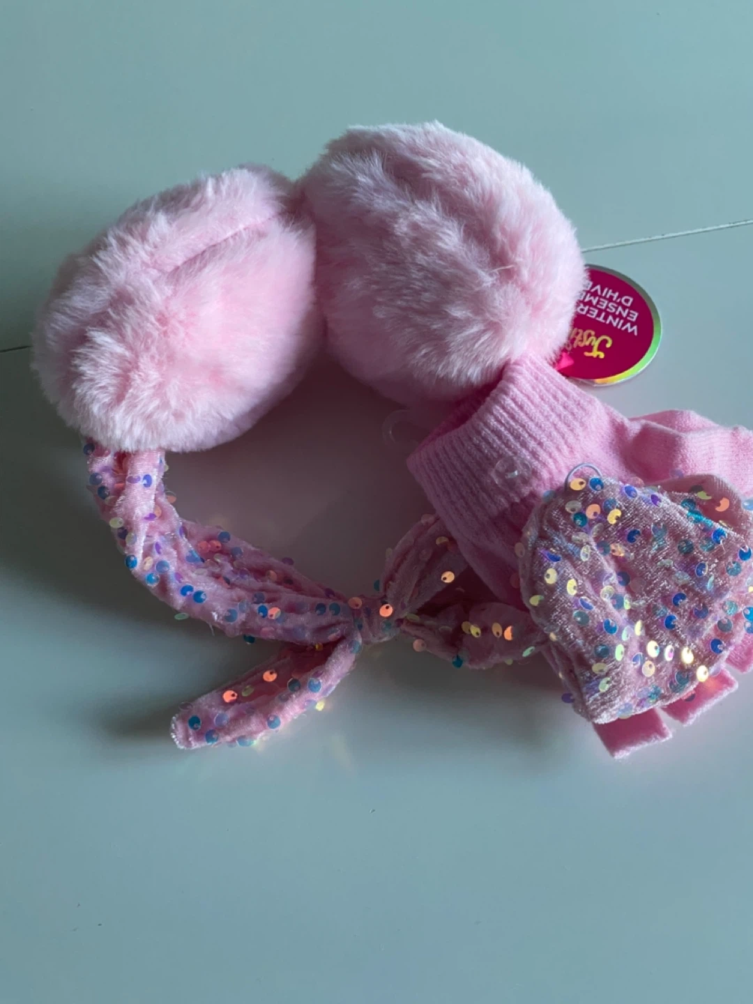 Super cute pink winter set from Justice! Includes fuzzy earmuffs and a matching pair of gloves both with adorable sequin details. Perfect for keeping your little one warm and stylish this winter! Pick up Sage Hill Cash only Check out my other items Pet and smoke free home