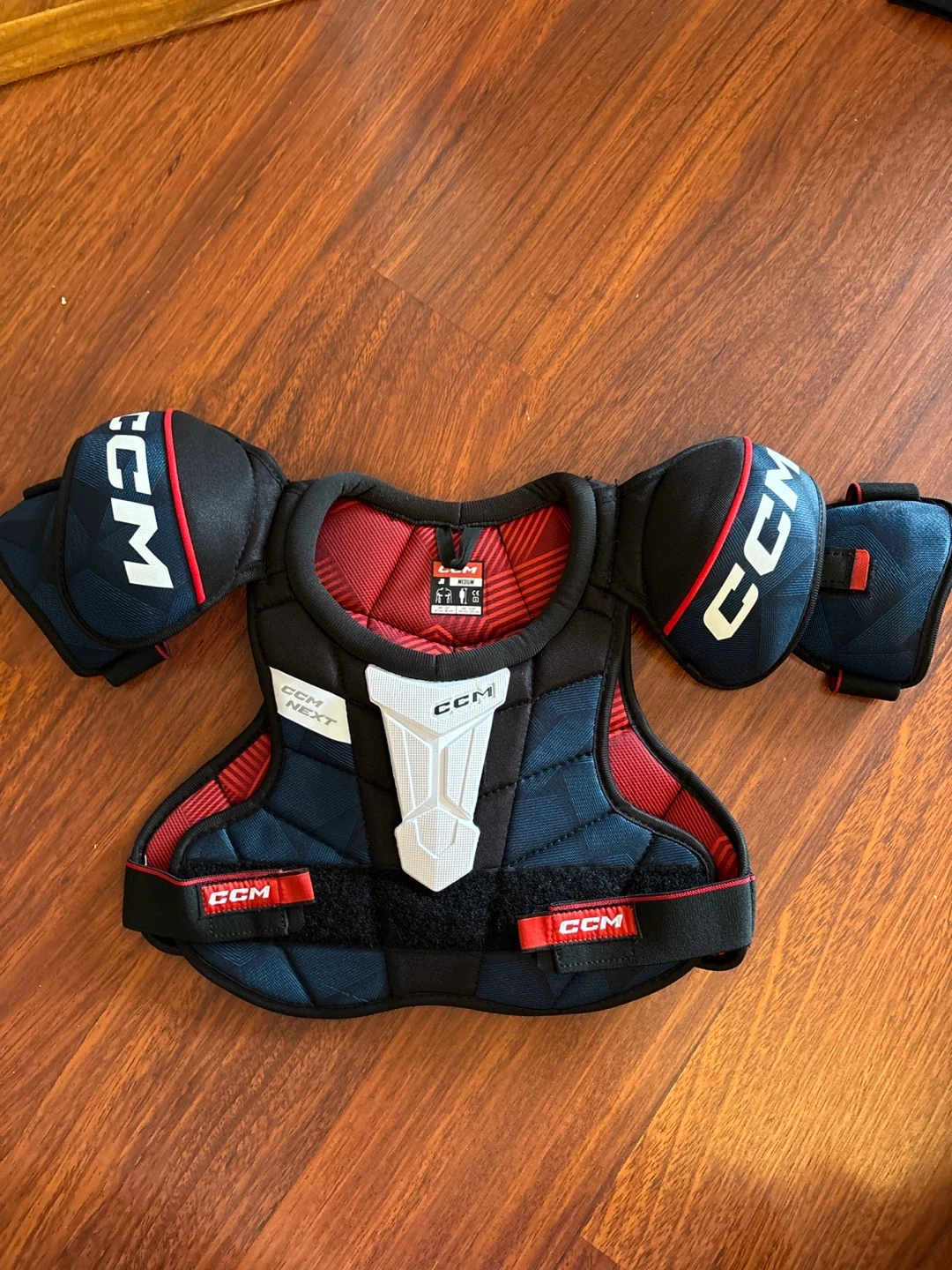 Selling a pair of CCM Next JR hockey shoulder pads in size Medium. These pads are in great condition and ready for the ice! They are designed for players with a chest size of 26"-32" (67cm - 81cm) and a height of 4'6" - 4'10" (137cm - 147cm). Perfect for junior players looking for reliable protection.