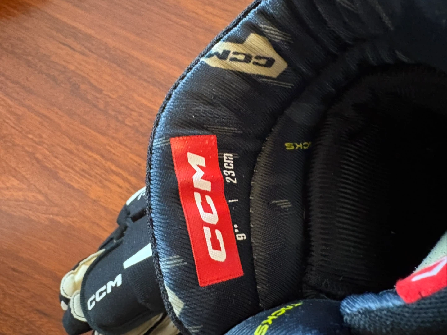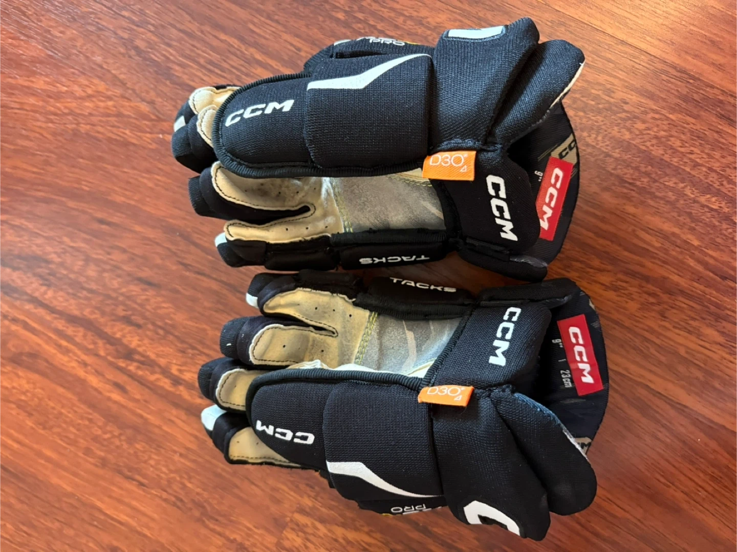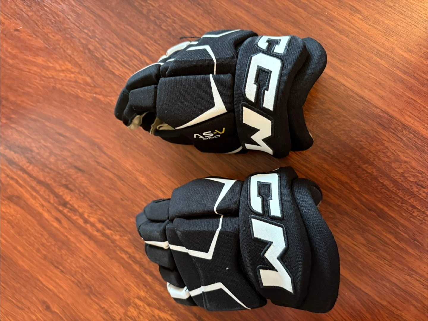 Selling a pair of CCM Tacks AS-V Pro hockey gloves in size 9". These gloves are black and white. They are in good condition and ready for the ice!