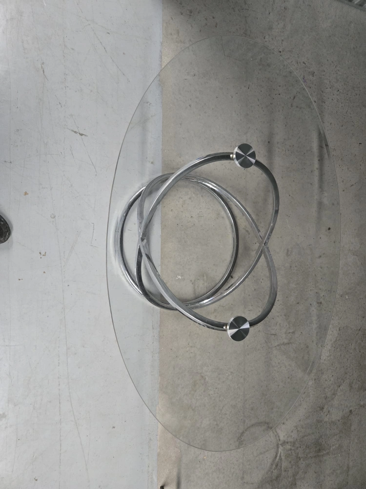 Selling a stylish glass oval coffee table. It features a unique chrome base design that adds a modern touch to any living space. The glass top is in great condition and the chrome base is sturdy and eye-catching. Perfect for your living room! Retails for $200