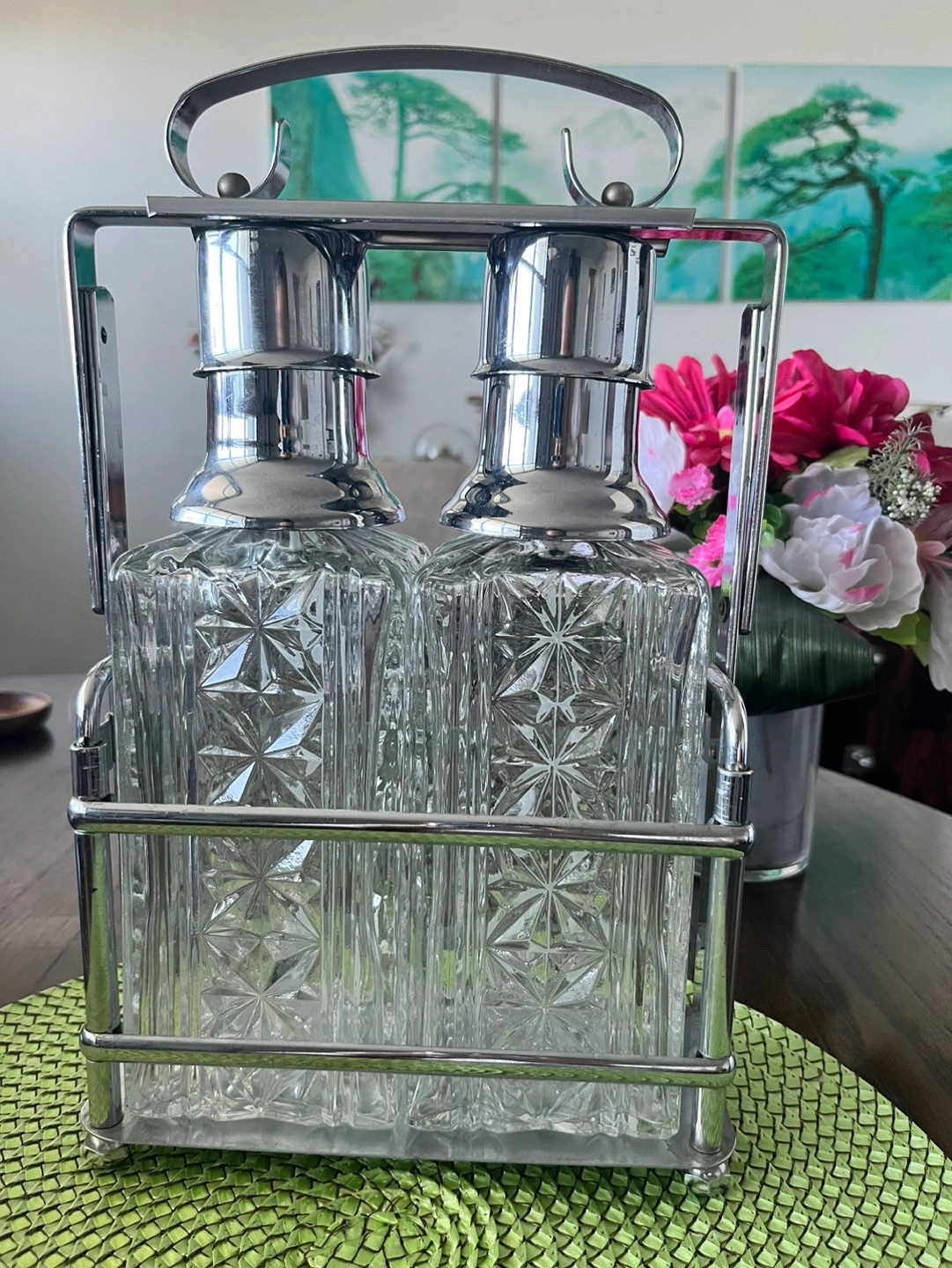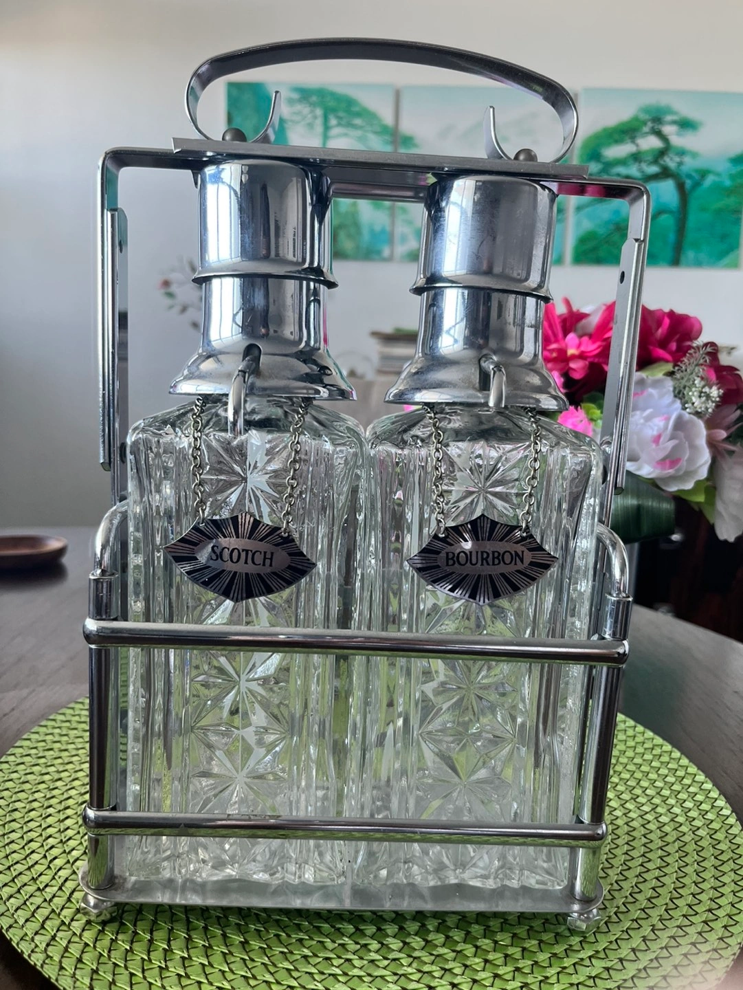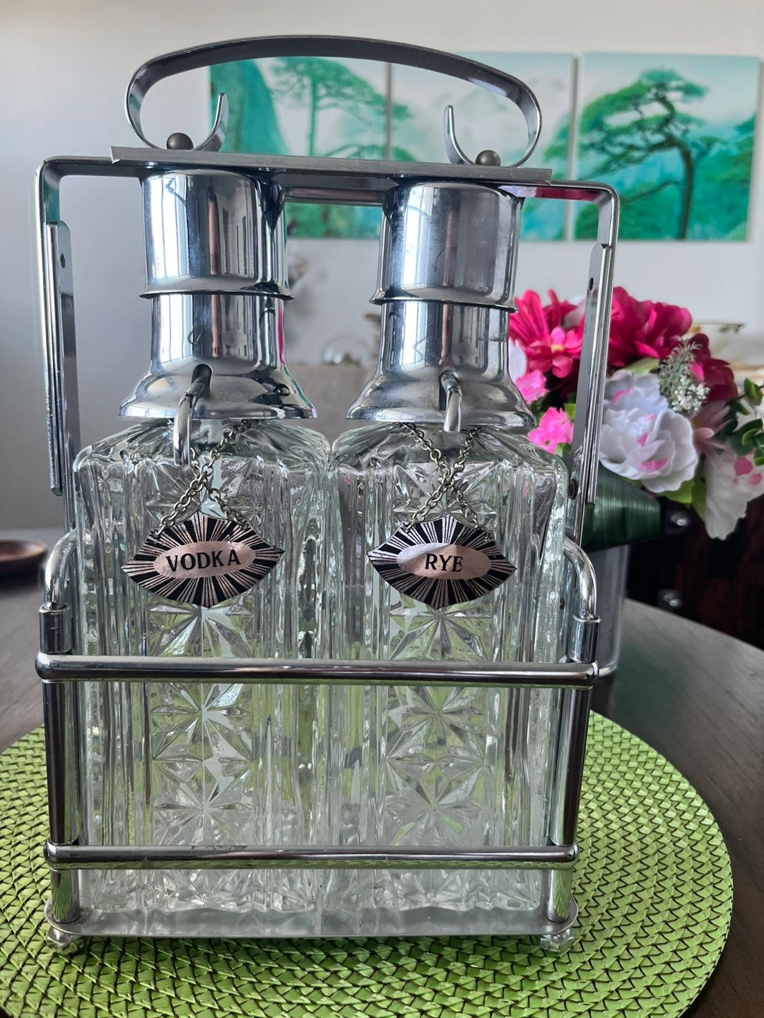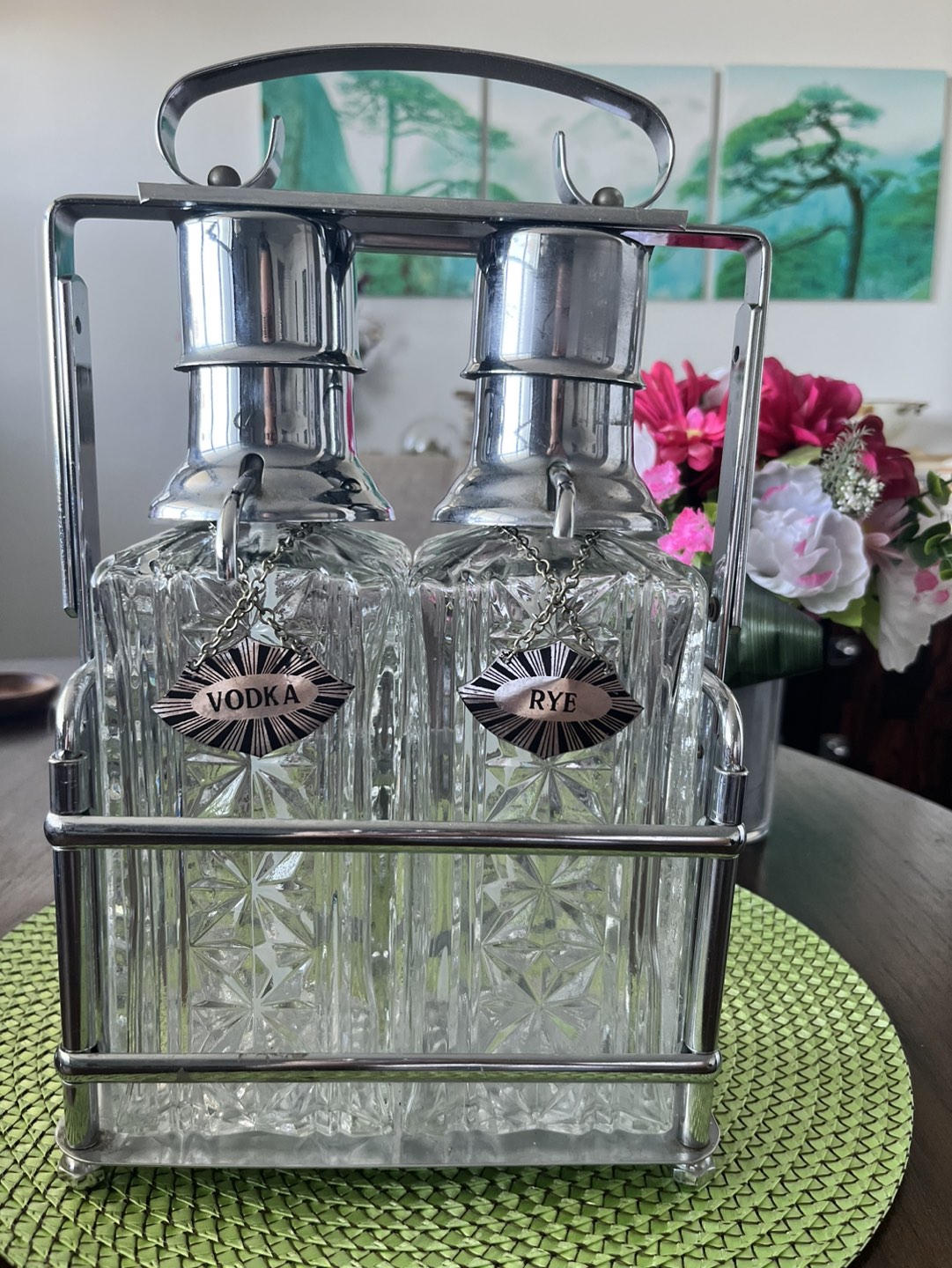 1960s Midcentury Set of heavy glass liquor Decanters in Chrome Caddy by Imperial Glass Each of the decanters have a screw-top and pump, and they are comprised of a very thick, sturdy, decorative glass. Each decanter has a reversible metal tag, one has VODKA on one side and SCOTCH on the other. The other tag has BOURBON on one side and RYE on the other. The chrome caddy is also very sturdy and functional, and it has a little padlock that goes through a hole on one side so it can be locked up. Approximate measurements Total Height: 13 1/4” Width: 8 1/4” Depth: 4” Bring packing material. Untested
