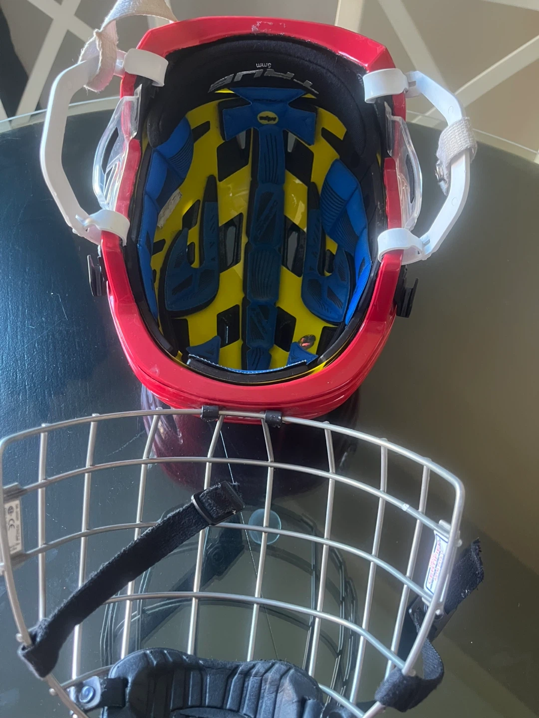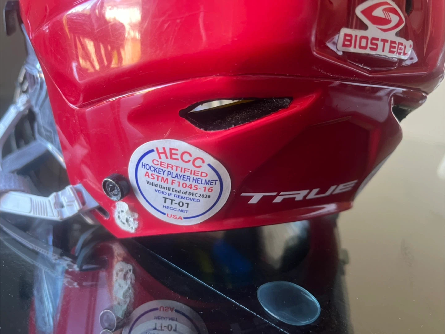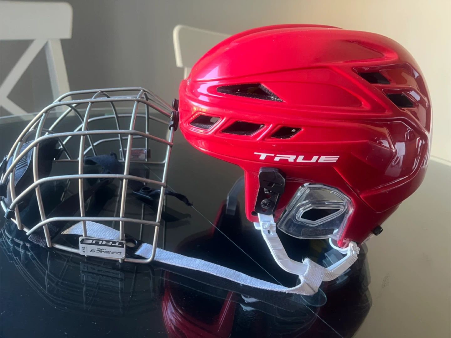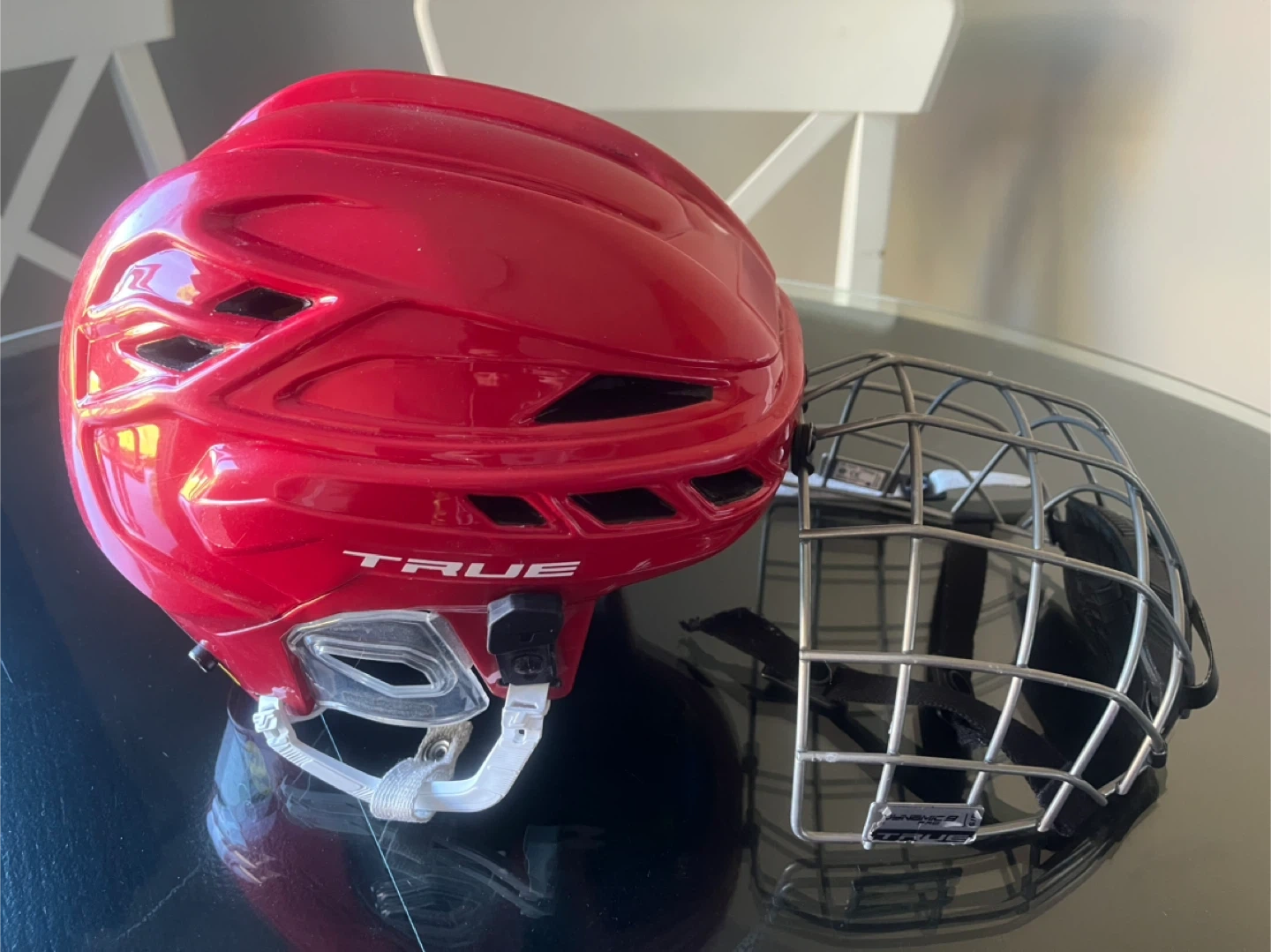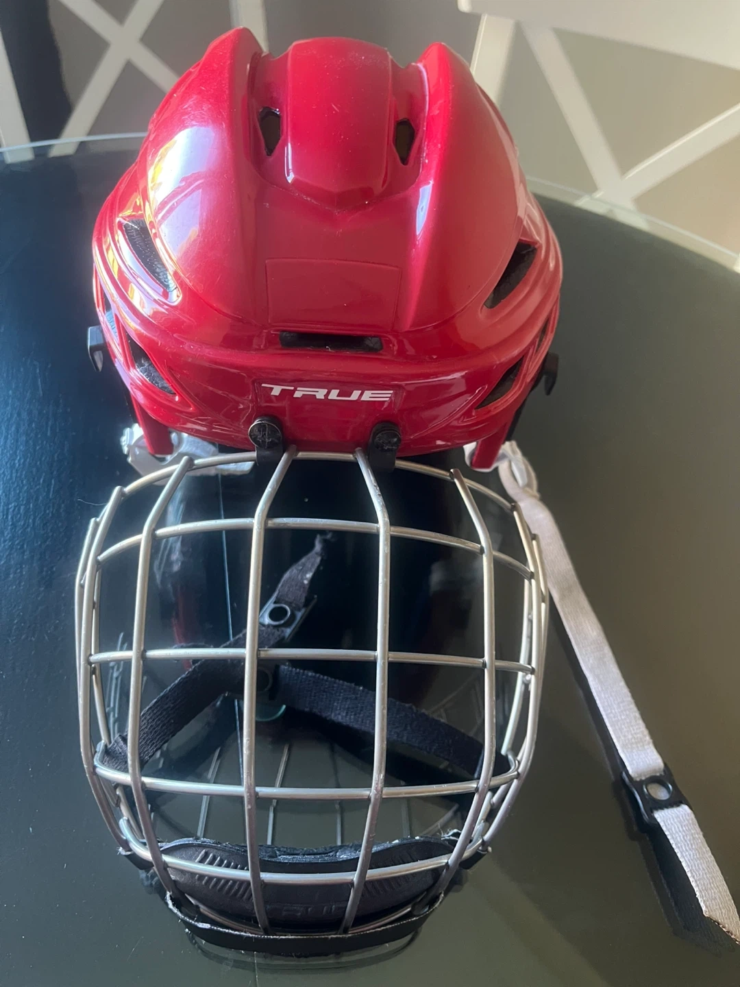 Selling a TRUE hockey helmet in red. It comes with the matching cage. Size Small. The helmet is HECC certified and is valid until the end of December 2026. Perfect for your next hockey season!