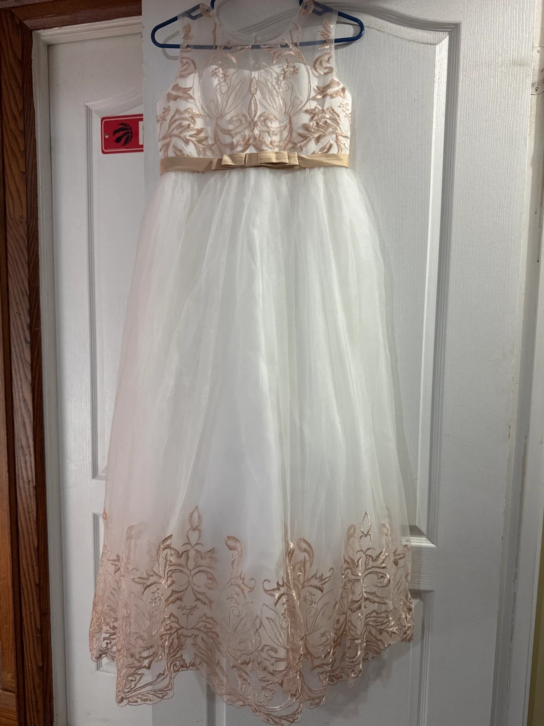 Beautiful white dress with gold embroidery detailing! Perfect for a special occasion. It's in great condition and ready for a new home