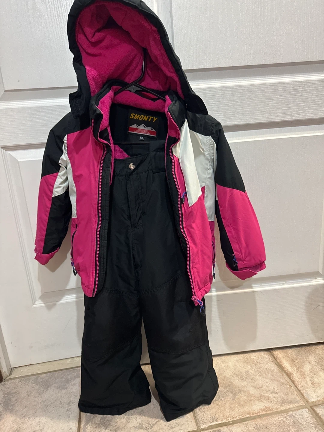Selling a kids' snowsuit from Smonty in size 12! It's a black snowsuit with a pink jacket and some white accents. Perfect for keeping your little one warm this winter season! 3-4 yr size