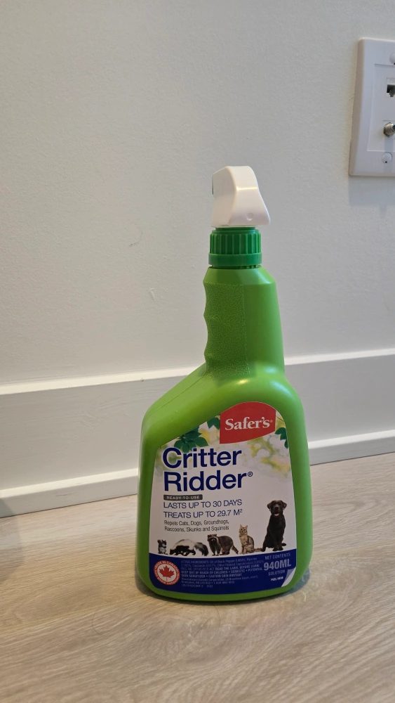 Selling a bottle of Safer's Critter Ridder animal repellent. It's designed to keep away raccoons, skunks, squirrels, and other critters from your property. The bottle contains 940mL of the repellent and lasts up to 30 days, treating up to 29.7 m²