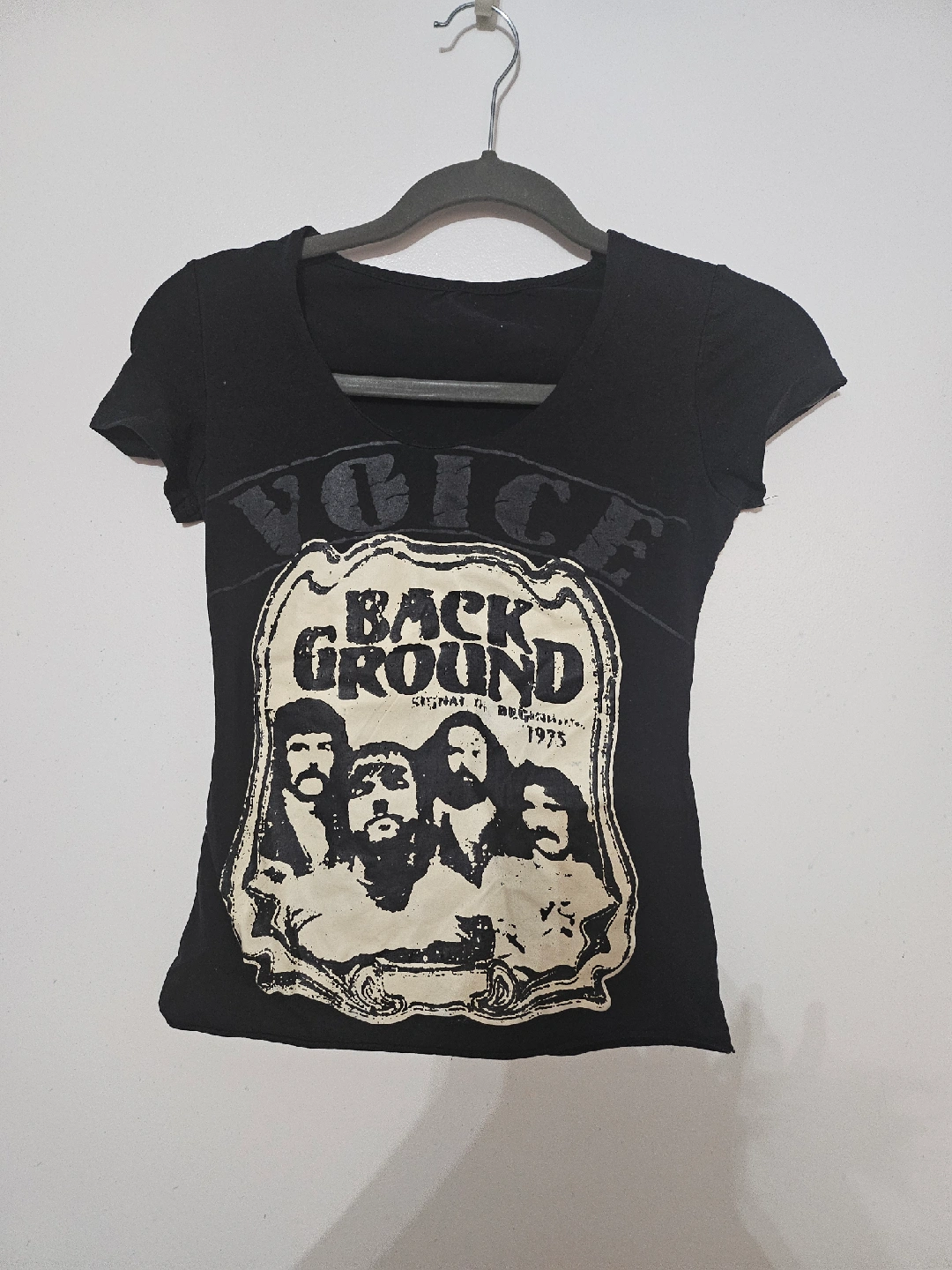 Selling a vintage black t-shirt featuring the band Background Voice. The design includes a graphic of the band members and the text "Signal in December 1975". It's a cool piece for any music lover or vintage clothing collector!