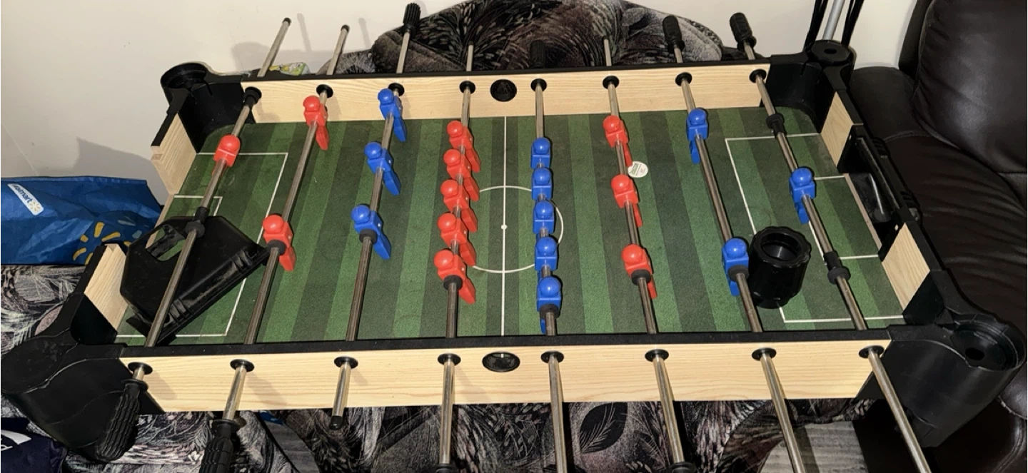 Foosball table with red and blue players ready for some friendly competition! It's in great shape and perfect for family fun or game nights