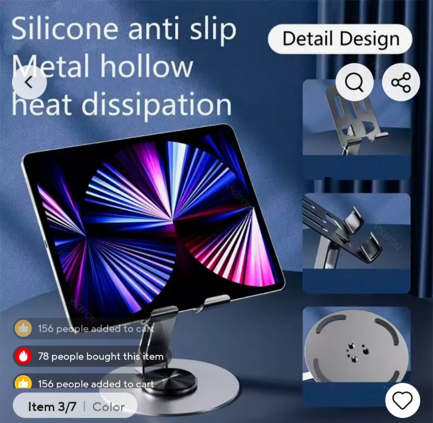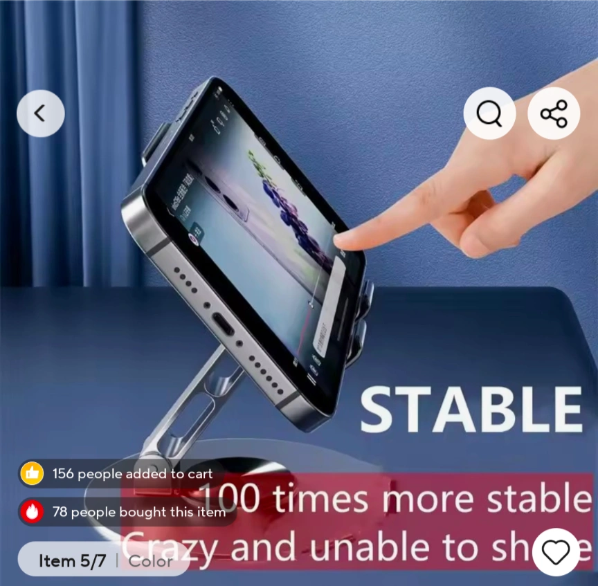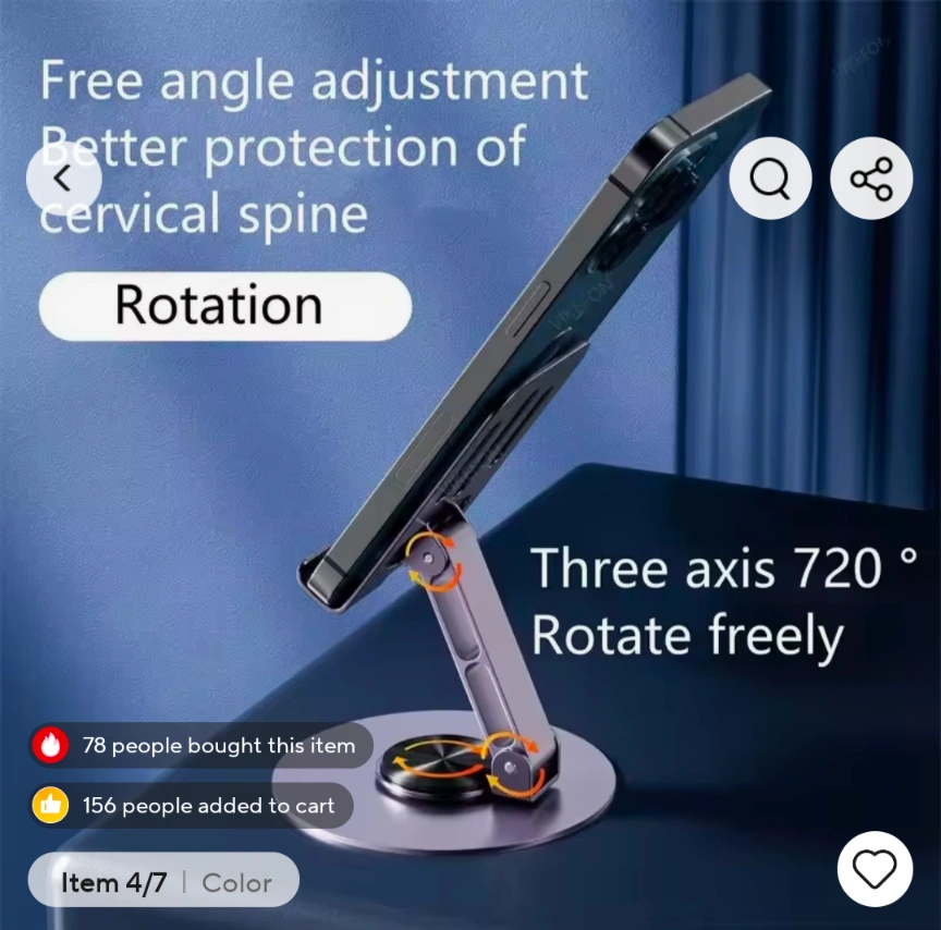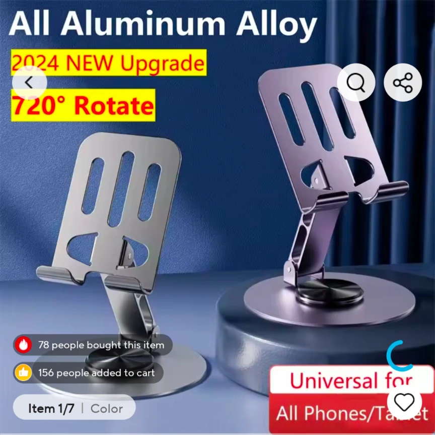 This universal stand is made of aluminum alloy and is compatible with all phones and tablets. It features a 720° rotation and a free angle adjustment. It is also foldable for easy storage and portability. It is designed with silicone anti-slip and metal hollow heat dissipation.