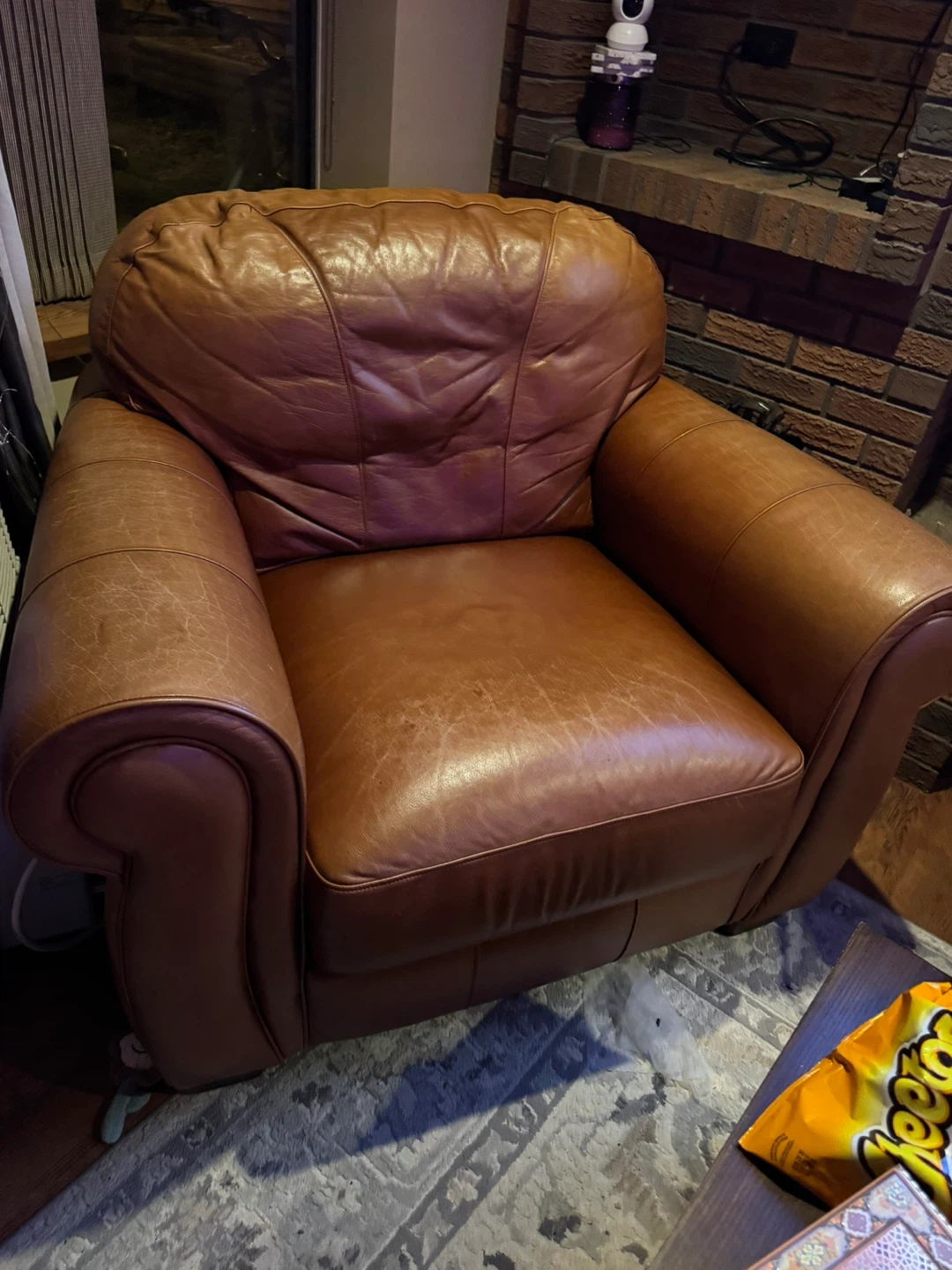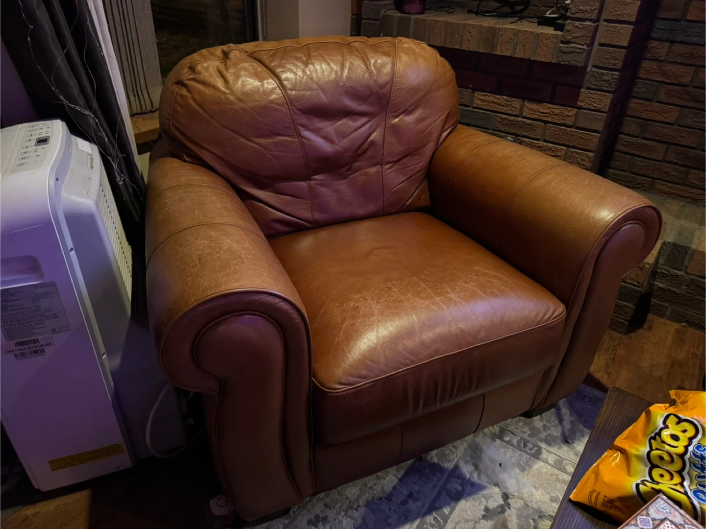 Comfortable brown leather armchair in good condition. It is a great addition to any living room or den. The leather has a nice, broken-in feel, perfect for relaxing after a long day! Please take a look at the photos for details