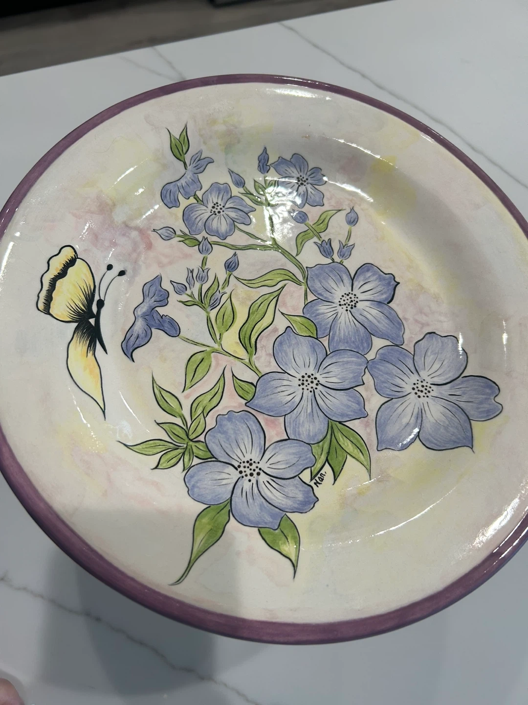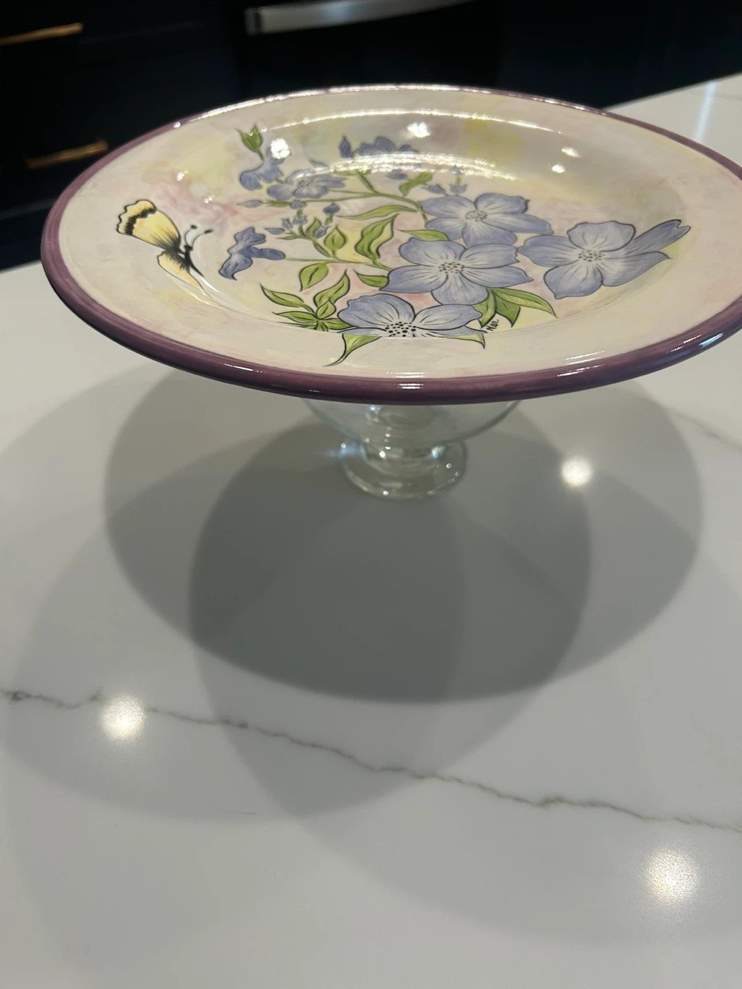 This decorative bowl features a lovely floral and butterfly design. It would be a charming addition to any home decor! It has a unique pedestal base. Perfect for a bday cake , cookies, muffins, or mini sandwiches for luncheon or appetizers.
