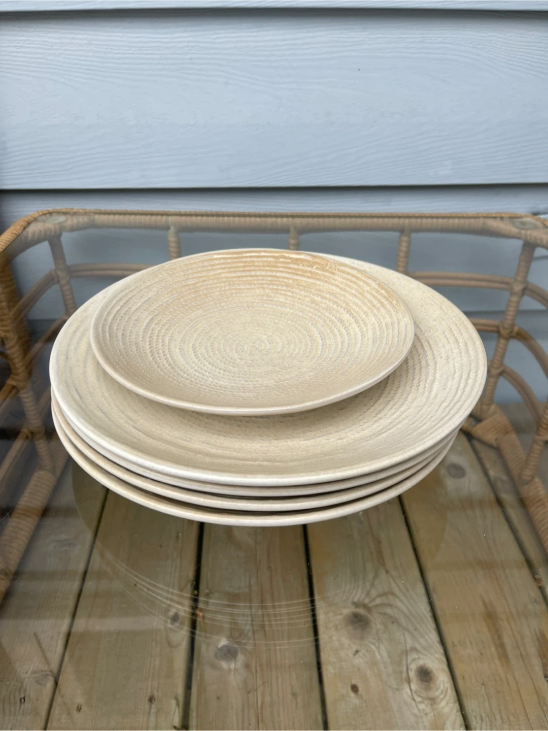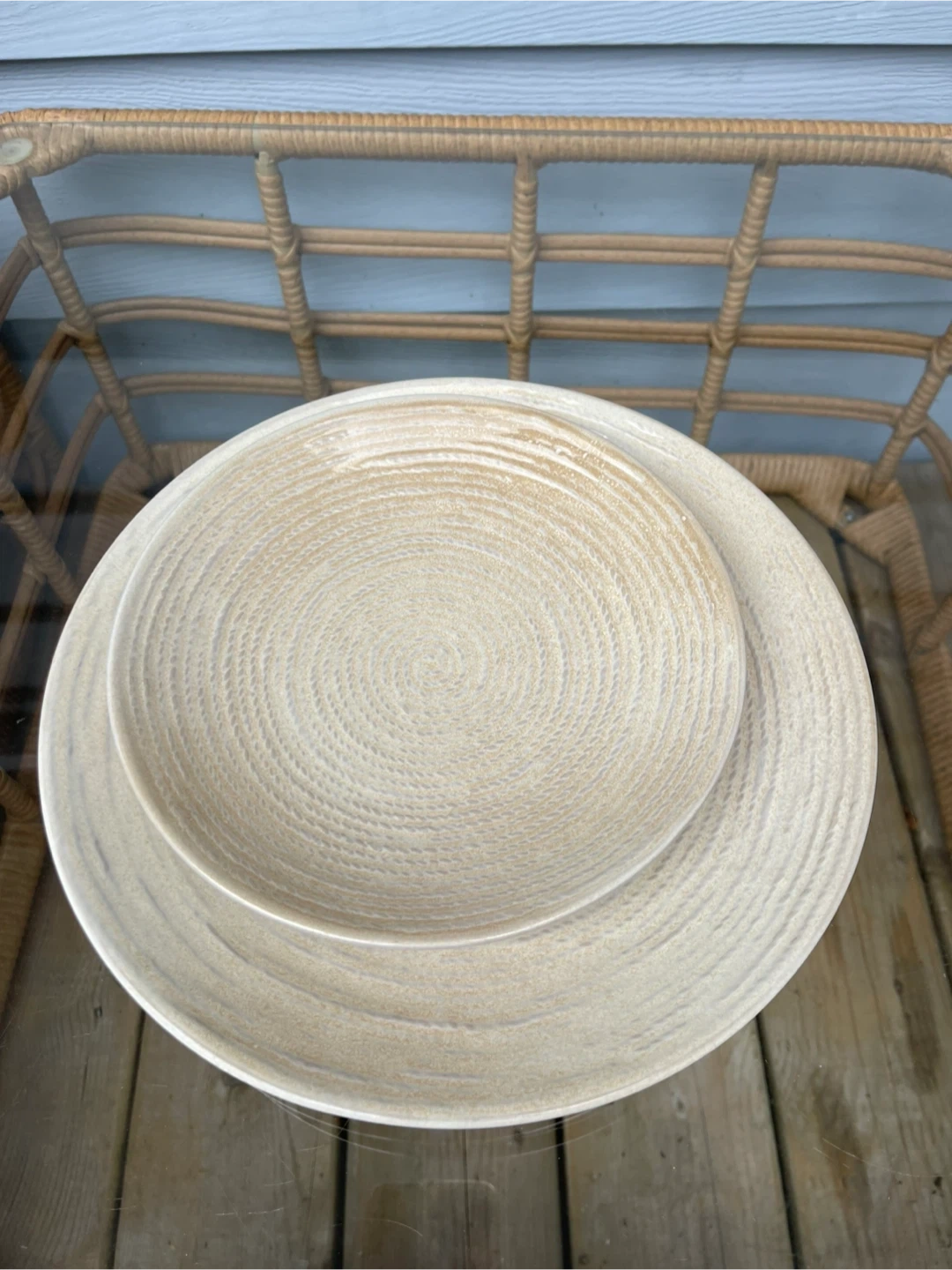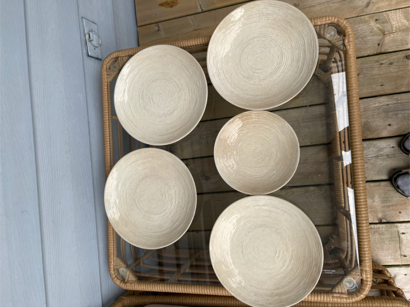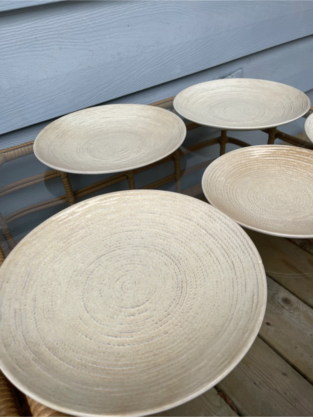 Selling a set of 5 dinner plates with a unique spiral design! They're in great condition and ready to add some style to your dining table