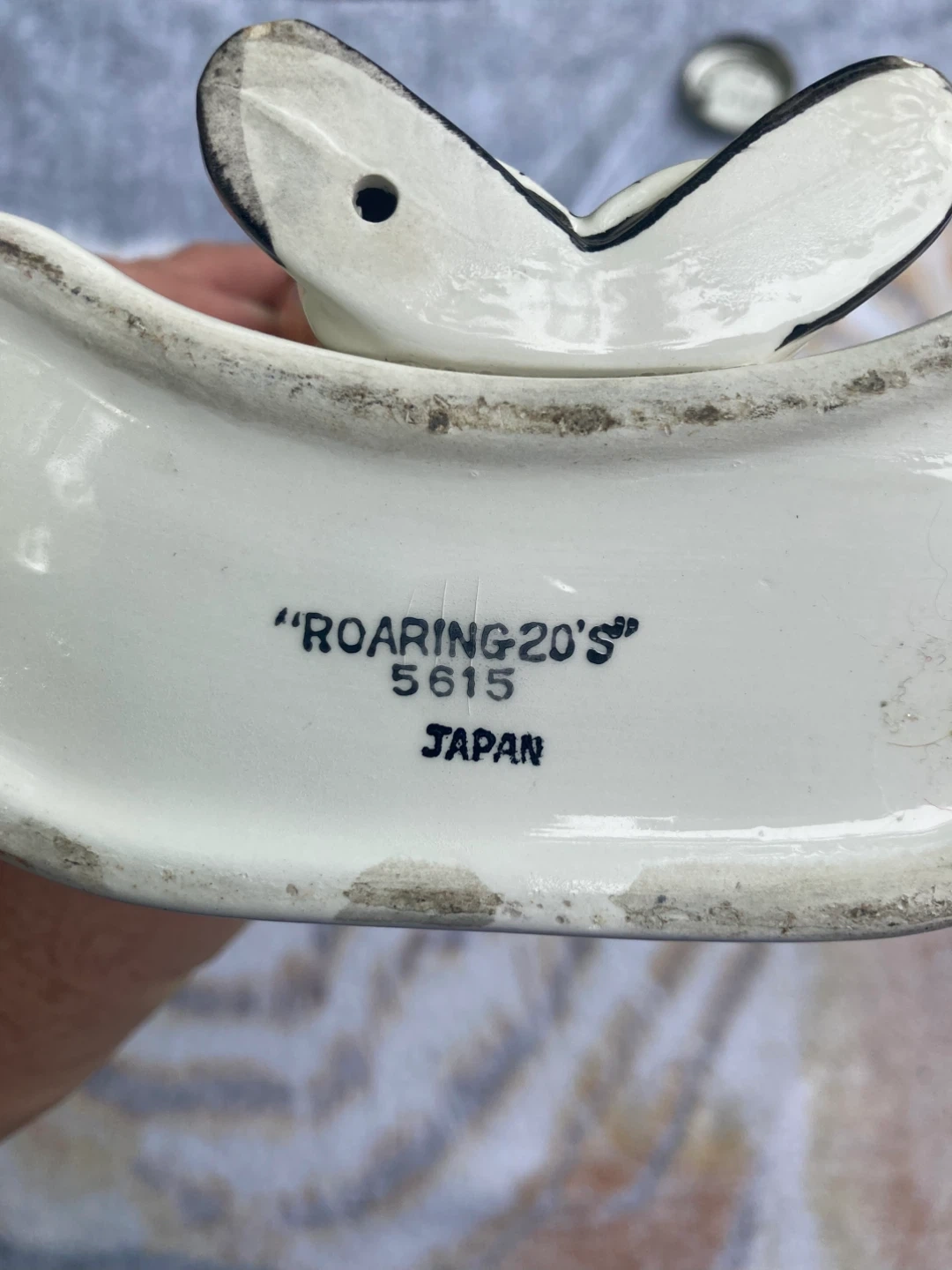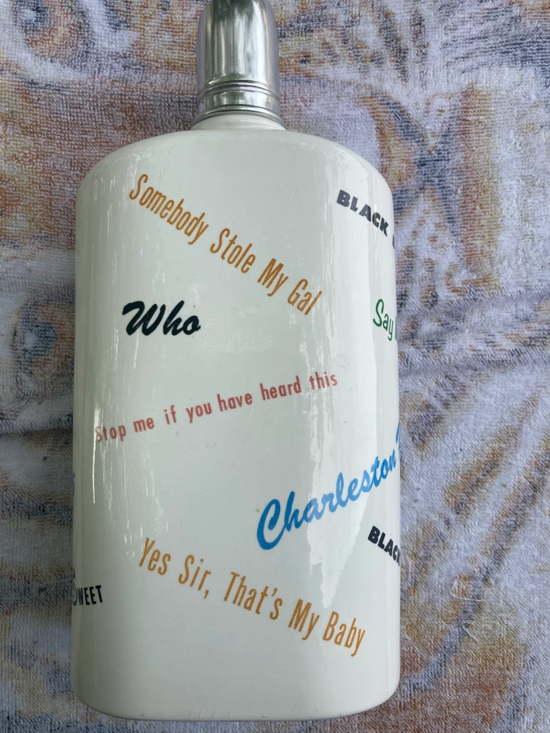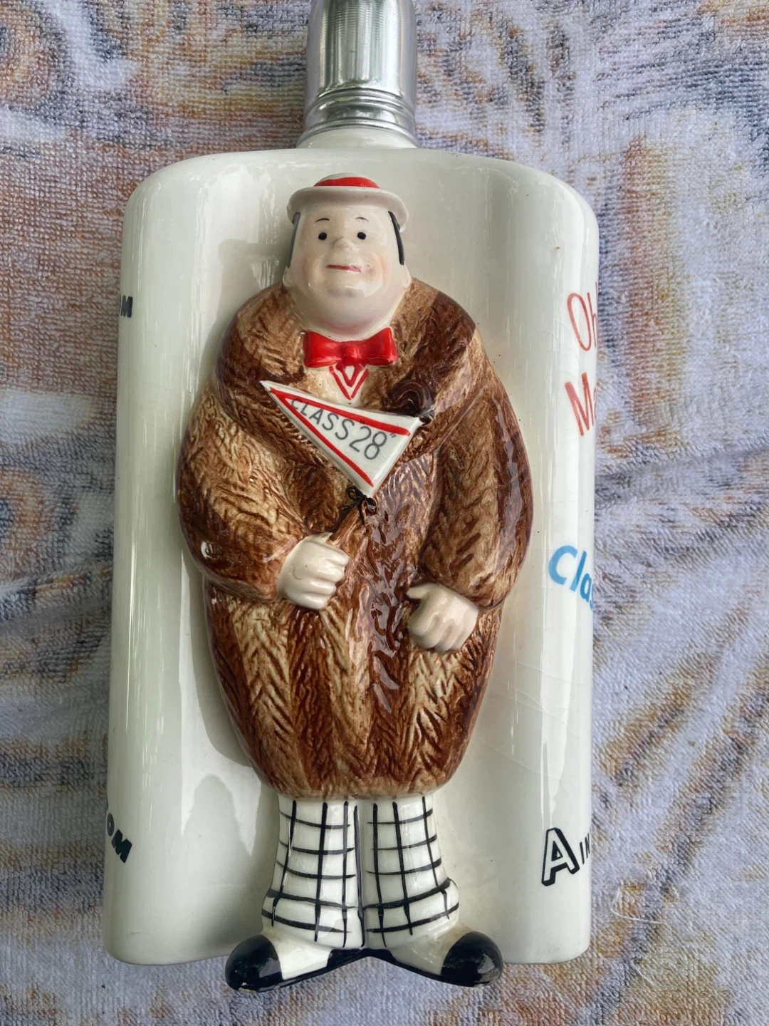 Vintage Roaring 20's liquor bottle. It has the number 5615 on the bottom and is made in Japan. The bottle features a figure in a brown coat, red bow tie, and checkered pants holding a flag that says Class 28. There are also various phrases on the bottle such as "Somebody Stole My Gal", "Charleston", and "Yes Sir, That's My Baby" 9/10 condition Small dent to cap /cover see photo