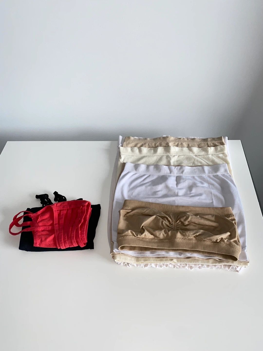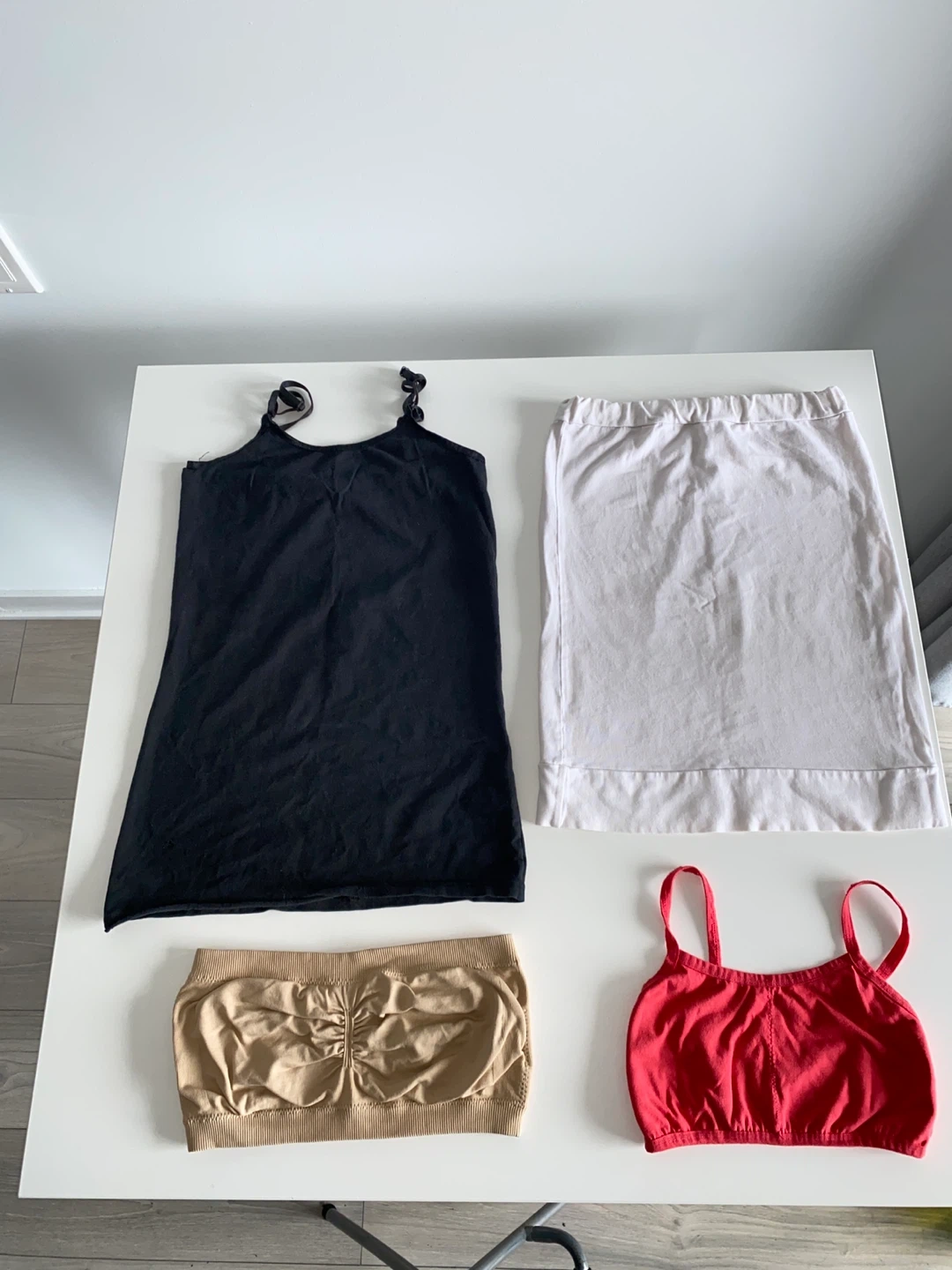 Check out this big bundle of stretchable and comfortable tube tops, spaghetti and bralettes in black, white, cream, nude, coral colours. You can pair with anything or wear on their own! Tube tops, spaghetti and nude tube bralette are free size. Coral bralette is xs. Black spaghetti needs little mending. ❤️ Check out my other listings for great deals!
