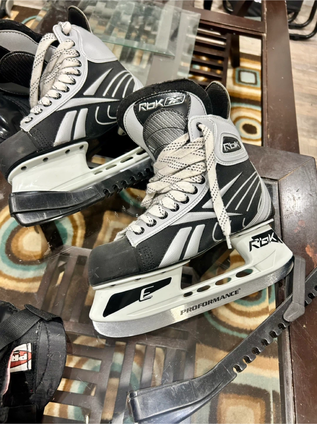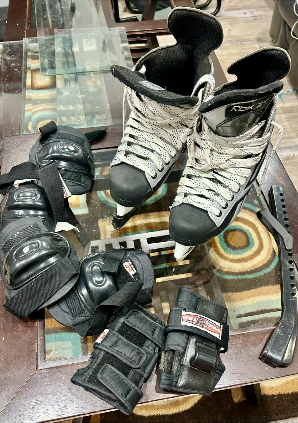 Selling a set of woman Reebok ice skates along with protective gear. The skates feature a black and grey design with white laces and the Reebok logo. Included are knee pads, elbow pads, and wrist guards, all in black. Perfect for anyone looking to hit the ice!