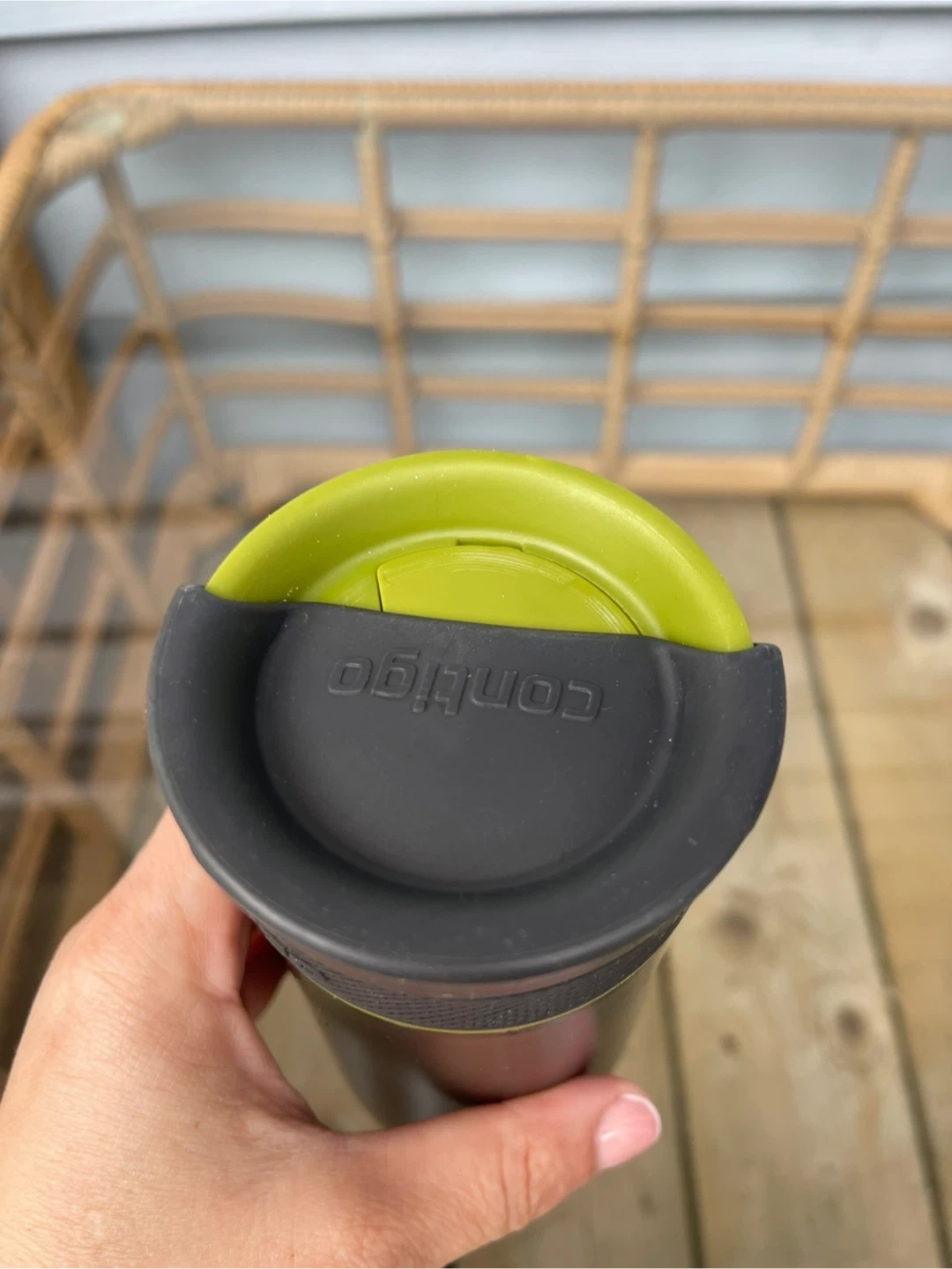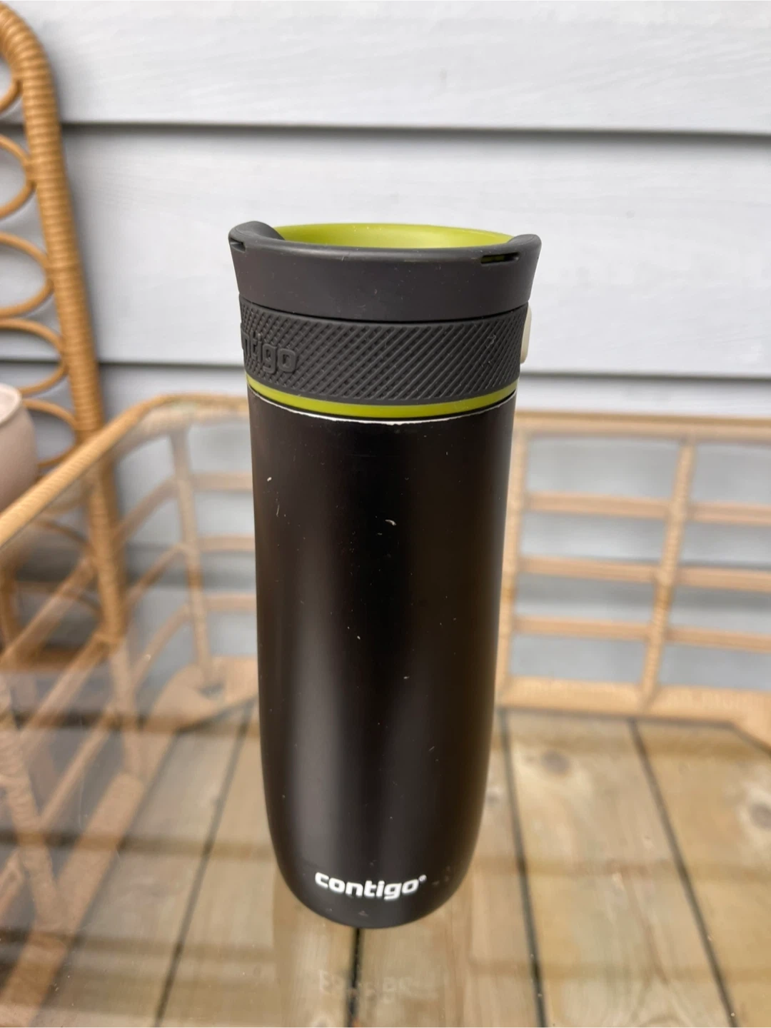 This is a Contigo travel mug in great condition! It's perfect for keeping your drinks hot or cold on the go. It features a black body with a green interior.