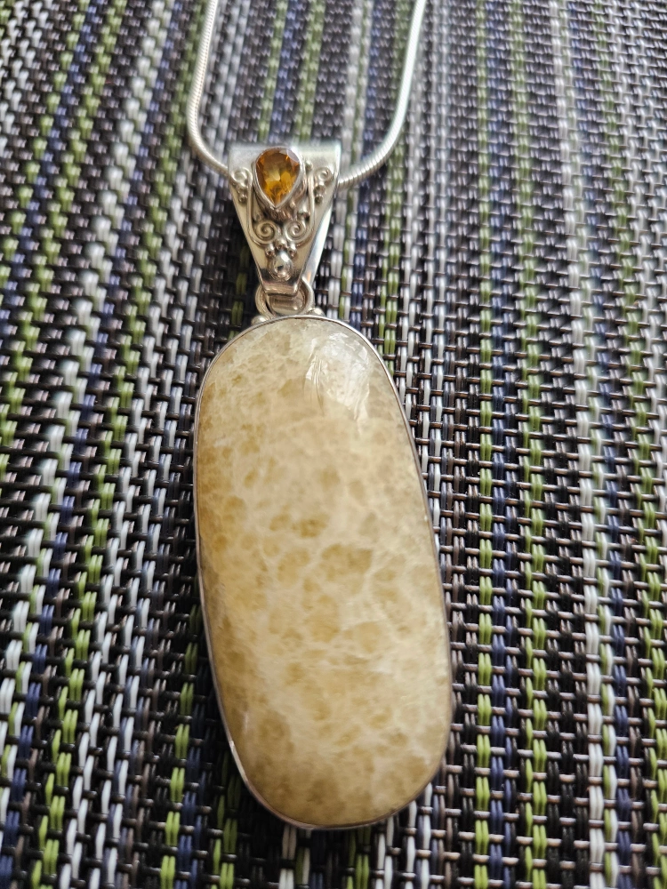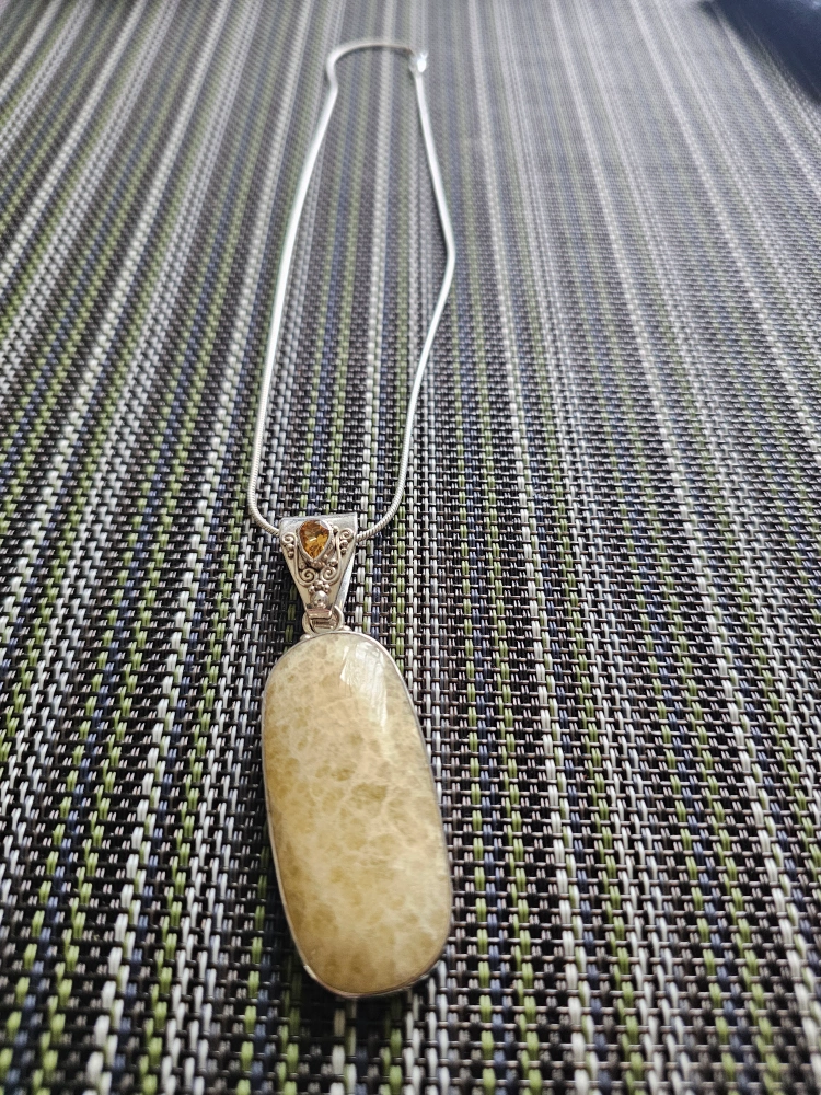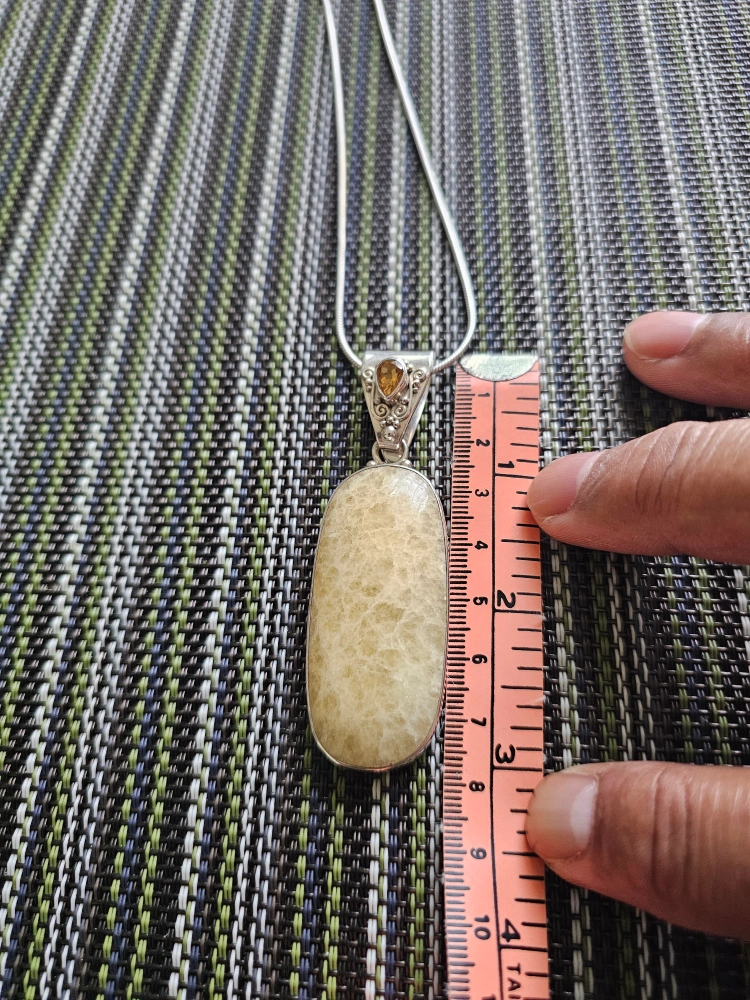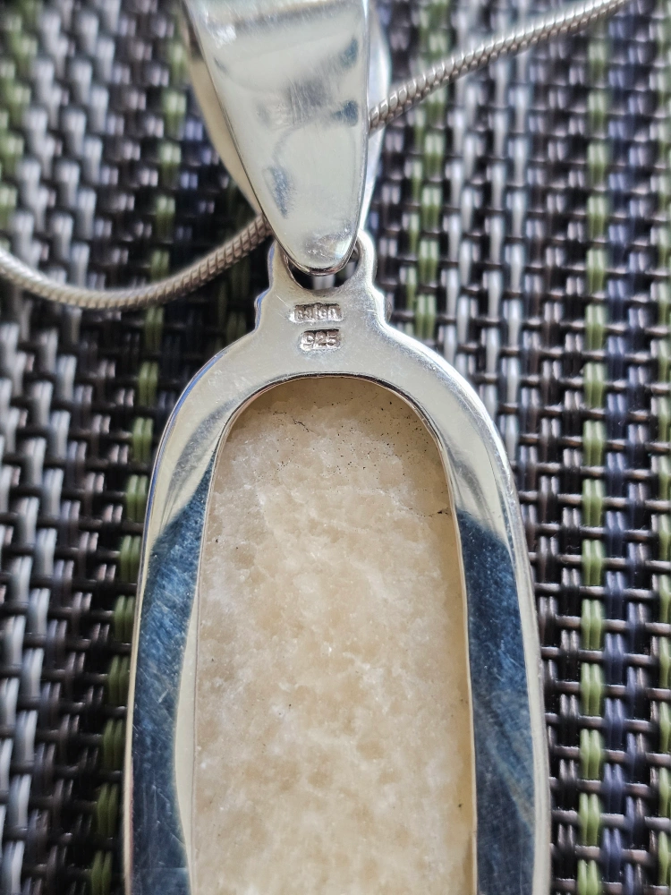 This is a lovely sterling silver necklace with a unique gemstone pendant. The pendant is approximately 2.5 inches long. The necklace is marked '925' indicating sterling silver.