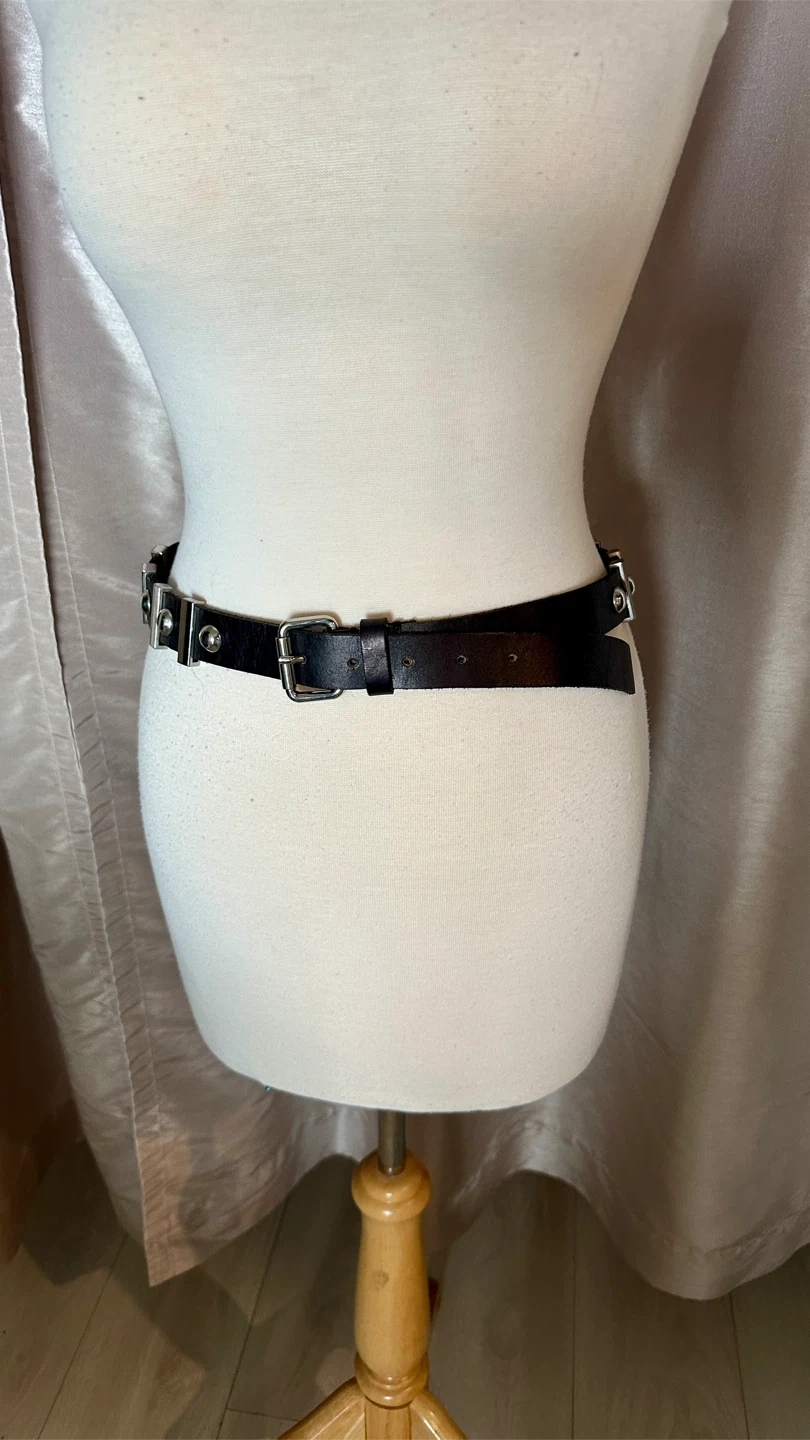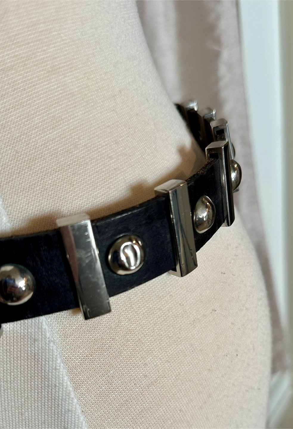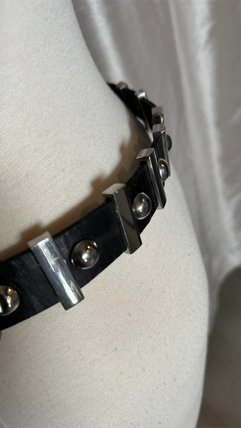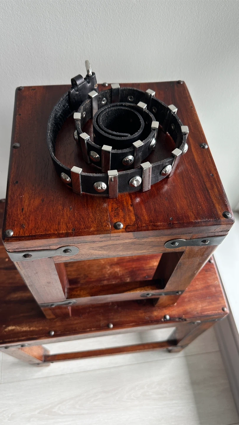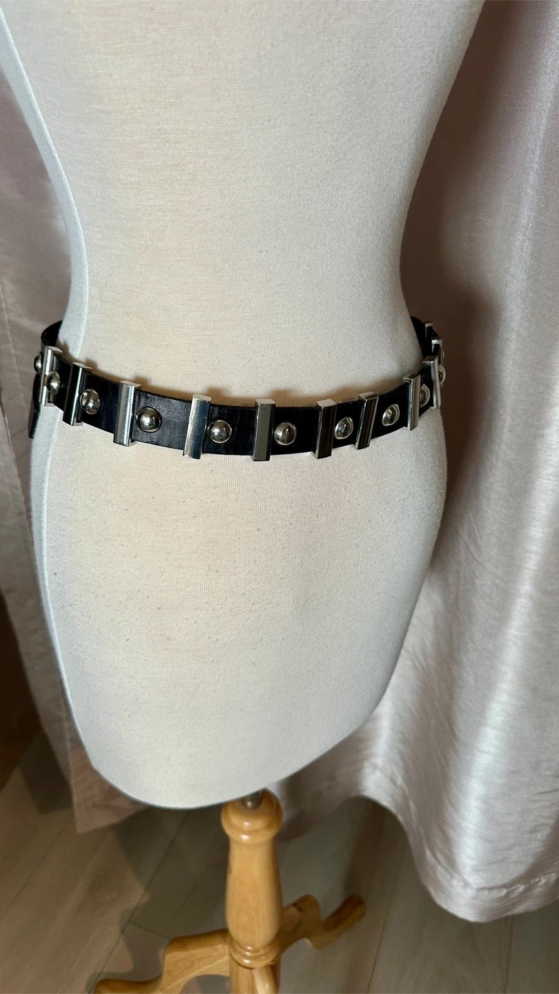 Selling a stylish black genuine leather belt featuring silver studs and rectangular accents. It's in great condition and ready to add some edge to your outfit! The belt is made of leather and has silver-toned metal hardware.