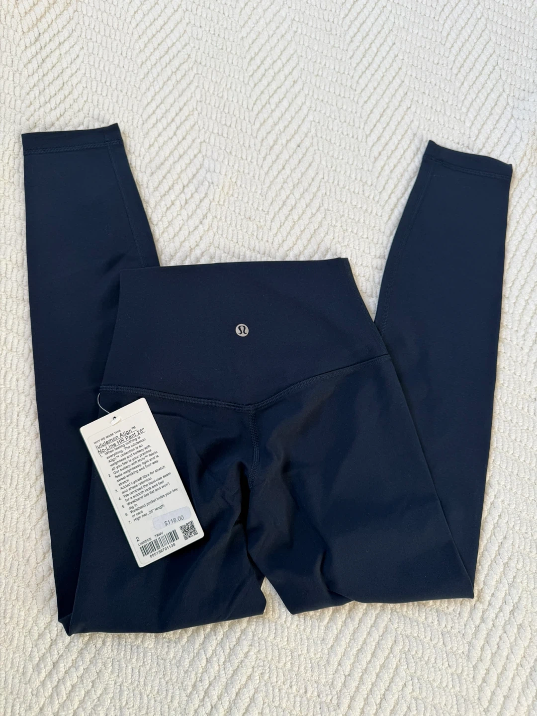 Selling a pair of Lululemon Align High-Rise Pants in a beautiful navy colour! They are a size 2 and have a 25" inseam. These pants are designed to be lightweight and comfortable, perfect for yoga or everyday wear. Originally bought for $118