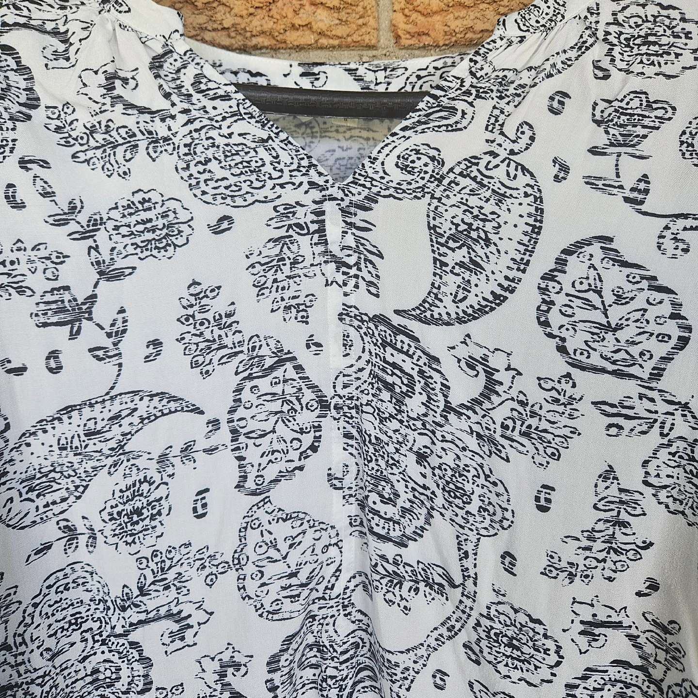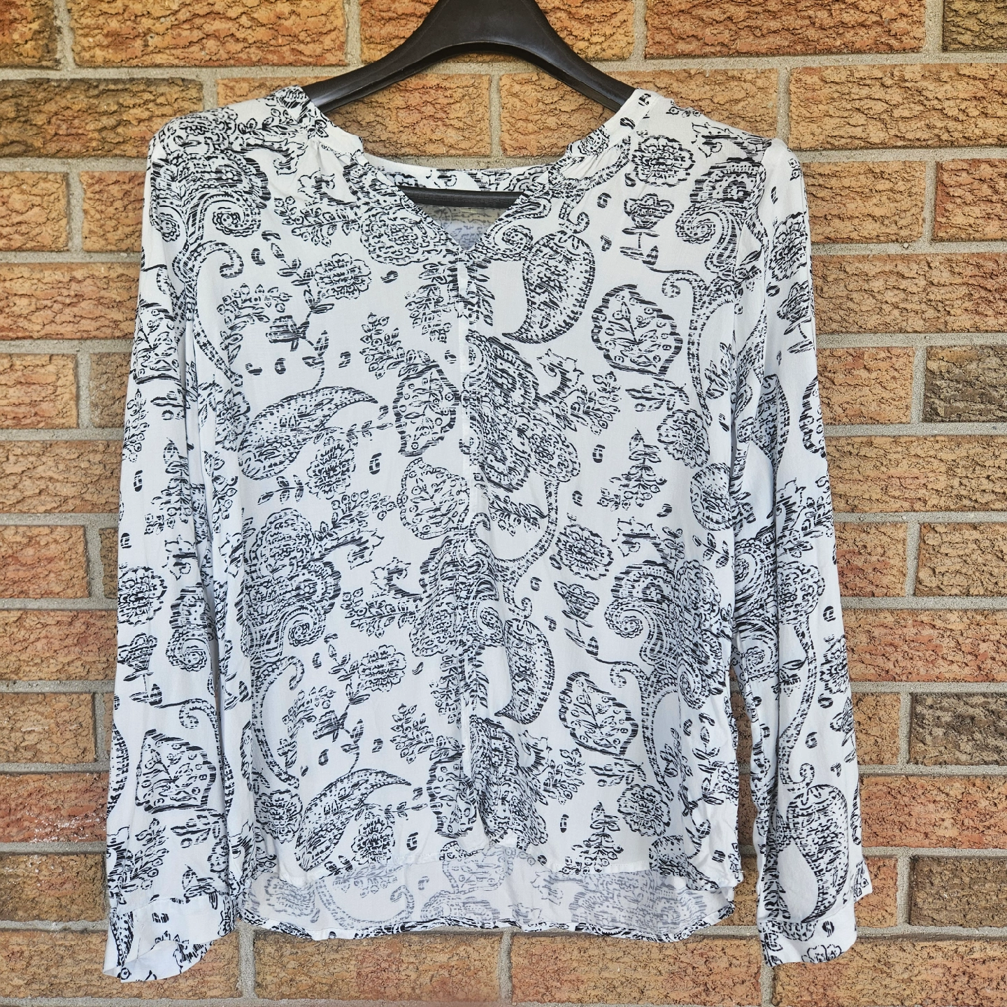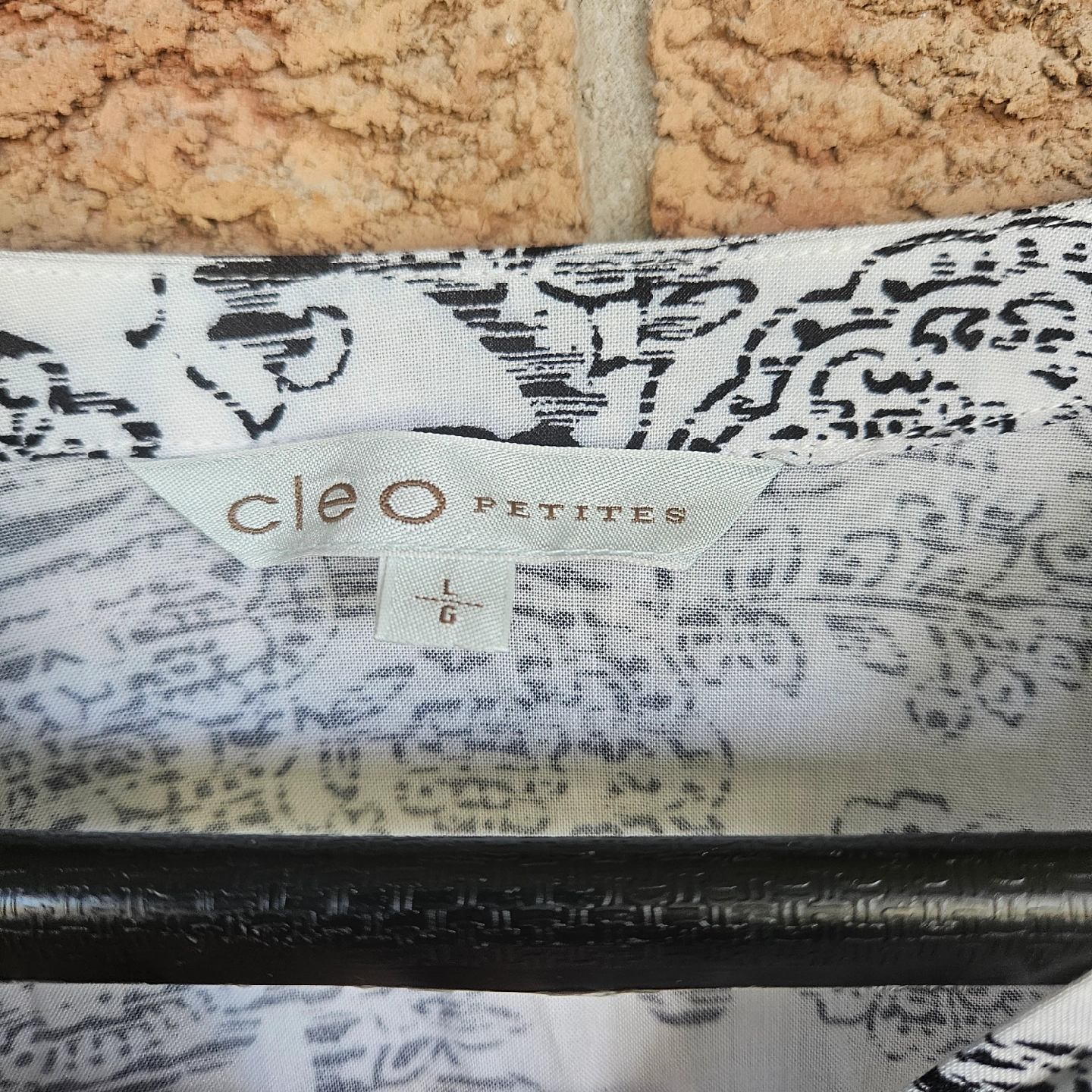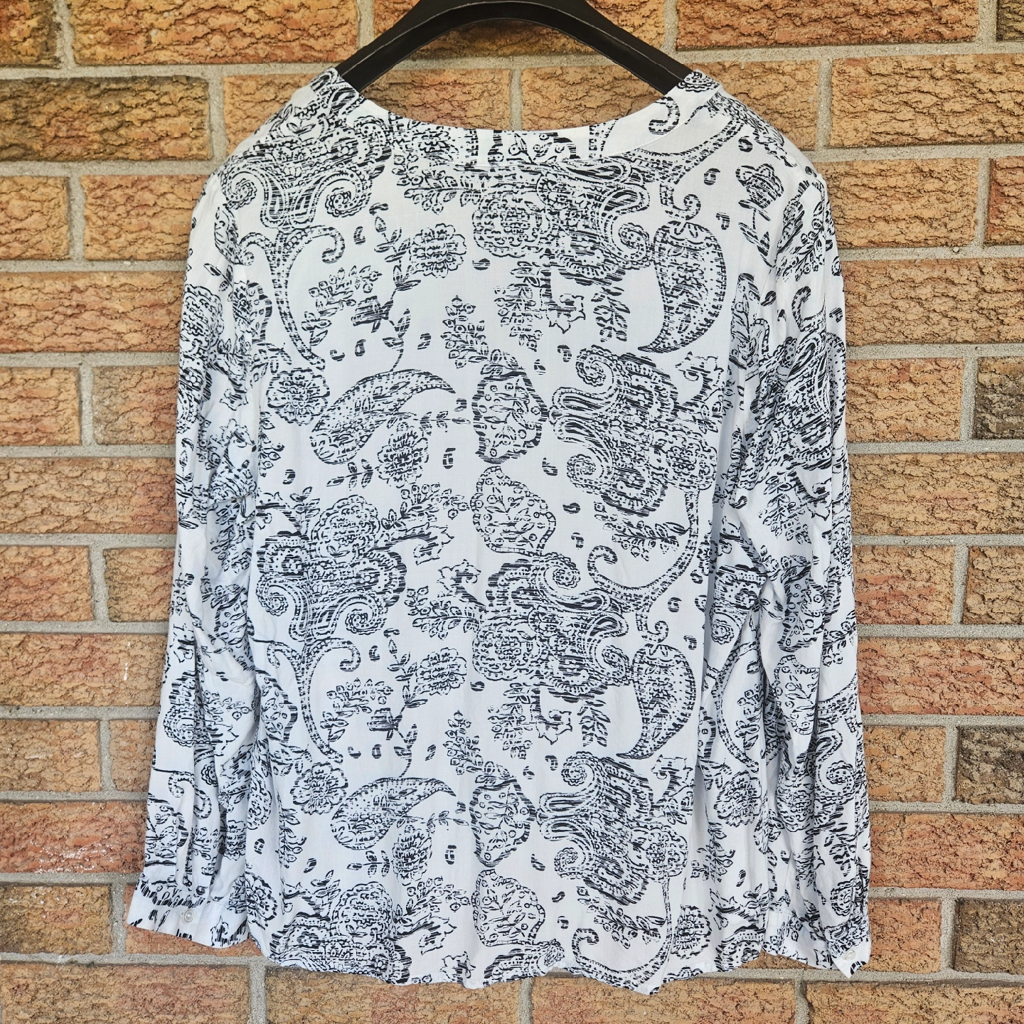 Cleo Petites Woman's size Large Length 24" Sleeve 23" Chest 21" Paisley print Long sleeve blouse Button closure at wrist 100% rayon Made in China