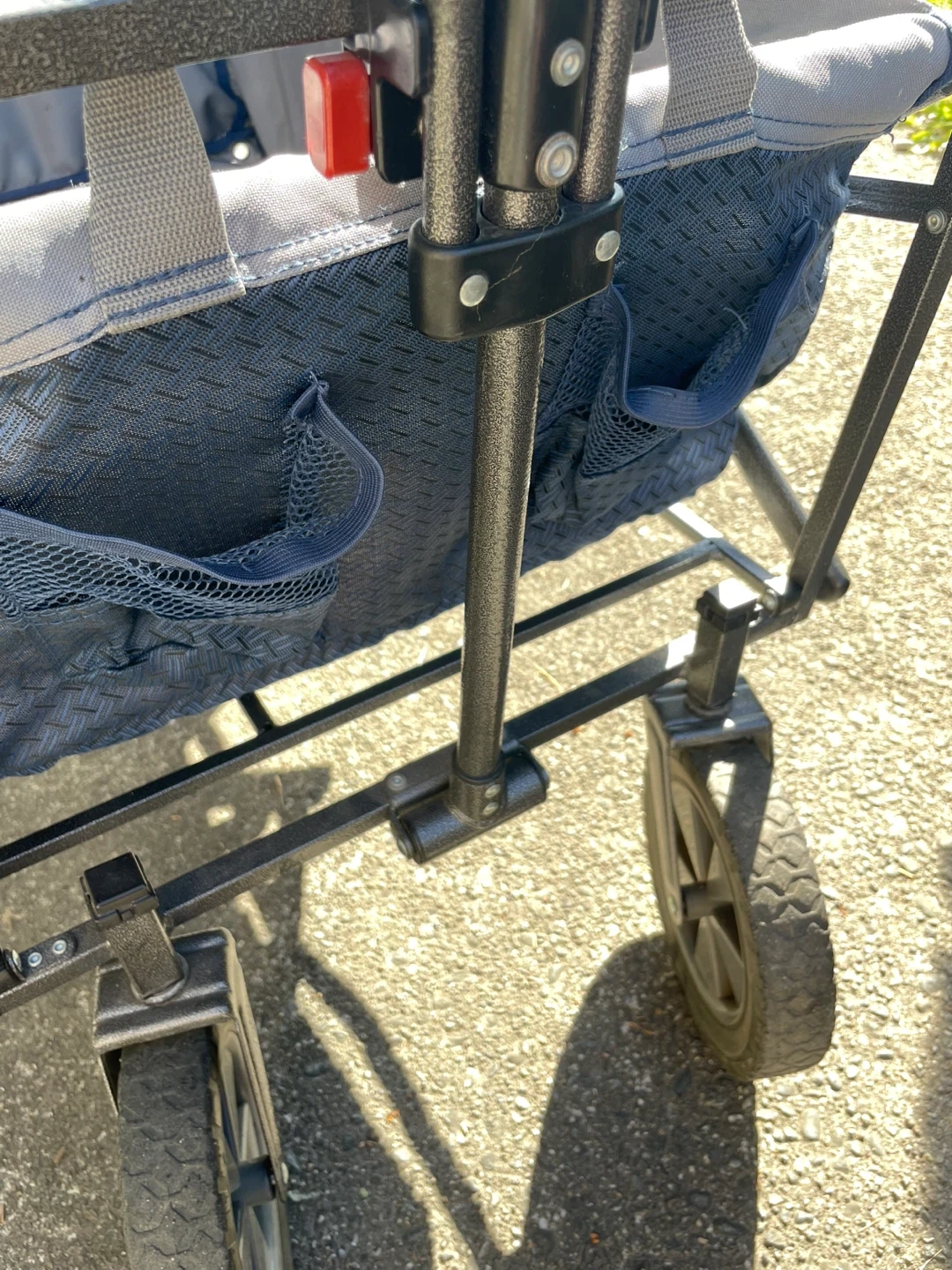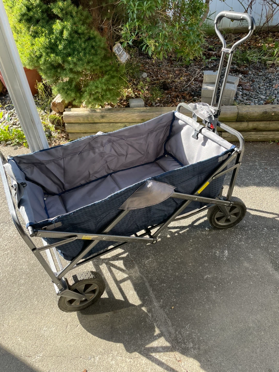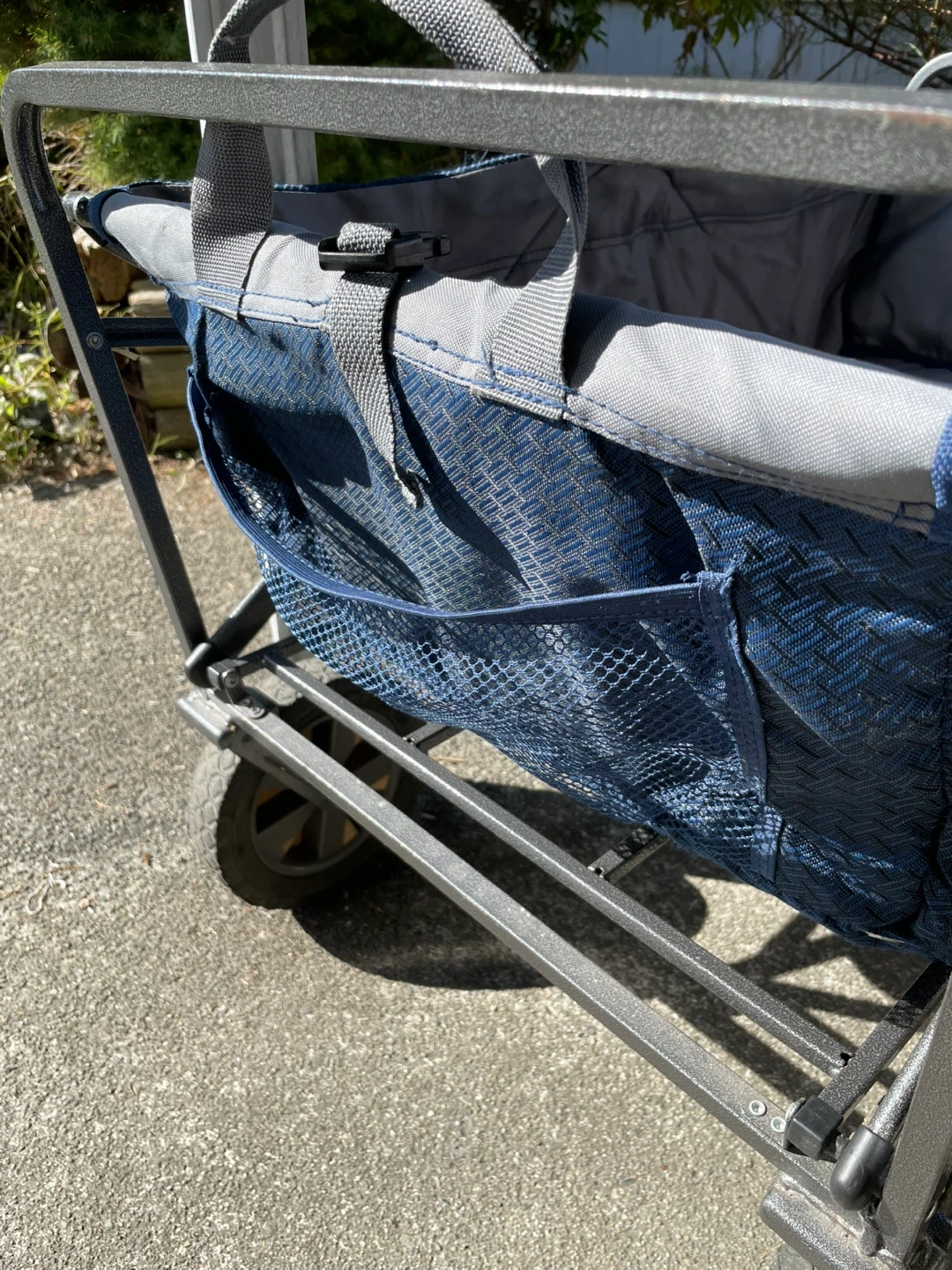 Selling a folding wagon cart in blue! It's super handy for carrying groceries, beach gear or sports gear or anything else you need to lug around. Folds up easily for storage and transport. Minor wear from use but purely cosmetic and no issues with the wheels or functionality.
