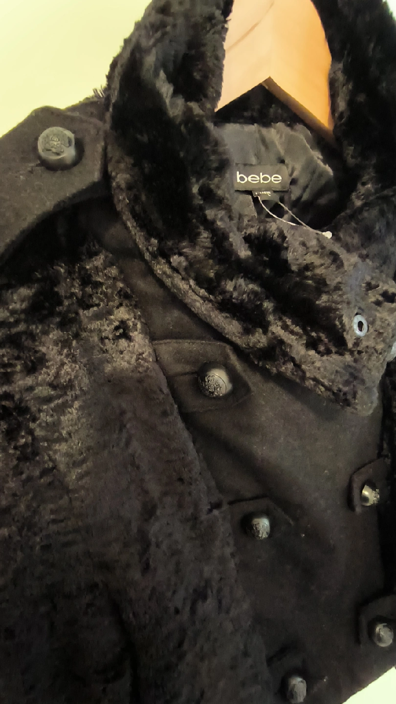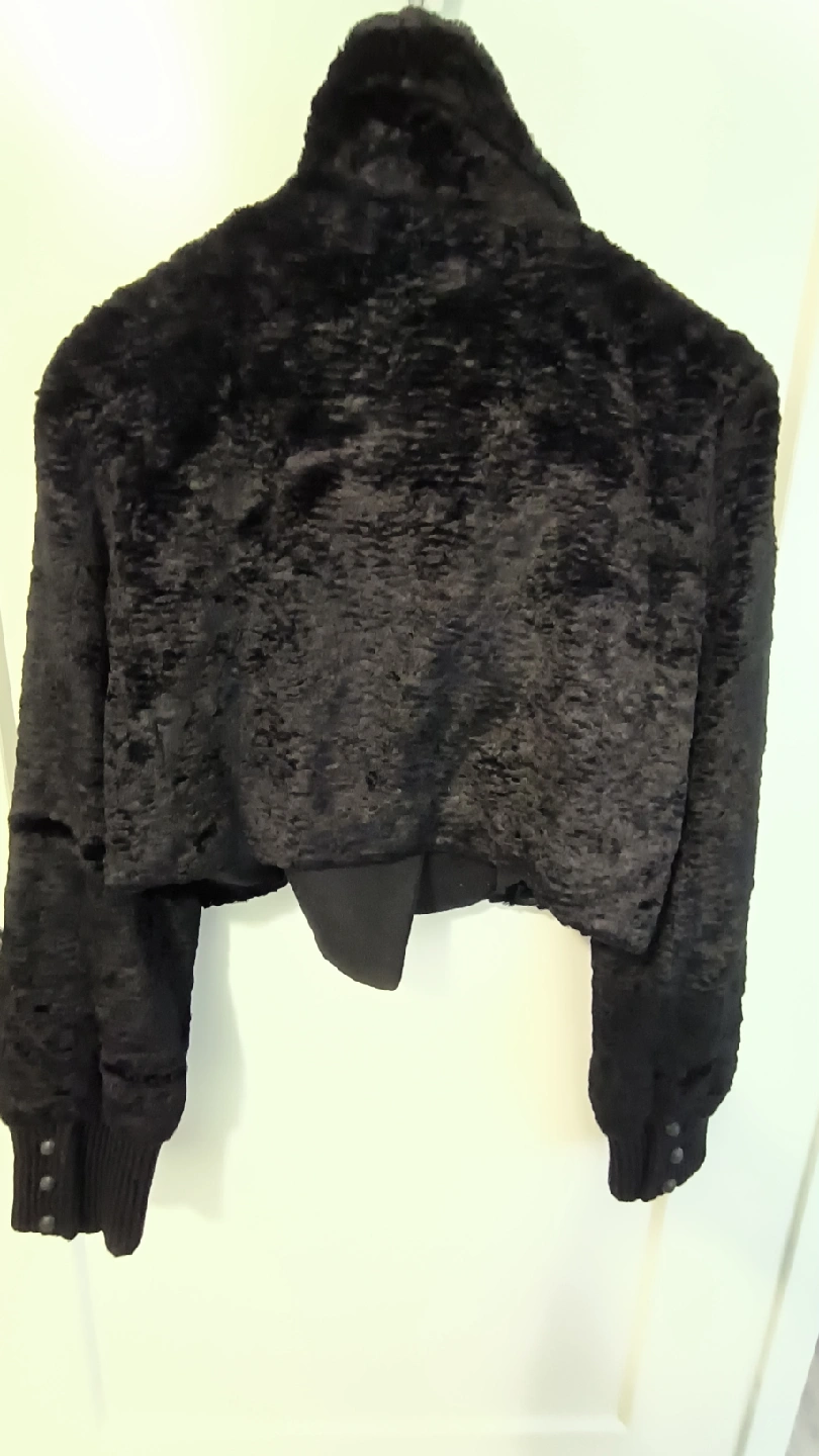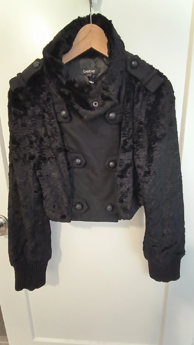 Here's a stylish Bebe jacket up for grabs! It's a black faux fur jacket in size L. The shell is a blend of viscose and cotton, while the lining is 100% polyester. Never worn. New condition. Pick up near Front St./Princess St. in Downtown Toronto.