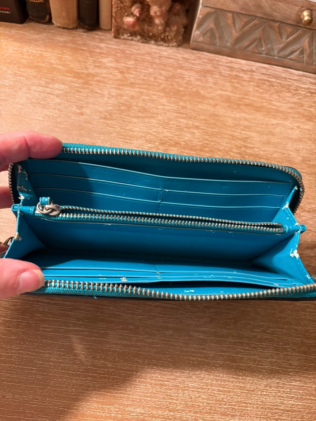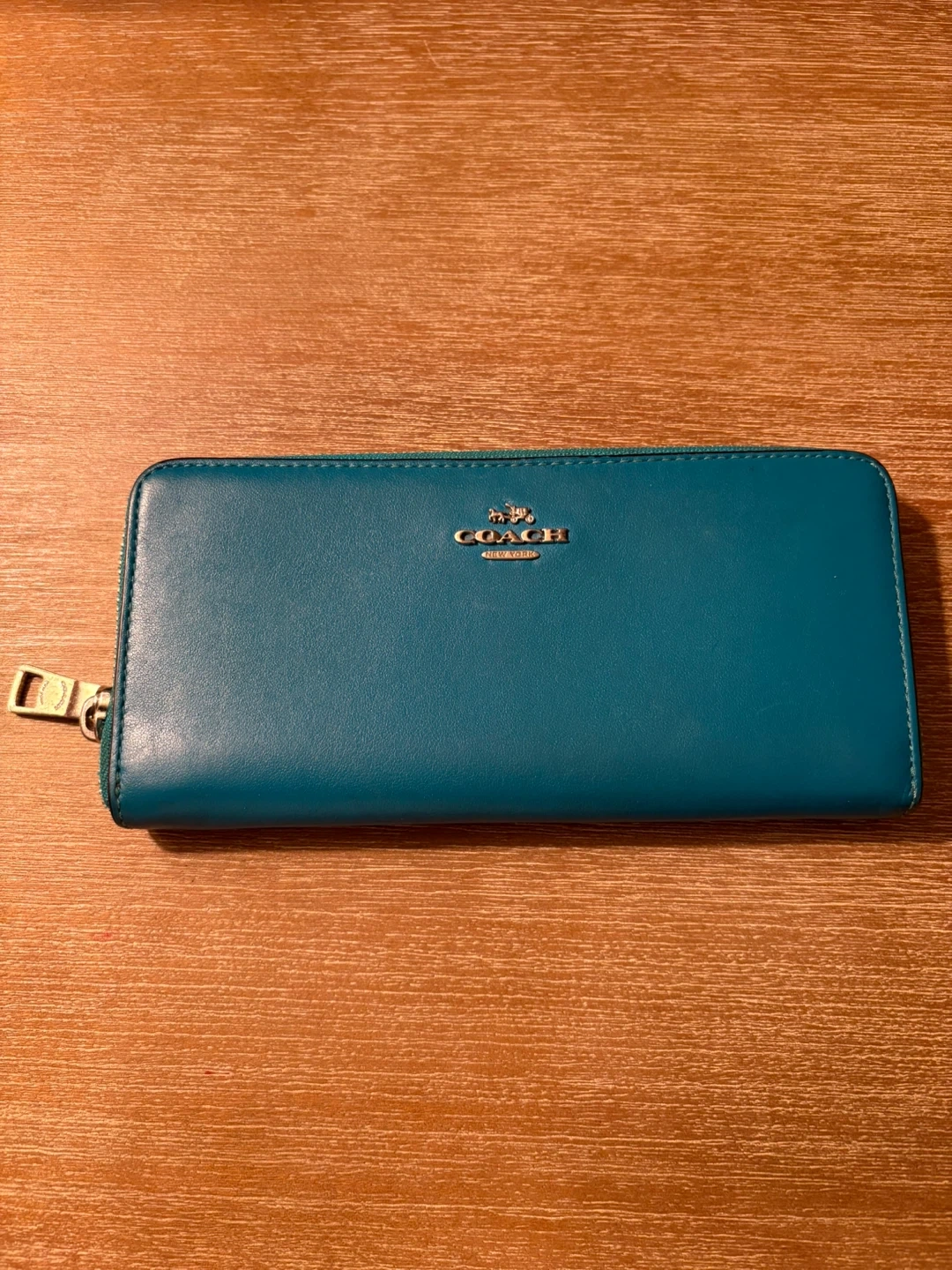 Selling a Coach zip around wallet in teal leather. It's in good condition and has lots of space for cards and cash. Some flaking inside but in good exterior condition. Perfect for everyday use!cash only