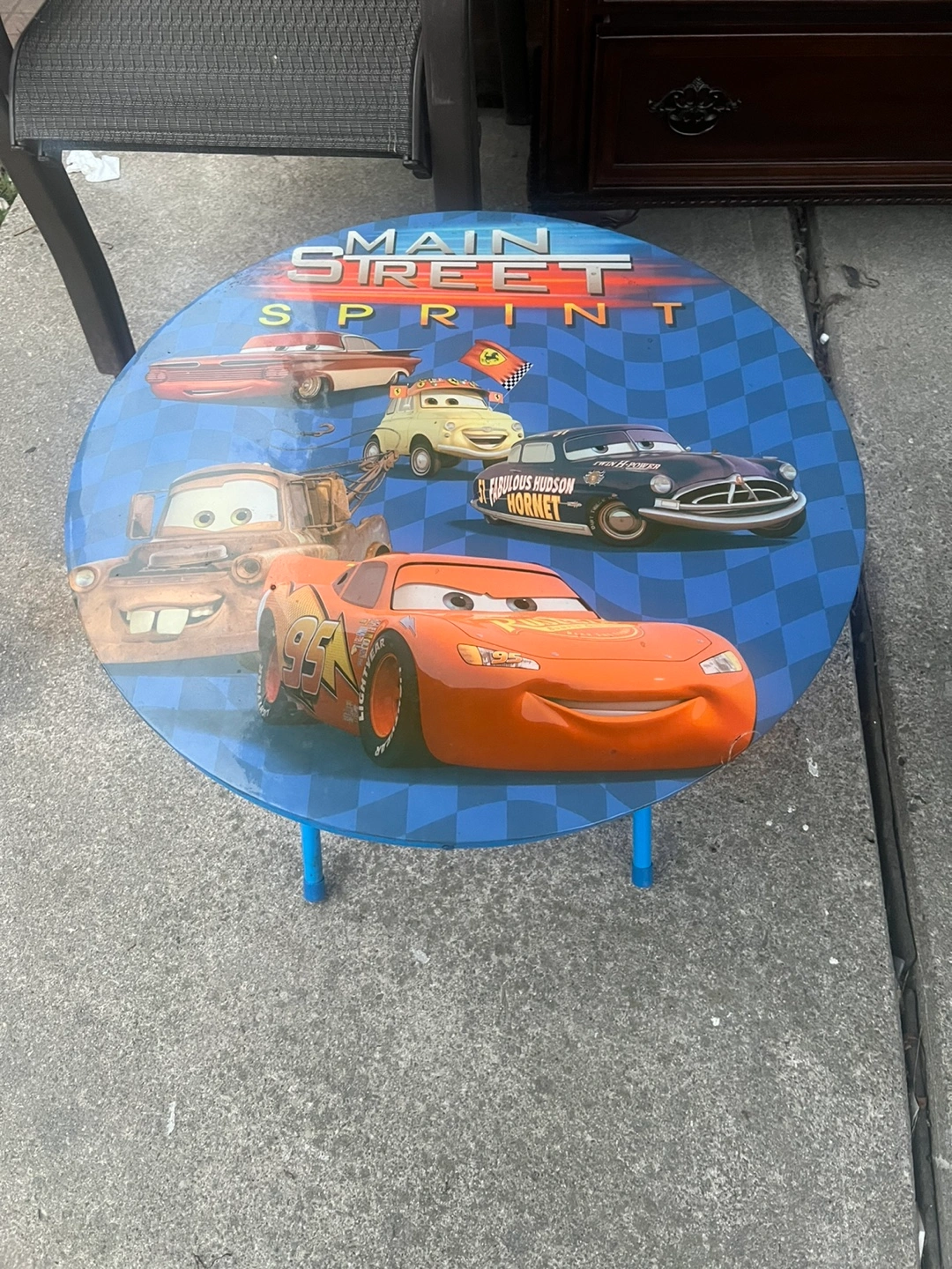 Selling a cute Cars themed kids table! It features Lightning McQueen and friends on a blue checkered background. Perfect for playtime or snack time!