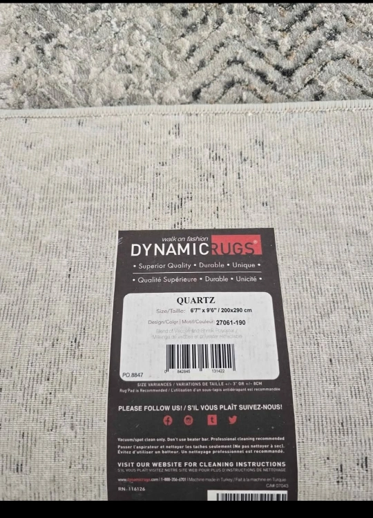 Selling a Dynamic Rugs Quartz area rug. It's in great condition and measures 6'7" x 9'8" (200x290 cm). The design/colour is motif/couleur 27061-190. Perfect for adding a touch of style to any room! $300. 00