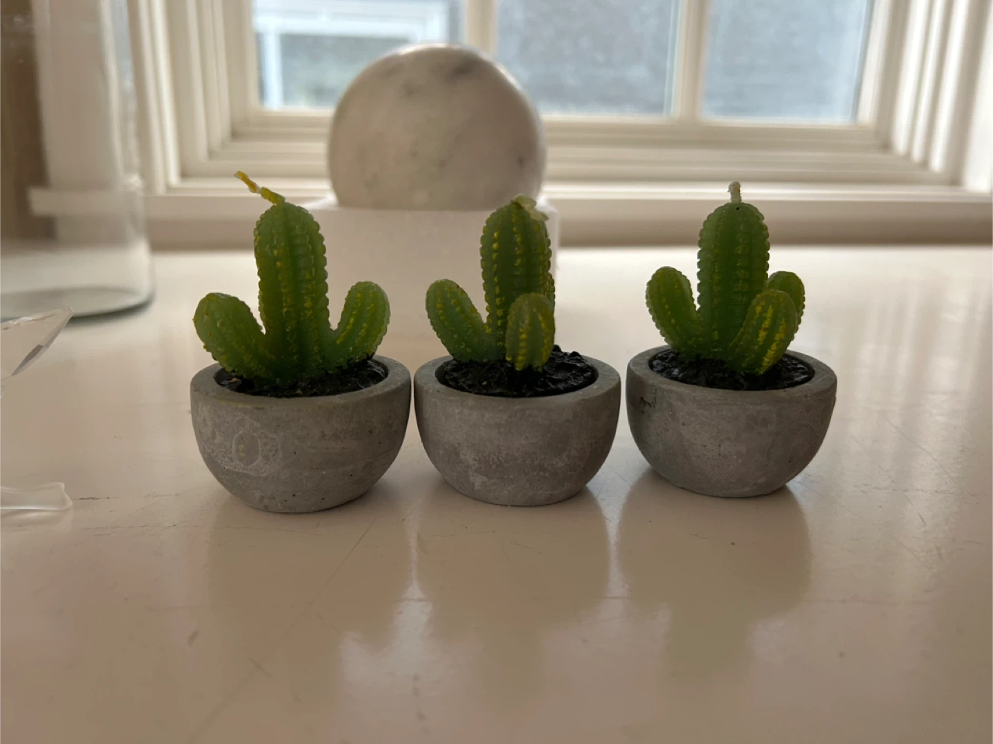 Selling a set of three adorable cactus candles in little grey pots! They'd be perfect for adding a touch of greenery to your space, or as a cute gift. Never been burned and are in excellent condition